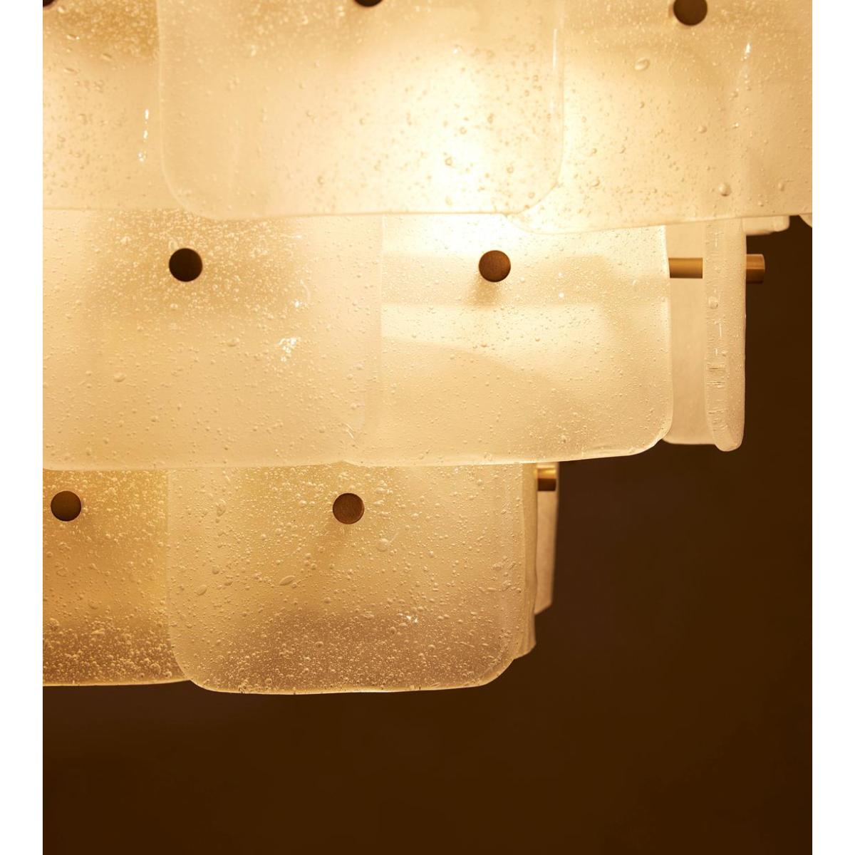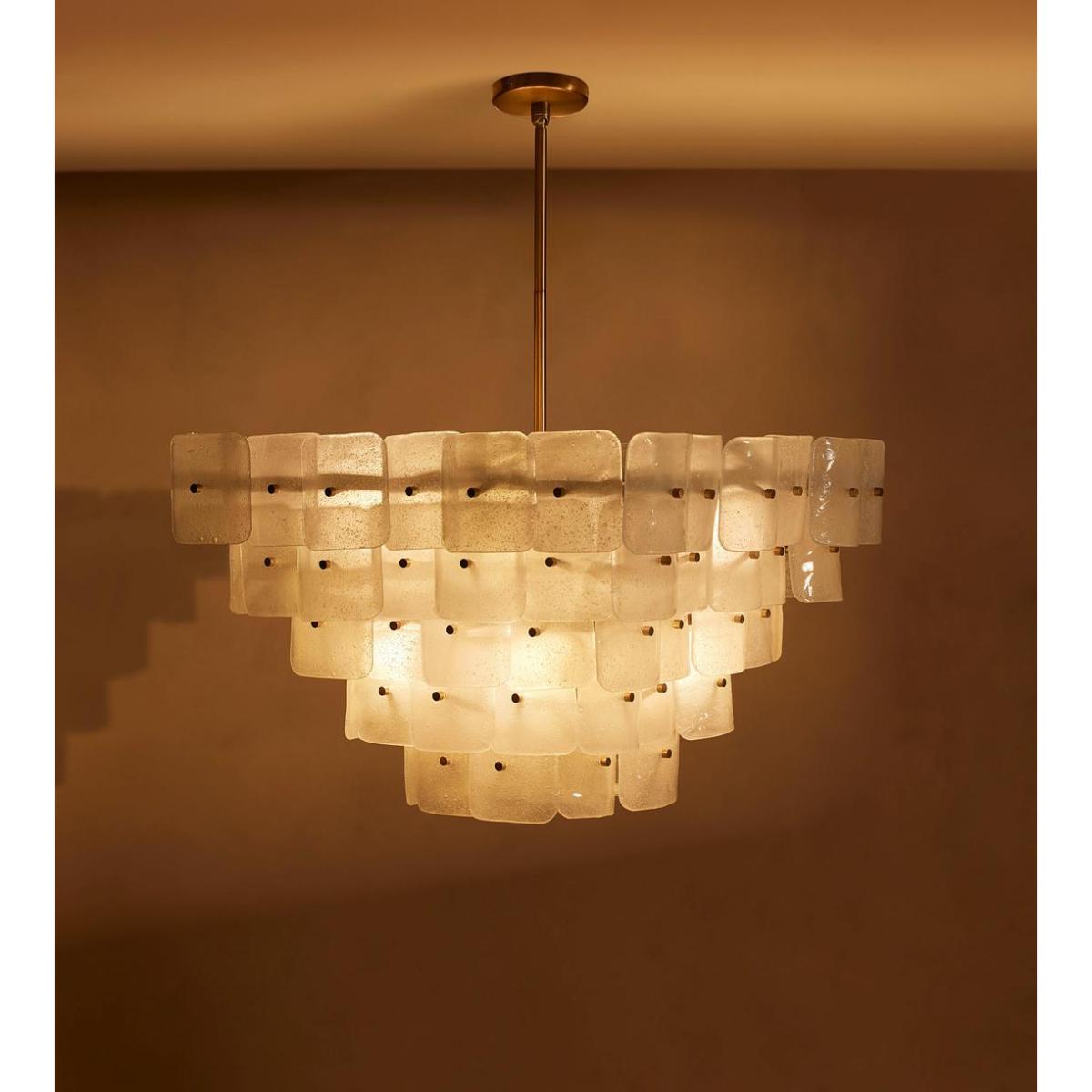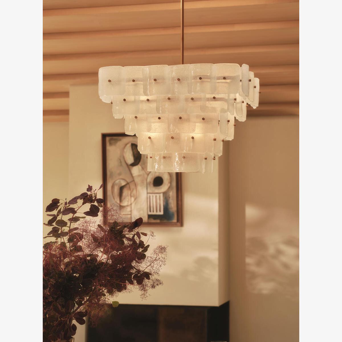Inspired by the tiered chandeliers seen in Soho House Barcelona, the Francis ceiling light is made by layering individual pieces of white-frosted bubbled glass. Suspended from an adjustable pole, the frame is plated with antiqued brass.