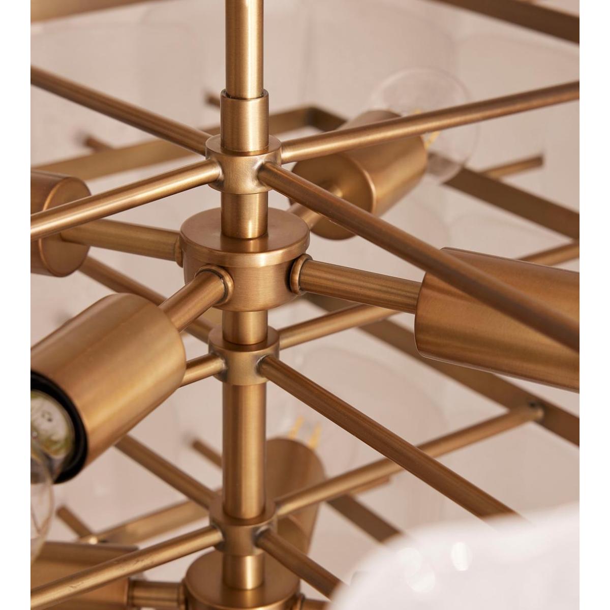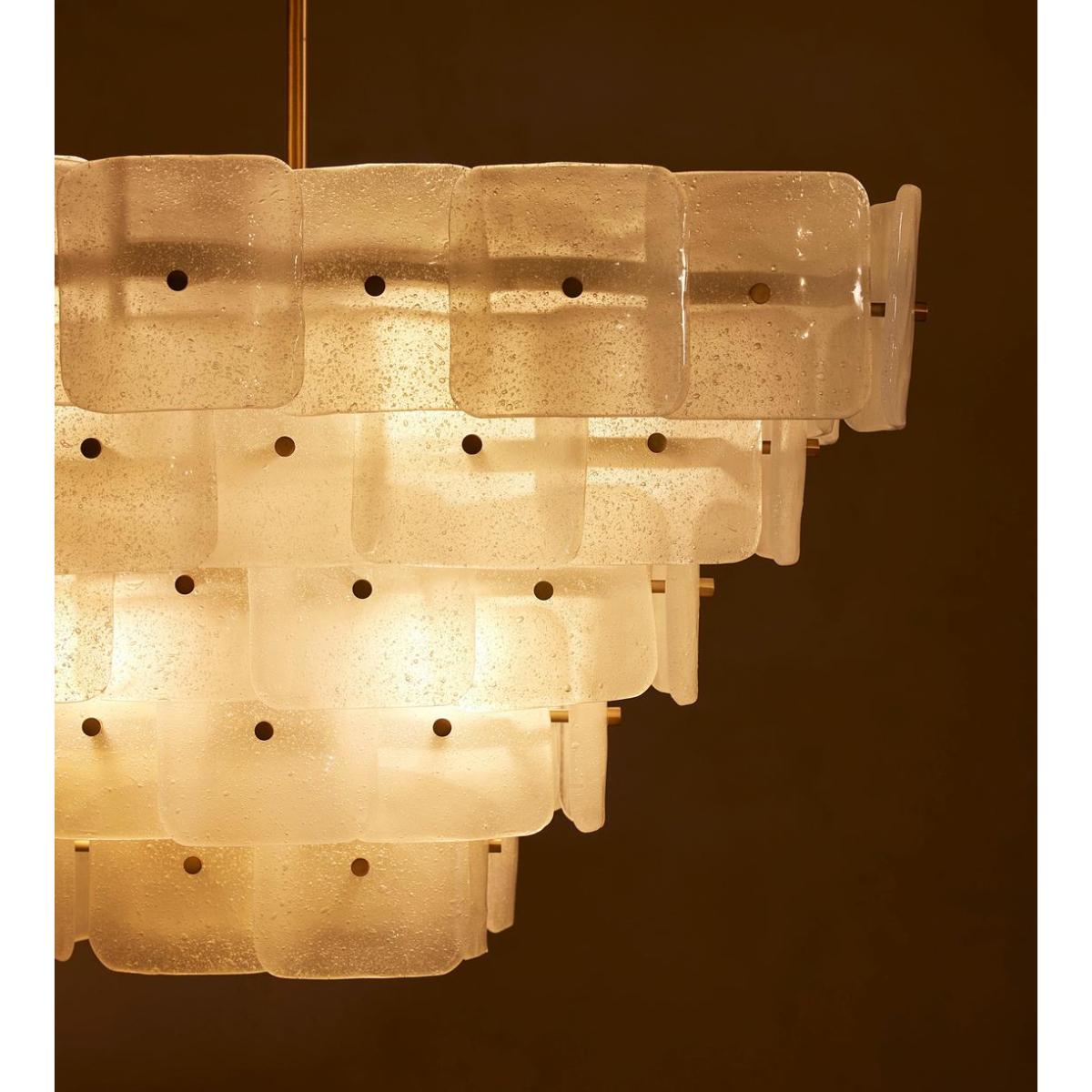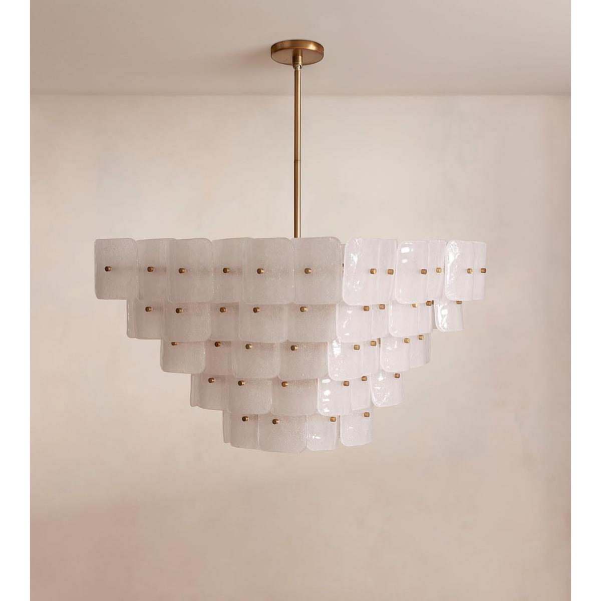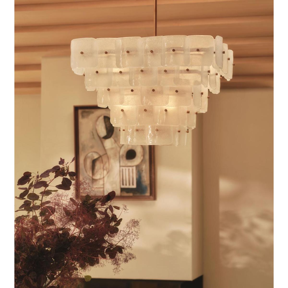 Inspired by the tiered chandeliers seen in Soho House Barcelona, the Francis ceiling light is made by layering individual pieces of white-frosted bubbled glass. Suspended from an adjustable pole, the frame is plated with antiqued brass.