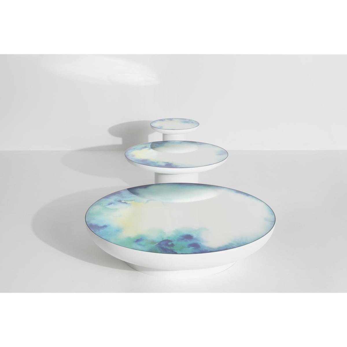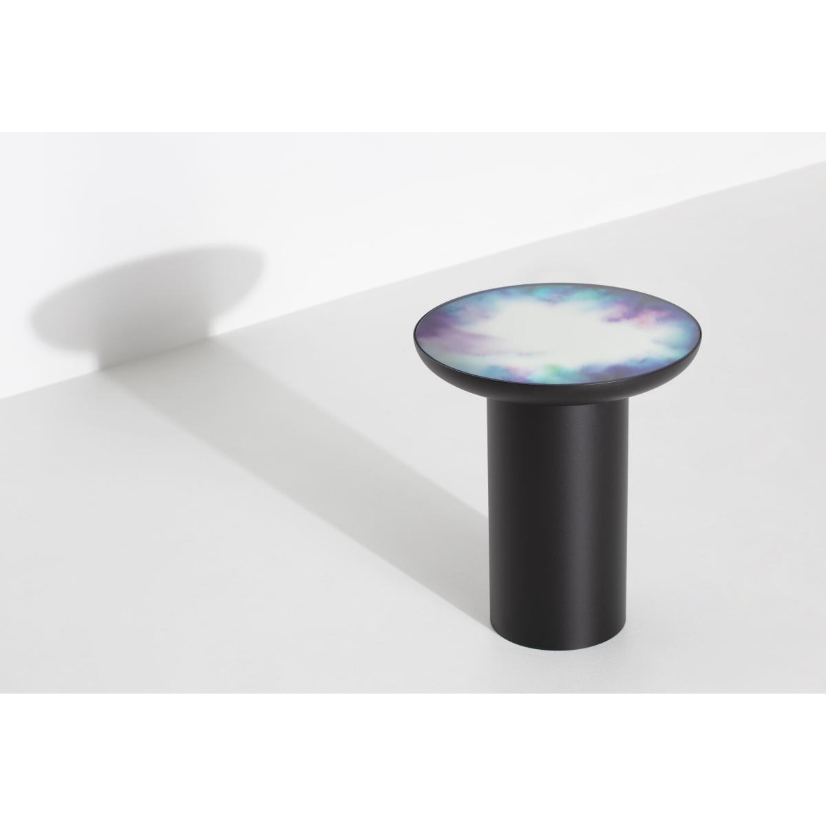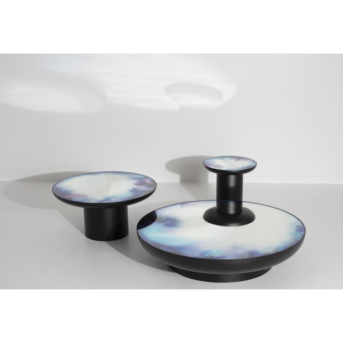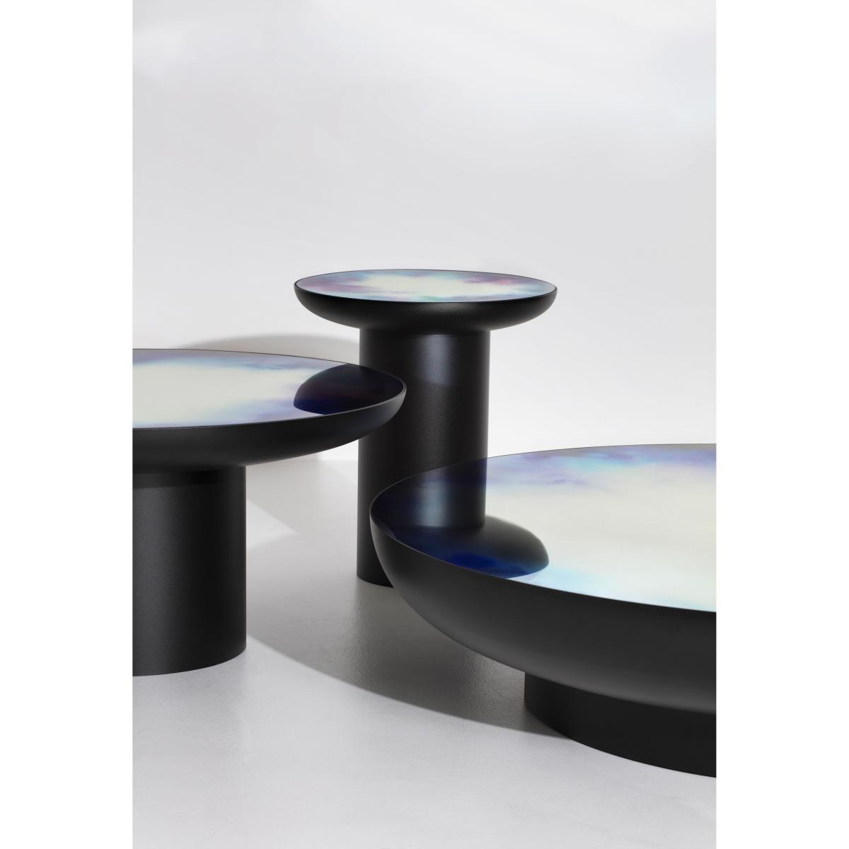 The Francis mirror table was born from the crossing of totemic forms with the iconic Francis wall mirror created by Constance Guisset in 2012 (awarded the Wallpaper Design Award). The Francis table offers a new look at the Francis mirror: placed horizontally, it reverses the logic of reflection and adds a surprising and poetic touch to your interior design. The Francis table was born from an experiment on pigments. The mirror top is subtly coloured with ''watercolour'' patterns evoking the fleeting vision of colours flowing from the brush in contact with water. The result is a strange illusion reminiscent of the oxidation of old mirrors, reviewed in a light interpretation tinged with modernity. The watercolours are printed in the bottom of the mirror using a lamination technique that gives the product incredible visual depth. French designer Constance Guisset has hand-painted the watercolours by playing around with two series of shades. The watercolours were then digitally worked to amplify the play of colour transparency, strengthen or soften the movement of pigments and thus give rise to unique watercolour patterns. Then, the watercolours printed on the mirror were captured in a glass lamination bringing depth to the eye and strength to these functional tables. In order to bring power and balance to the Francis table, the mirror anchored within the coloured vapours of the watercolours is inserted in a large, solid metal shell. The Francis coffee table comes in 3 sizes that can dress your living room separately or together. Their different heights mean you can create an interplay between them in a harmonious whole. Constance Guisset: ''I set out to create light, animated objects whose elegant fluidity gives rise to astonishment and escape through dreams. '' French designer Constance Guisset has won numerous awards such as the Grand Prix du Design from the City of Paris in 2008, the Public Design Award at the Villa Noailles Design Parade in 2009, the Designer of the Year Award at Salon Maison et Objet and the Audi Talents Awards in 2010.