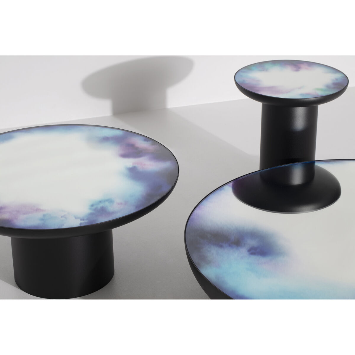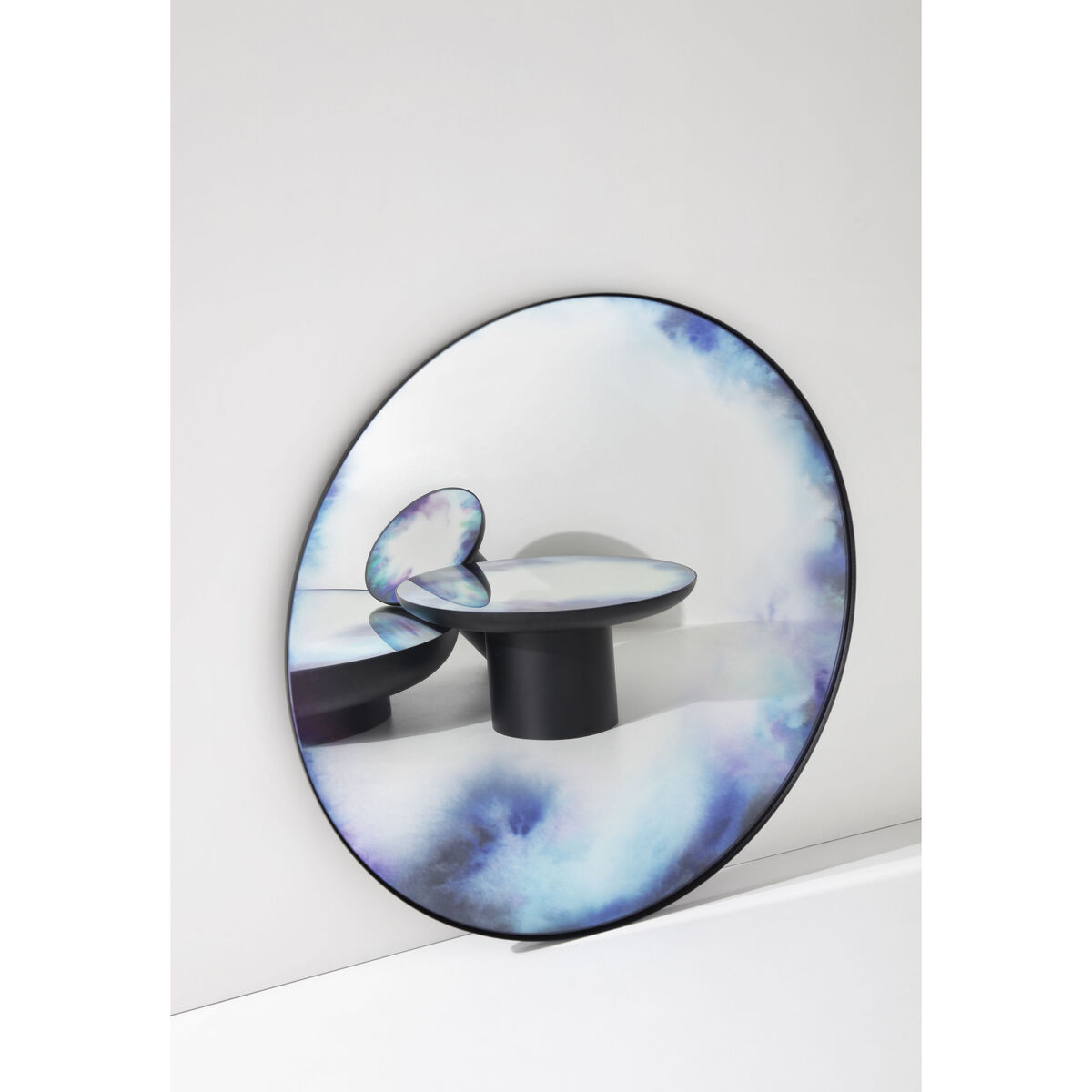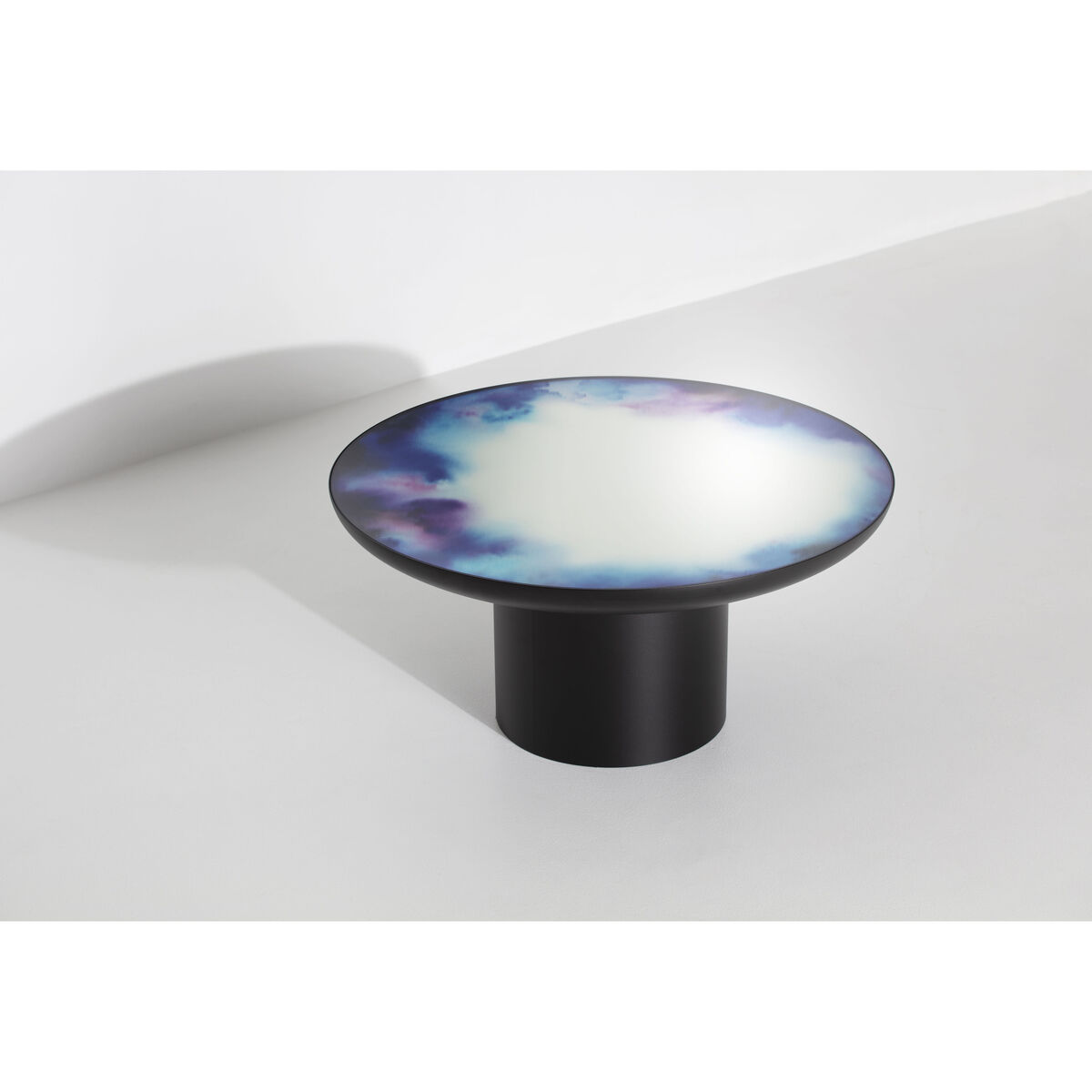 The Francis mirror table was born from the crossing of totemic forms with the iconic Francis wall mirror created by Constance Guisset in 2012 (awarded the Wallpaper Design Award). The Francis table offers a new look at the Francis mirror: placed horizontally, it reverses the logic of reflection and adds a surprising and poetic touch to your interior design. The Francis table was born from an experiment on pigments. The mirror top is subtly coloured with ''watercolour'' patterns evoking the fleeting vision of colours flowing from the brush in contact with water. The result is a strange illusion reminiscent of the oxidation of old mirrors, reviewed in a light interpretation tinged with modernity. The watercolours are printed in the bottom of the mirror using a lamination technique that gives the product incredible visual depth. French designer Constance Guisset has hand-painted the watercolours by playing around with two series of shades. The watercolours were then digitally worked to amplify the play of colour transparency, strengthen or soften the movement of pigments and thus give rise to unique watercolour patterns. Then, the watercolours printed on the mirror were captured in a glass lamination bringing depth to the eye and strength to these functional tables. In order to bring power and balance to the Francis table, the mirror anchored within the coloured vapours of the watercolours is inserted in a large, solid metal shell. The Francis coffee table comes in 3 sizes that can dress your living room separately or together. Their different heights mean you can create an interplay between them in a harmonious whole. Constance Guisset: ''I set out to create light, animated objects whose elegant fluidity gives rise to astonishment and escape through dreams. '' French designer Constance Guisset has won numerous awards such as the Grand Prix du Design from the City of Paris in 2008, the Public Design Award at the Villa Noailles Design Parade in 2009, the Designer of the Year Award at Salon Maison et Objet and the Audi Talents Awards in 2010.