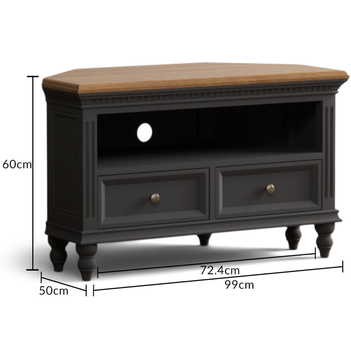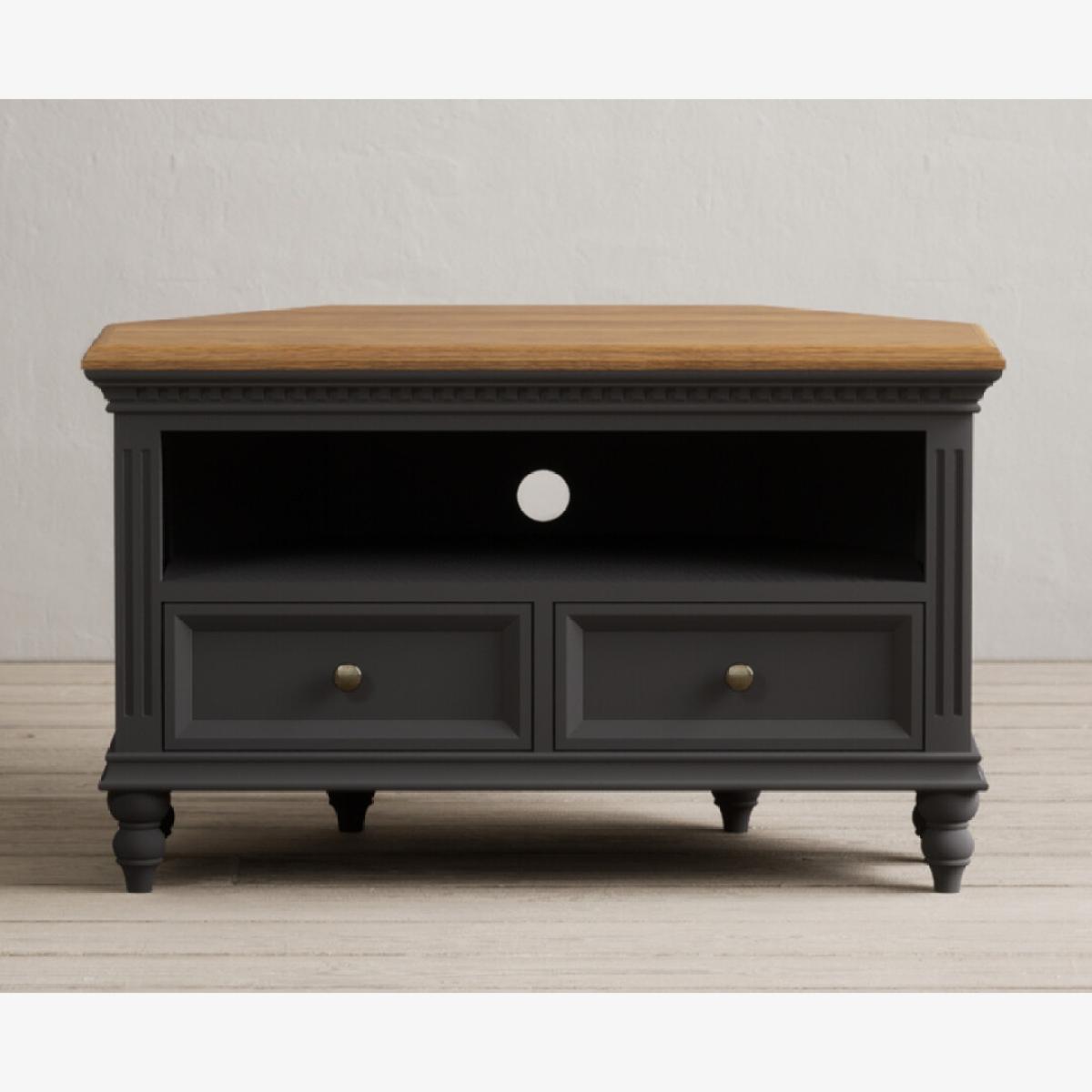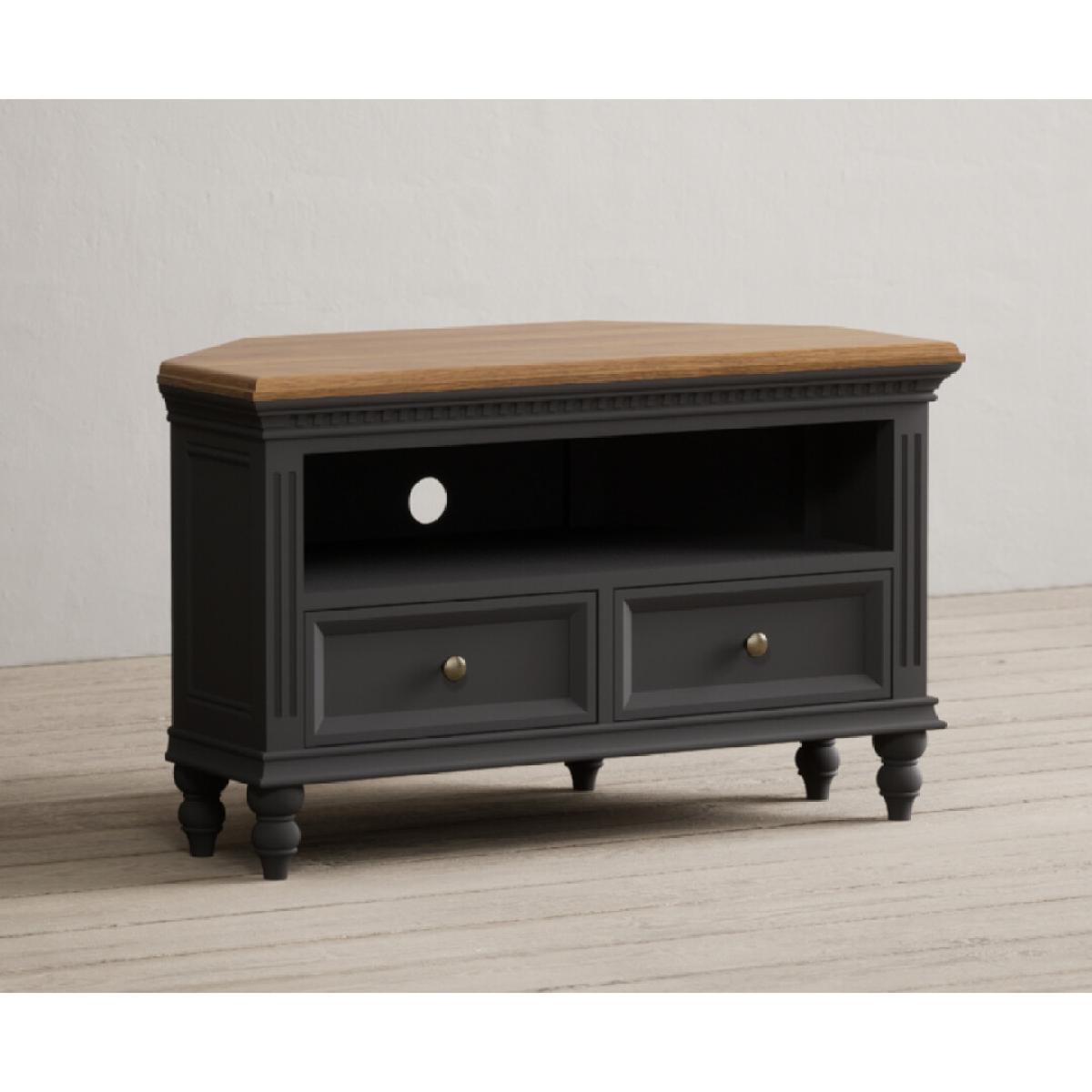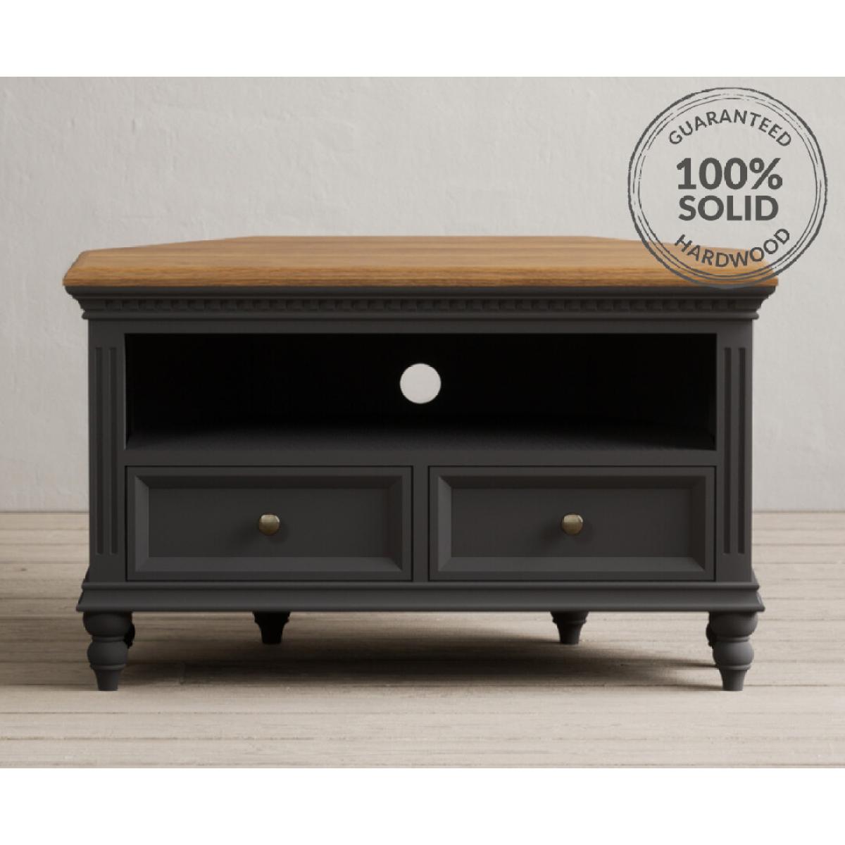 The Francis Oak and Charcoal Grey Painted Corner TV Cabinet is crafted from grey painted solid hardwood and topped with whitewashed solid oak, with two Dovetail drawers and a cable management hole.