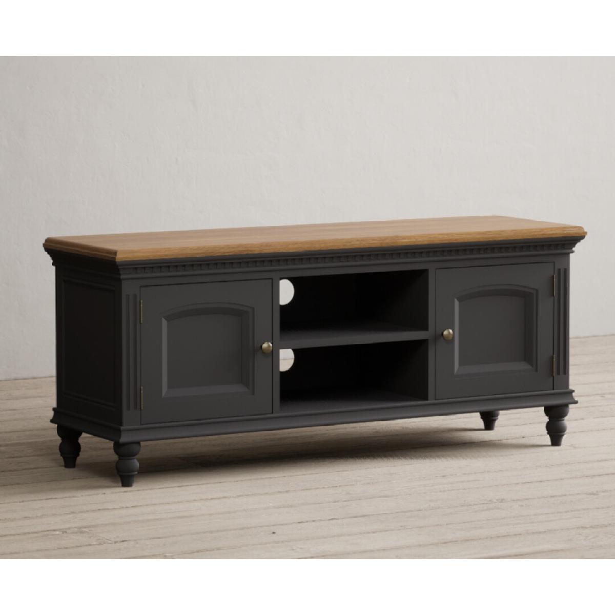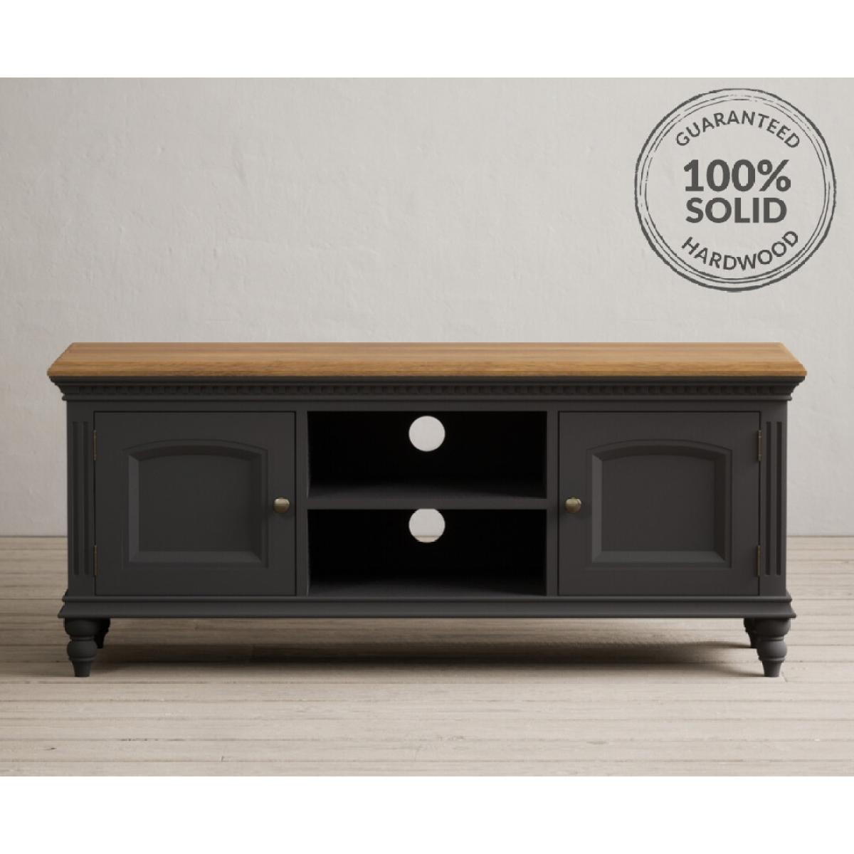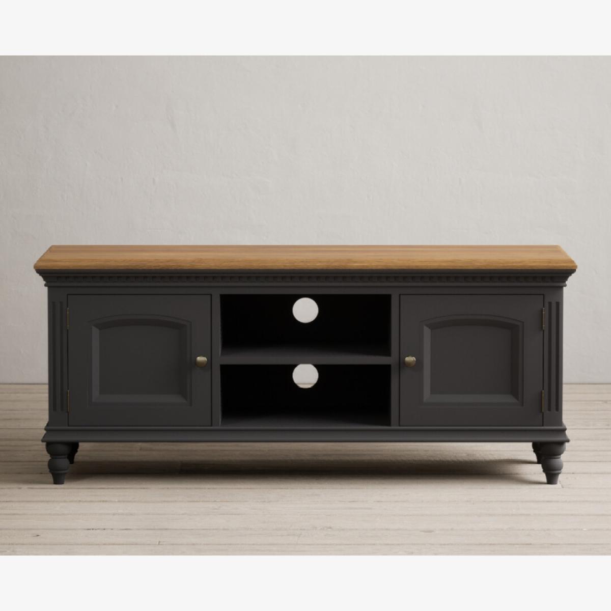 The Francis Oak and Charcoal Grey Painted Large TV Cabinet is crafted from solid hardwood with a charcoal grey painted finish and topped with whitewashed 100% solid oak, with two cable holes, a central shelf and two side cupboards.
