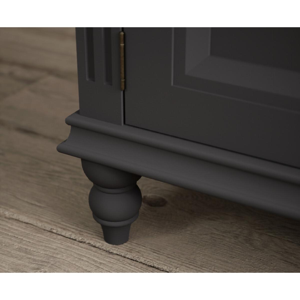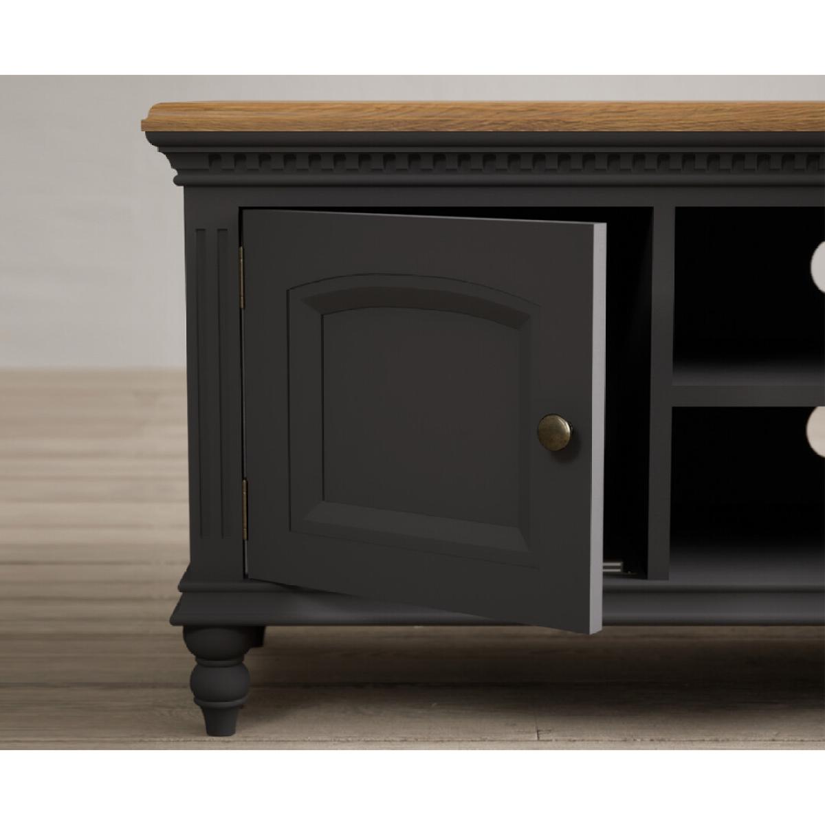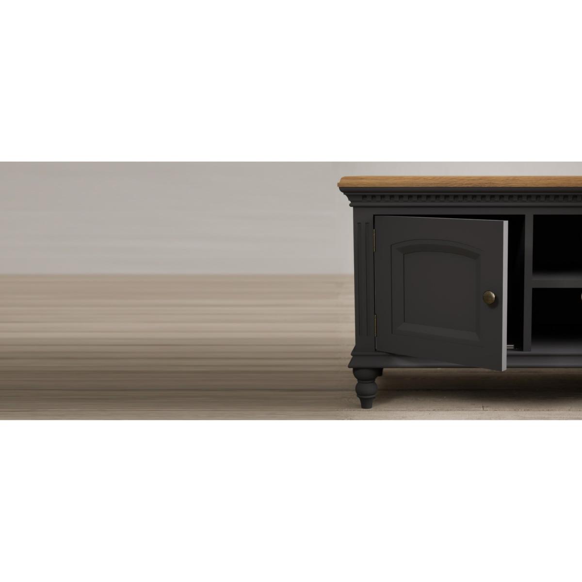 The Francis Oak and Charcoal Grey Painted Large TV Cabinet is crafted from solid hardwood with a charcoal grey painted finish and topped with whitewashed 100% solid oak, with two cable holes, a central shelf and two side cupboards.