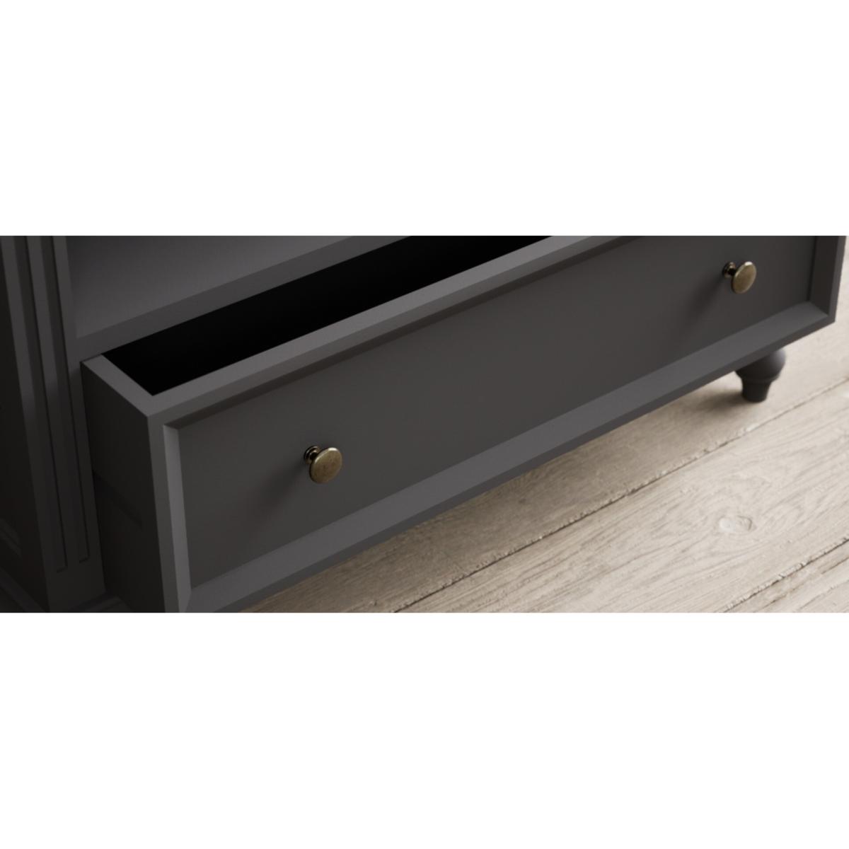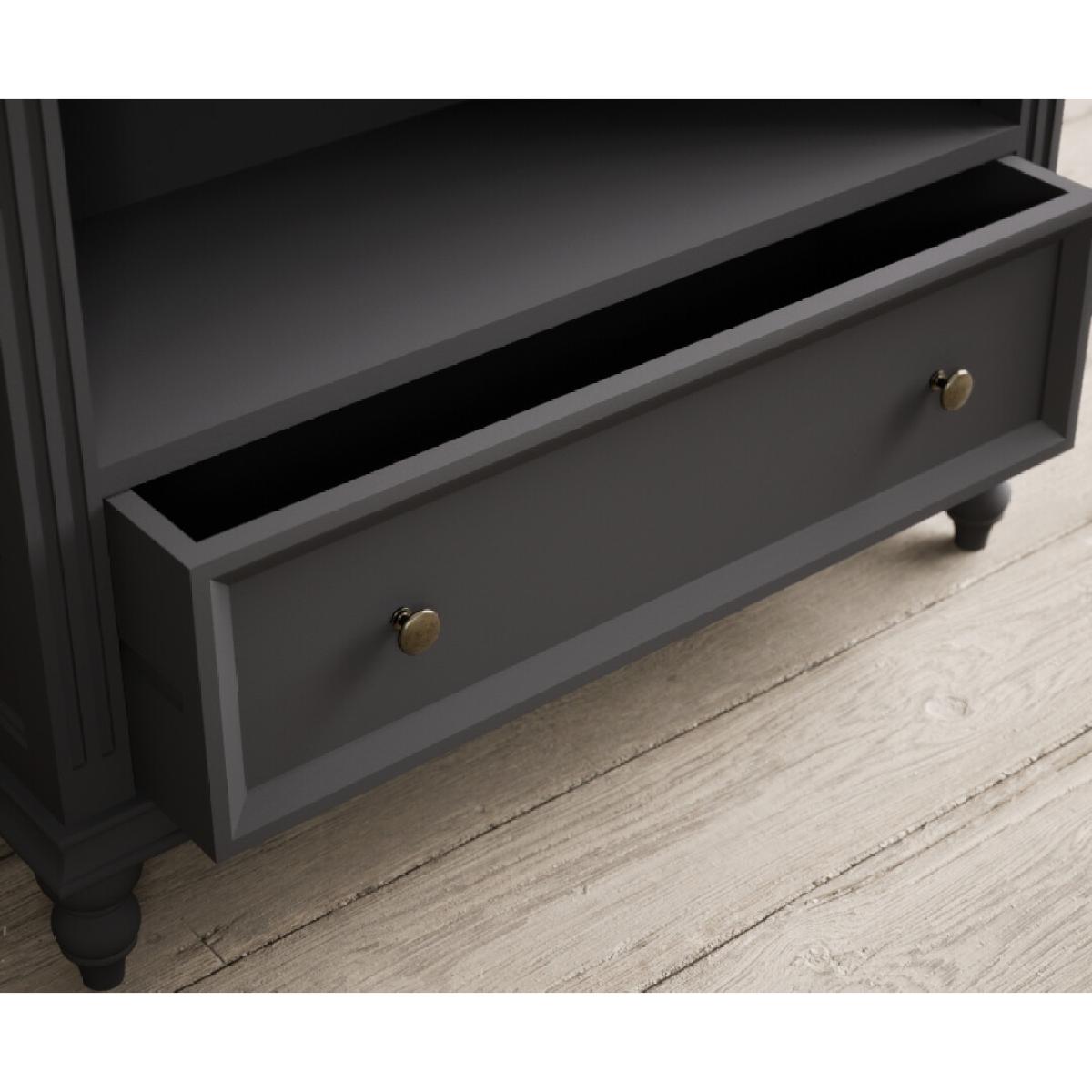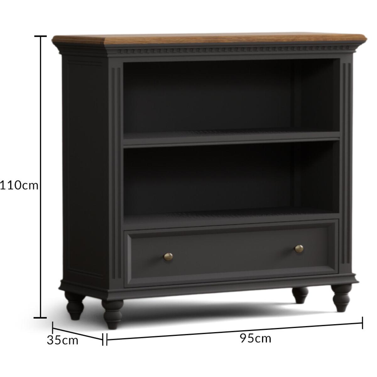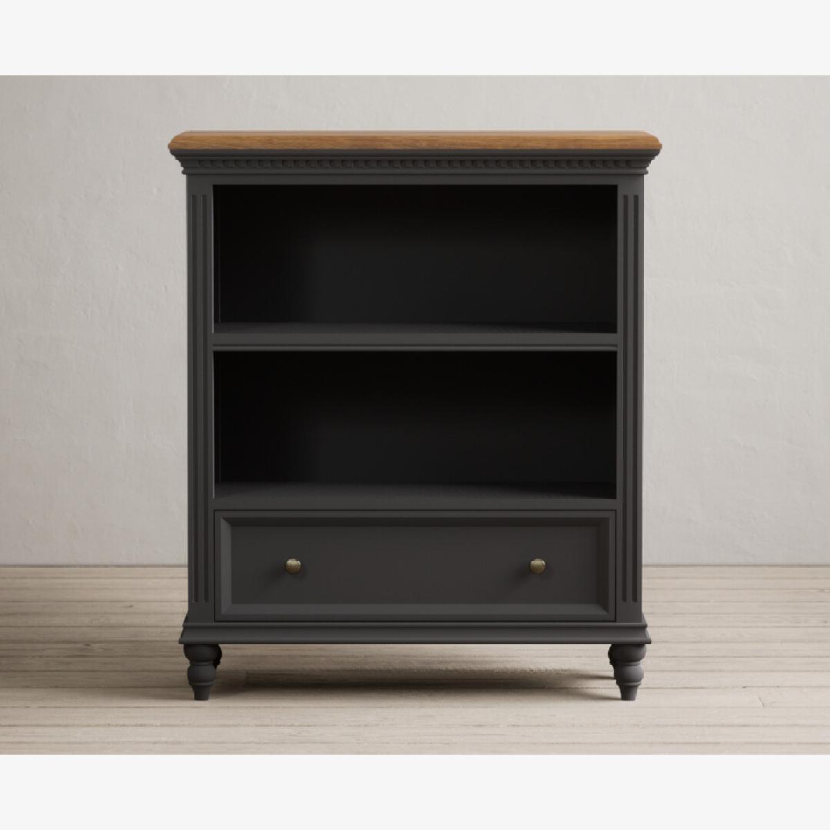 The Francis Oak and Charcoal Grey Painted Low Bookcase features a grey painted solid hardwood frame and whitewashed 100% solid oak top, with a sturdy shelf and Dovetail drawer.