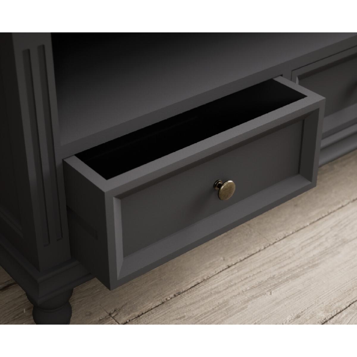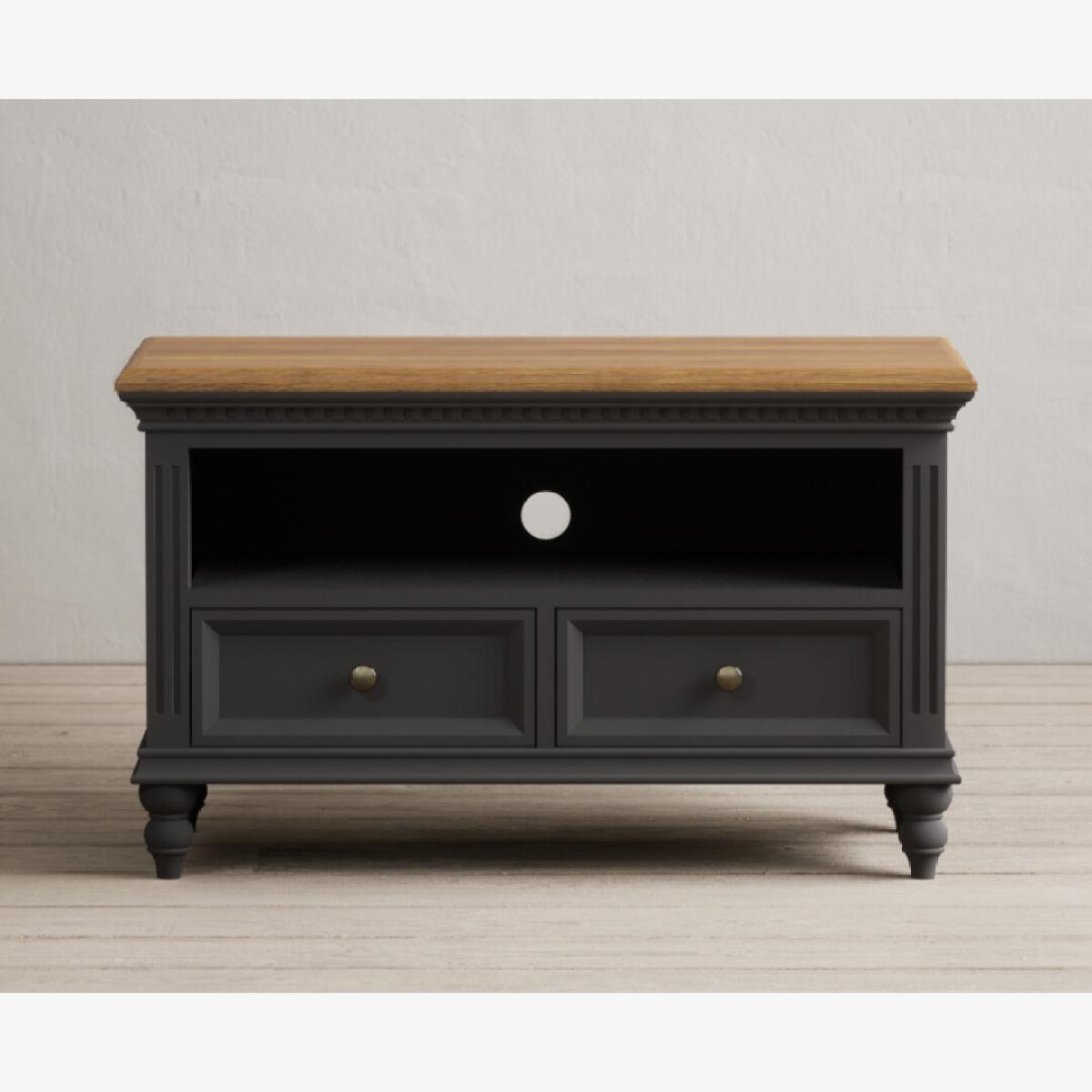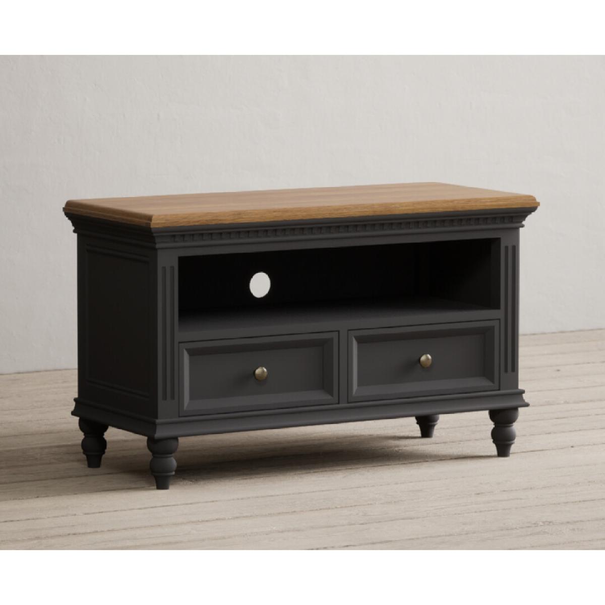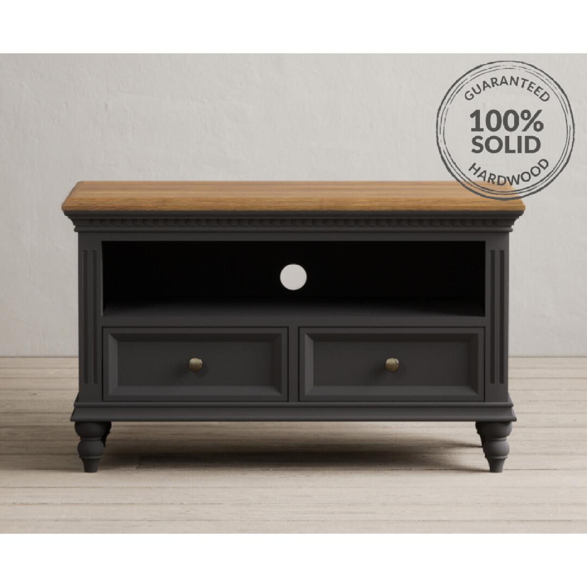 The Francis Oak and Charcoal Grey Painted Small TV Cabinet features a charcoal grey painted solid hardwood frame and whitewashed solid oak top, with a cable management hole and two Dovetail drawers.