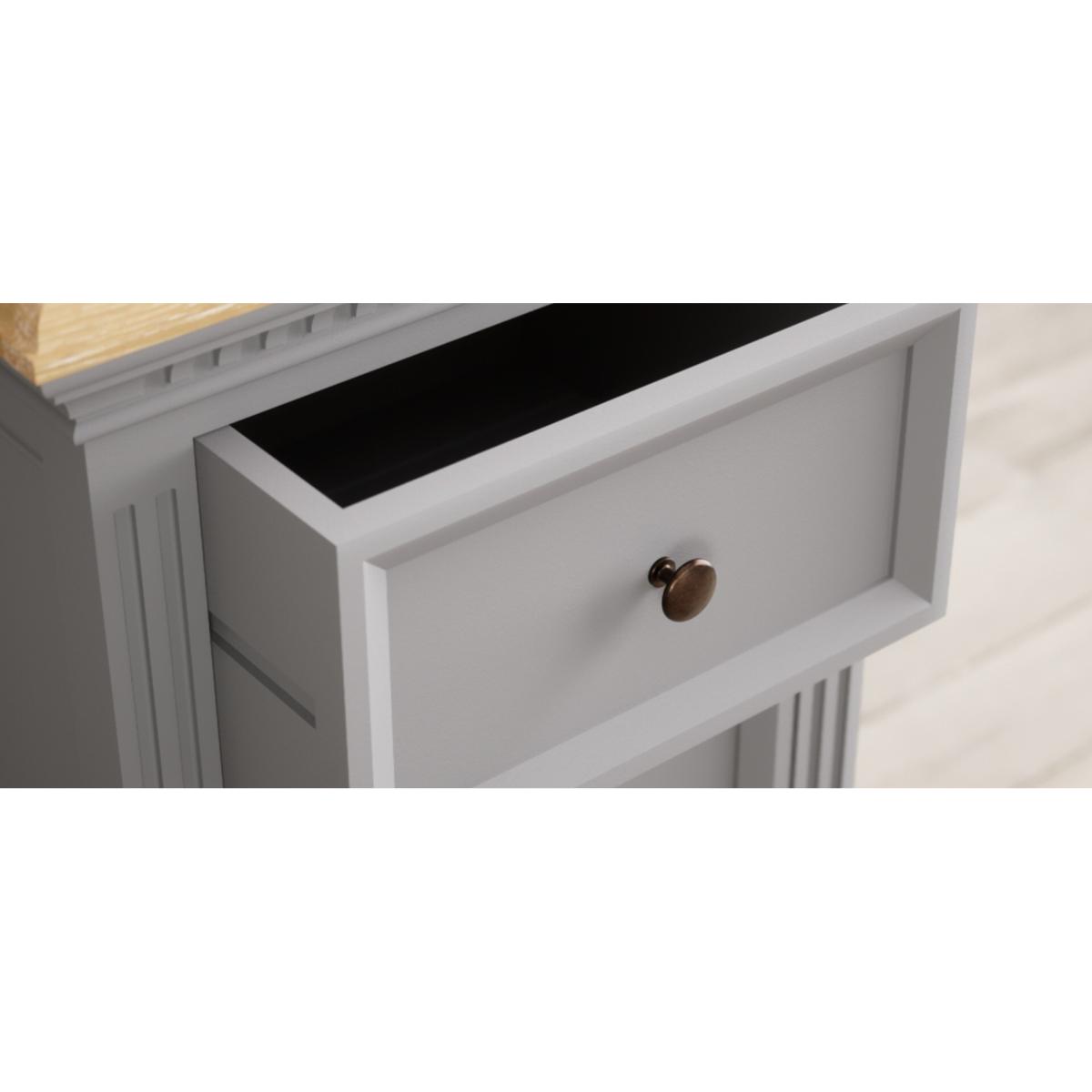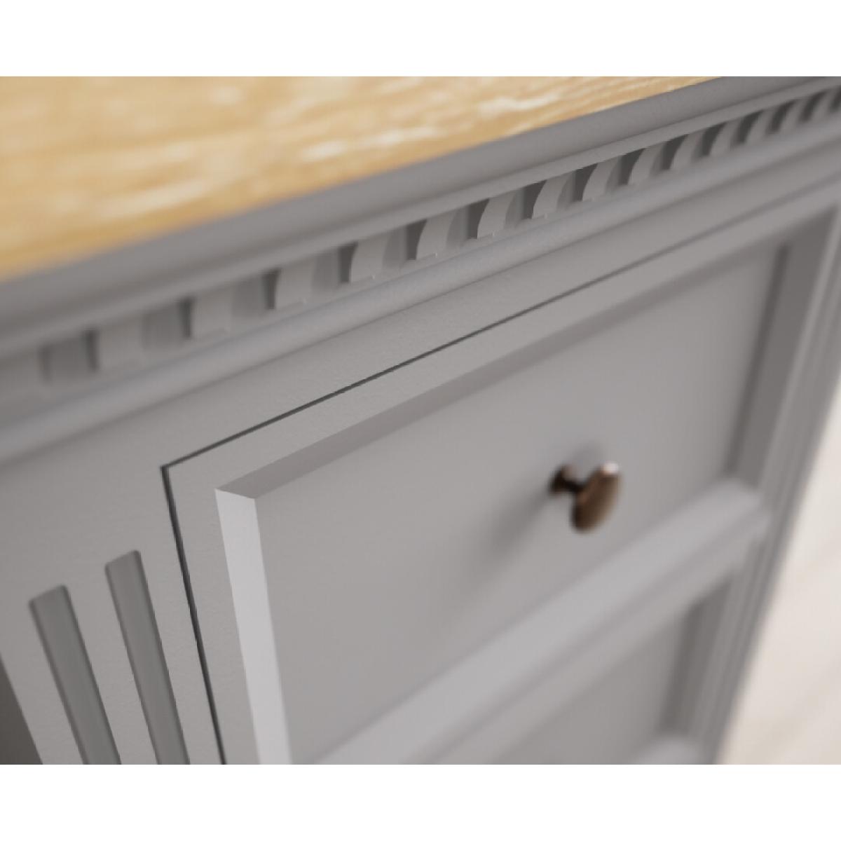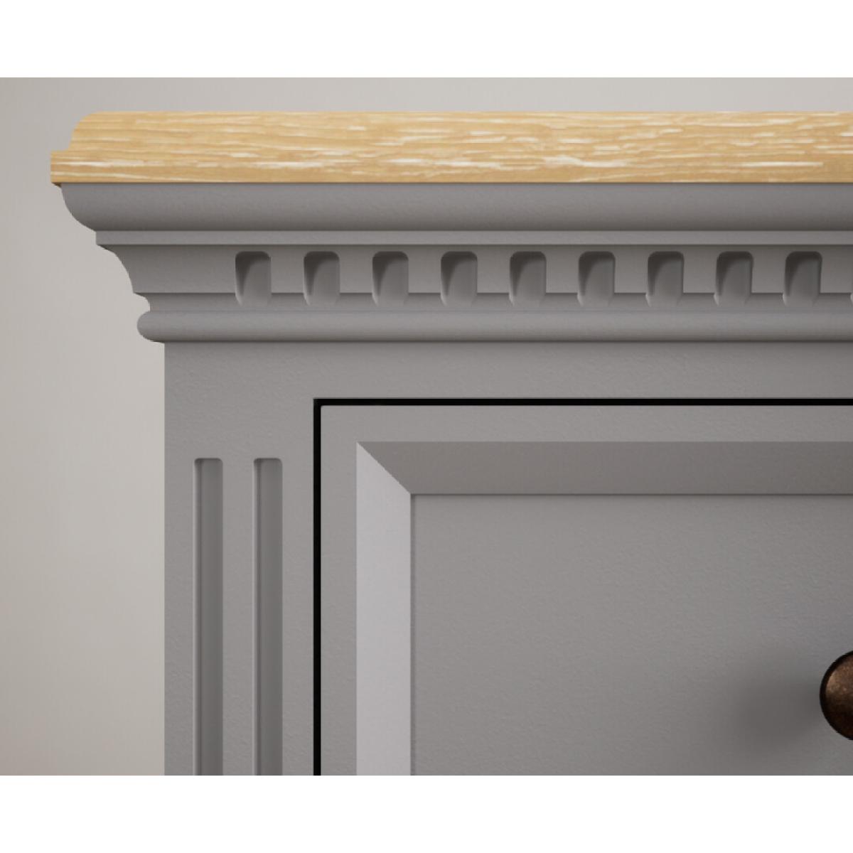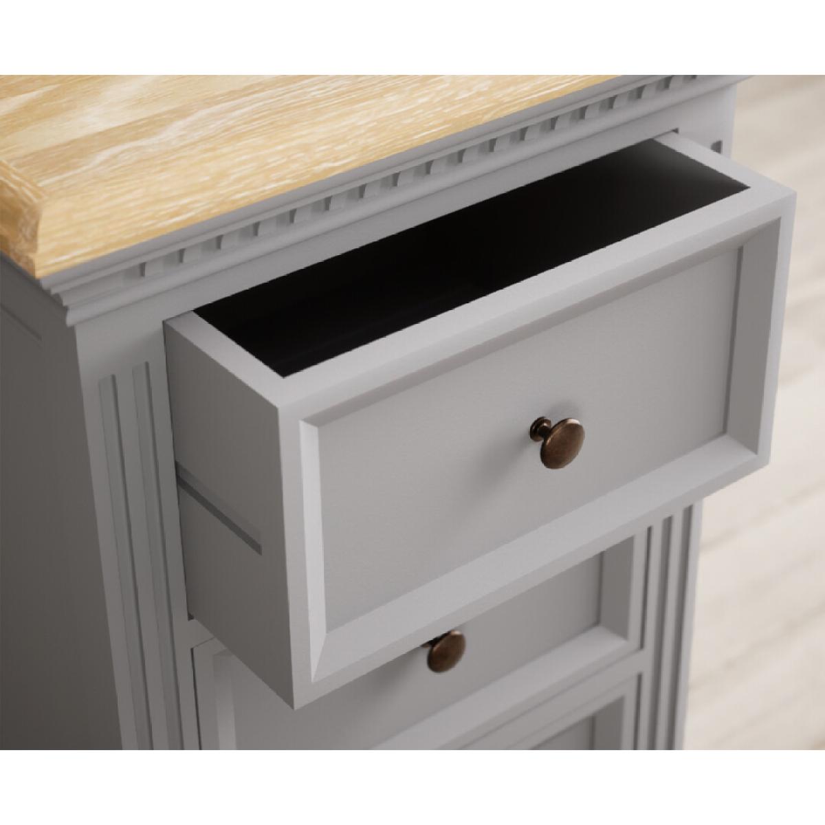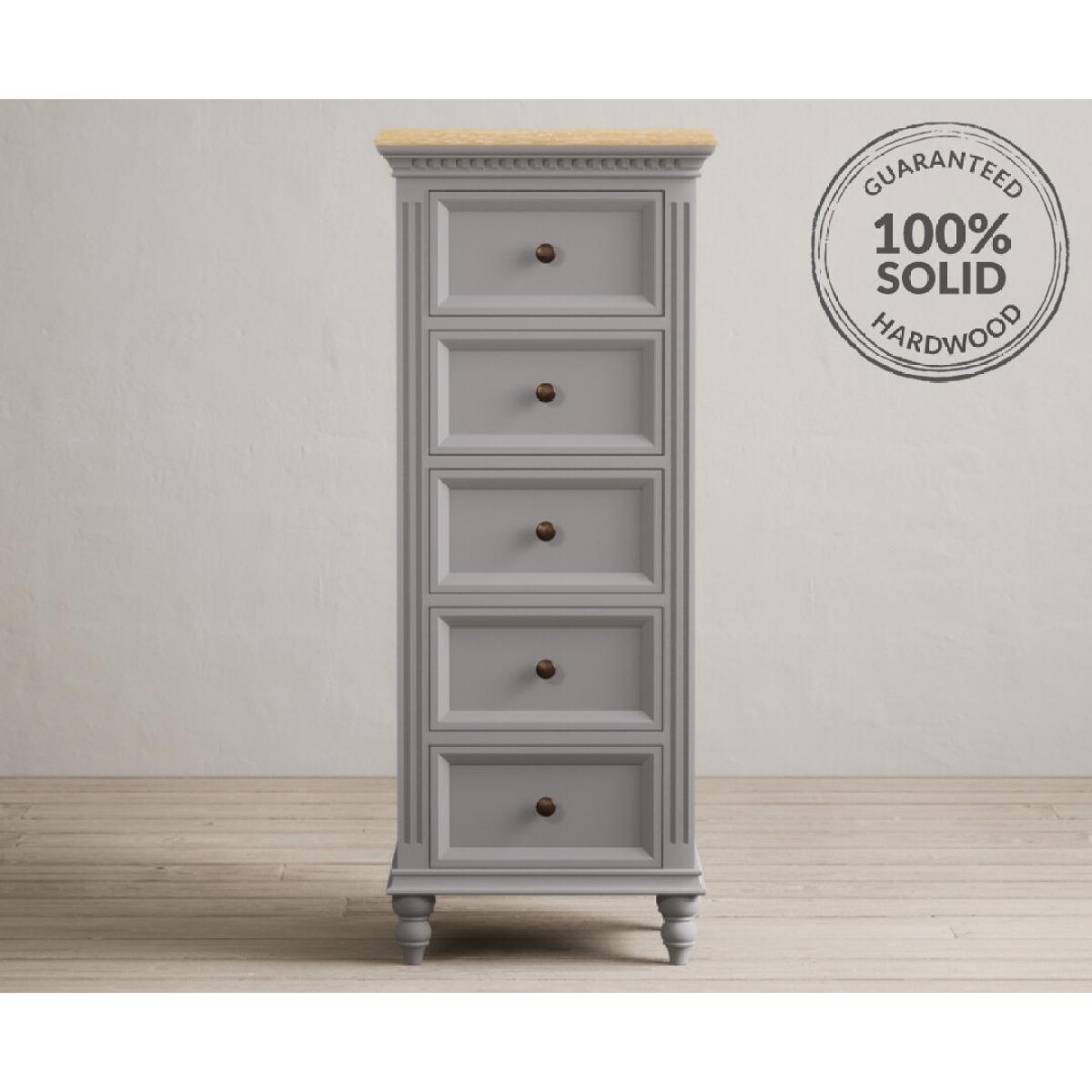 The Francis Light Grey 5 Drawer Tallboy features a grey painted solid hardwood frame and 100% solid oak top with a whitewashed finish, with five Dovetail drawers.