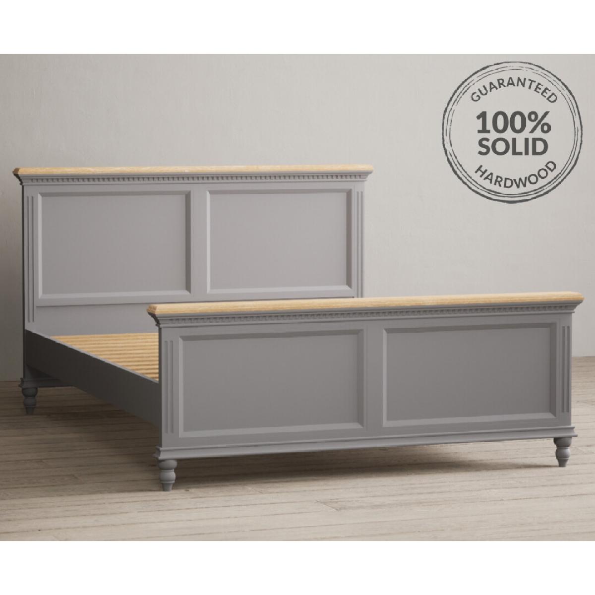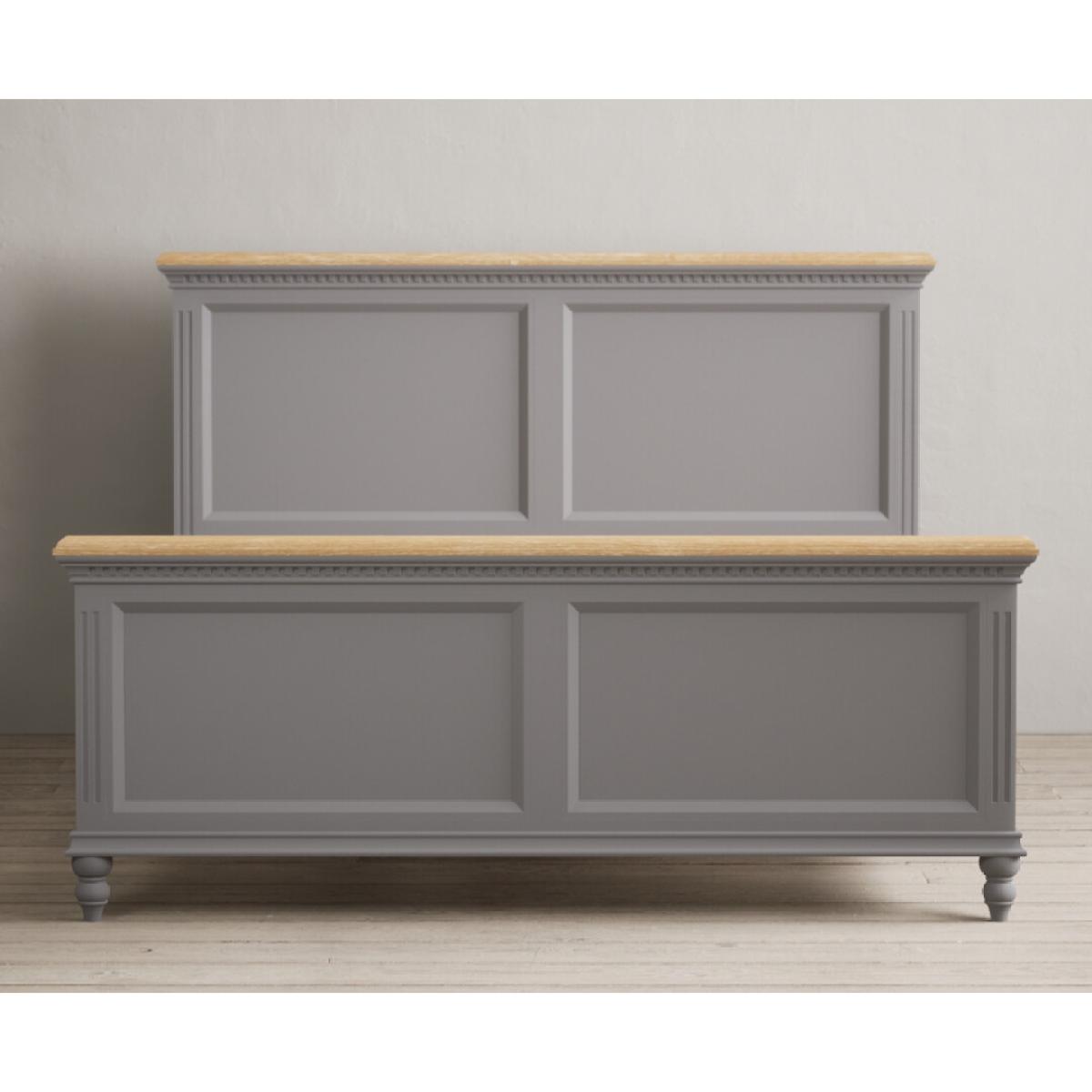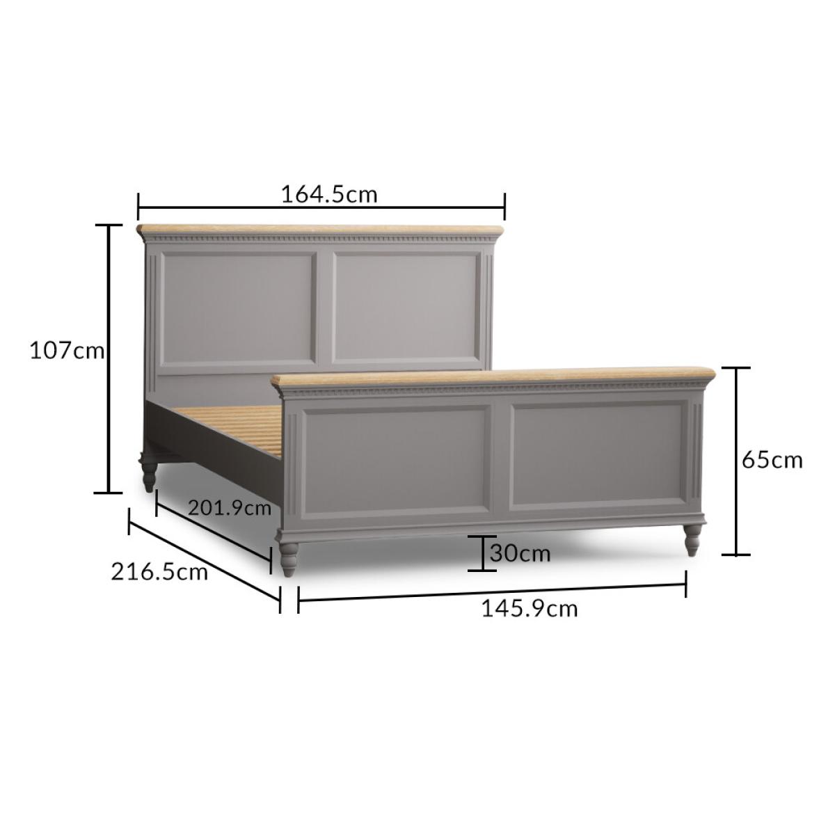 The Francis Light Grey Kingsize Bed features a grey painted solid hardwood frame with a panelled design, solid oak tops, intricate detailing and solid wood slats.