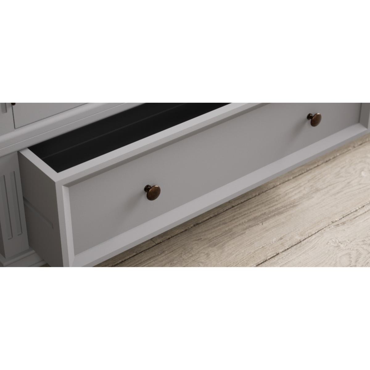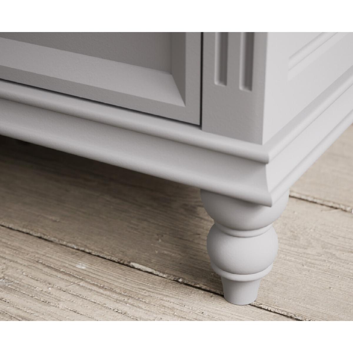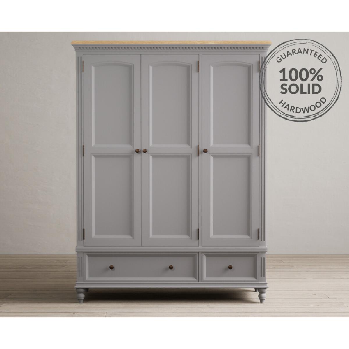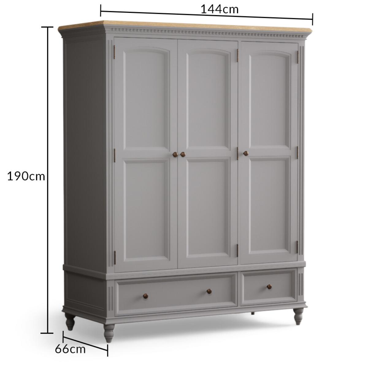 The Francis Light Grey Triple Wardrobe is crafted from grey painted solid hardwood and topped with whitewashed solid oak, with Dovetail drawers and removable shelves.