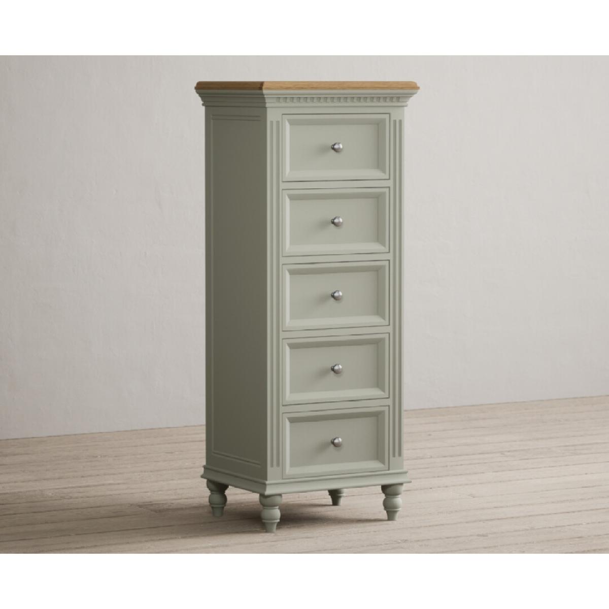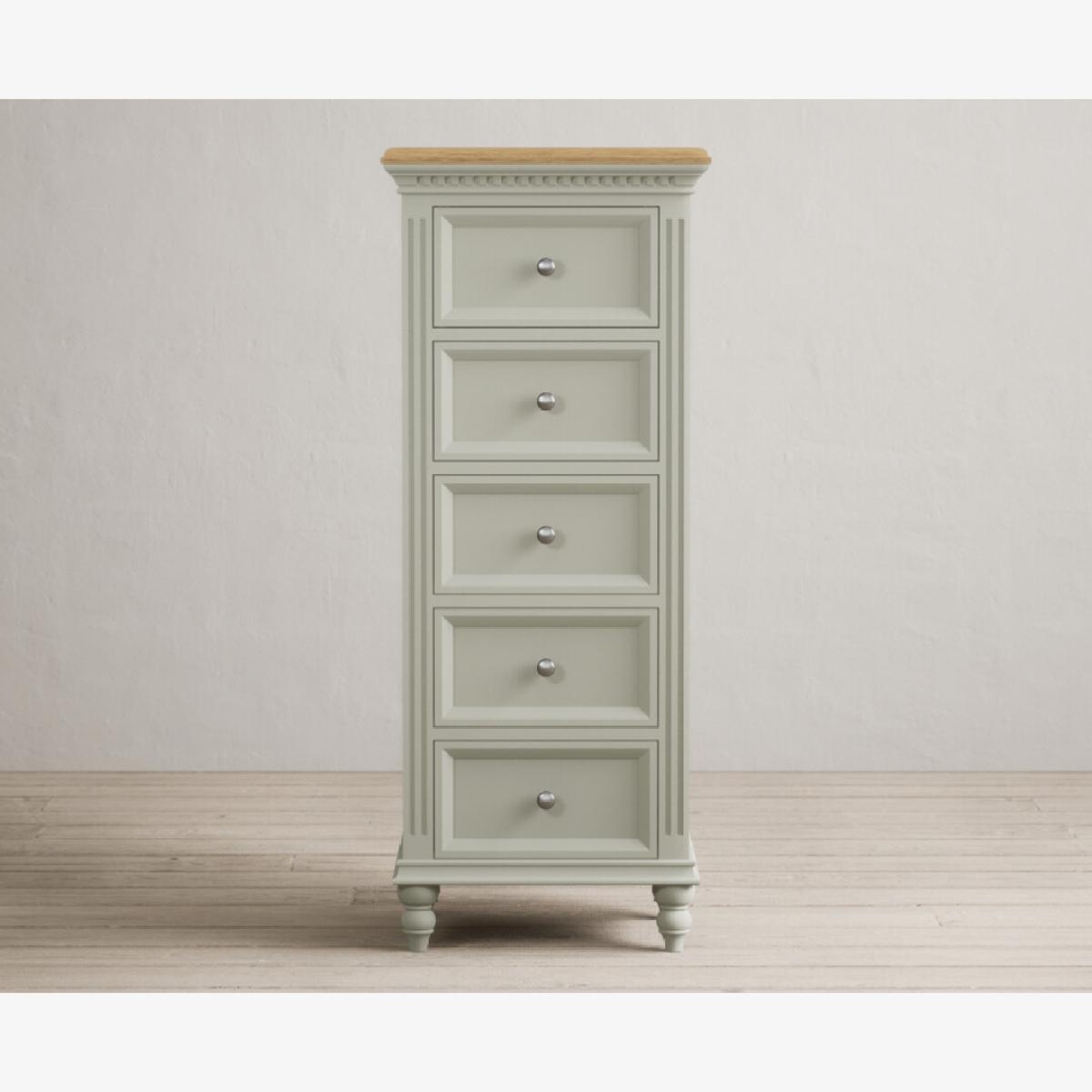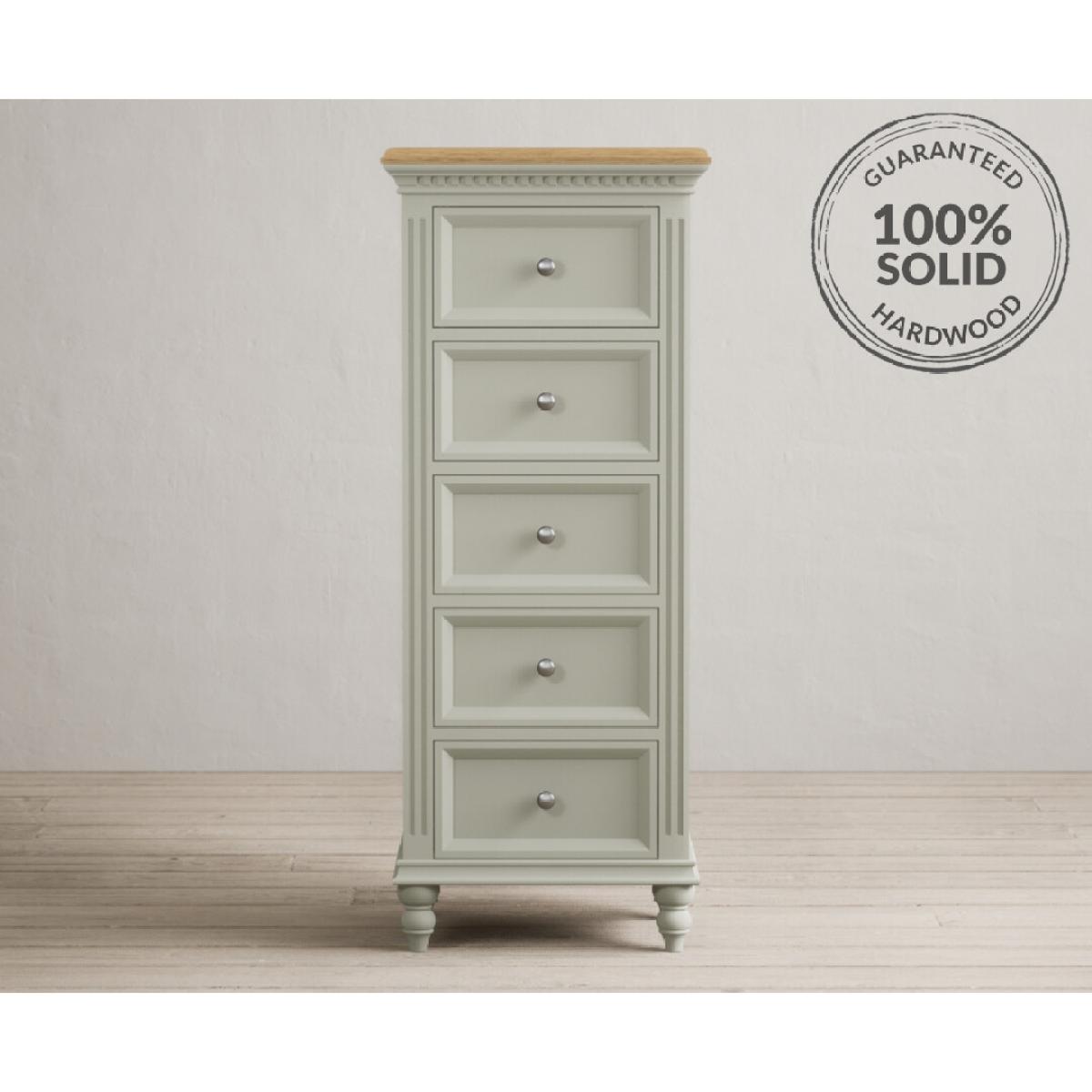 The Francis Oak and Soft Green Painted 5 Drawer Tallboy features a durable soft green painted solid hardwood frame and natural 100% solid oak top.