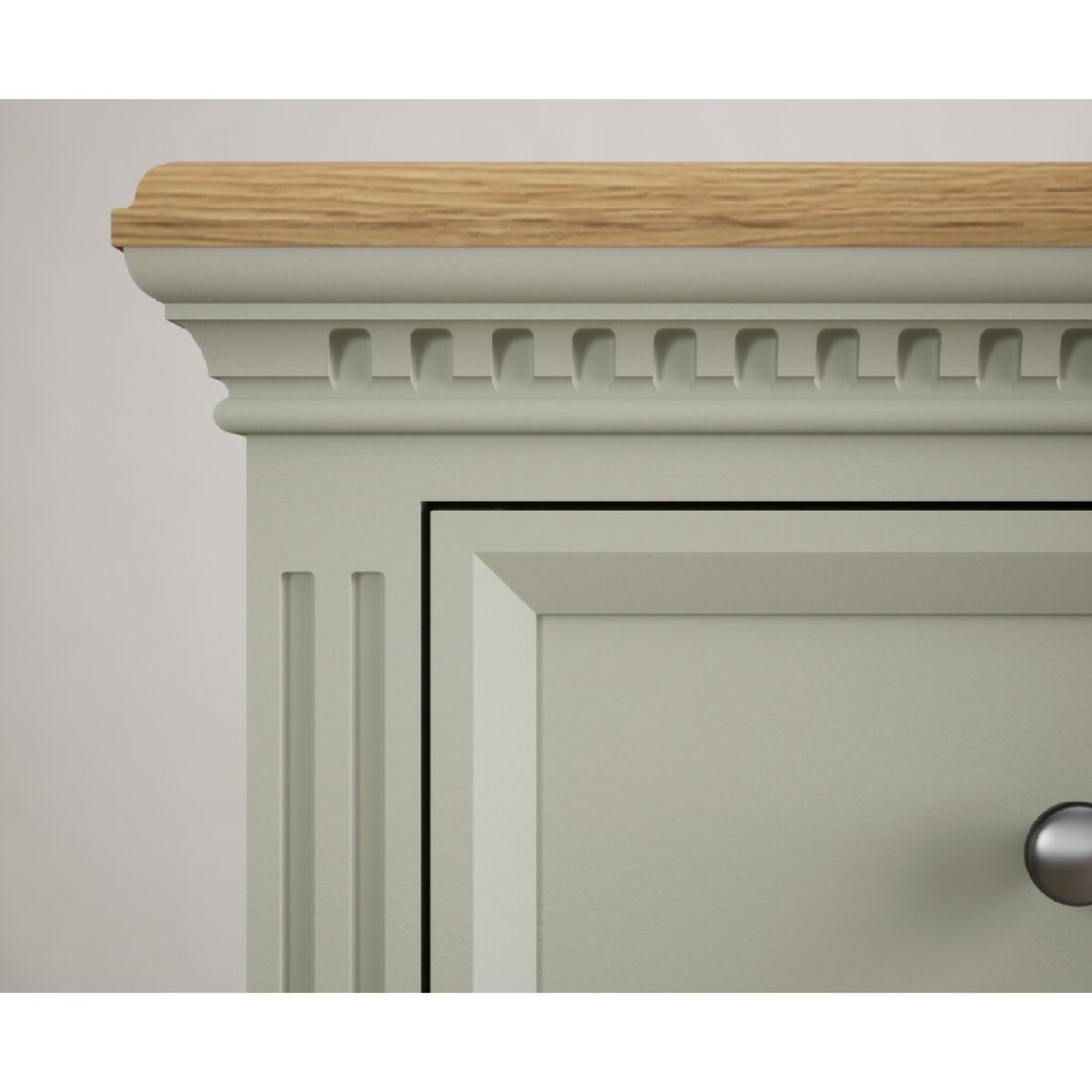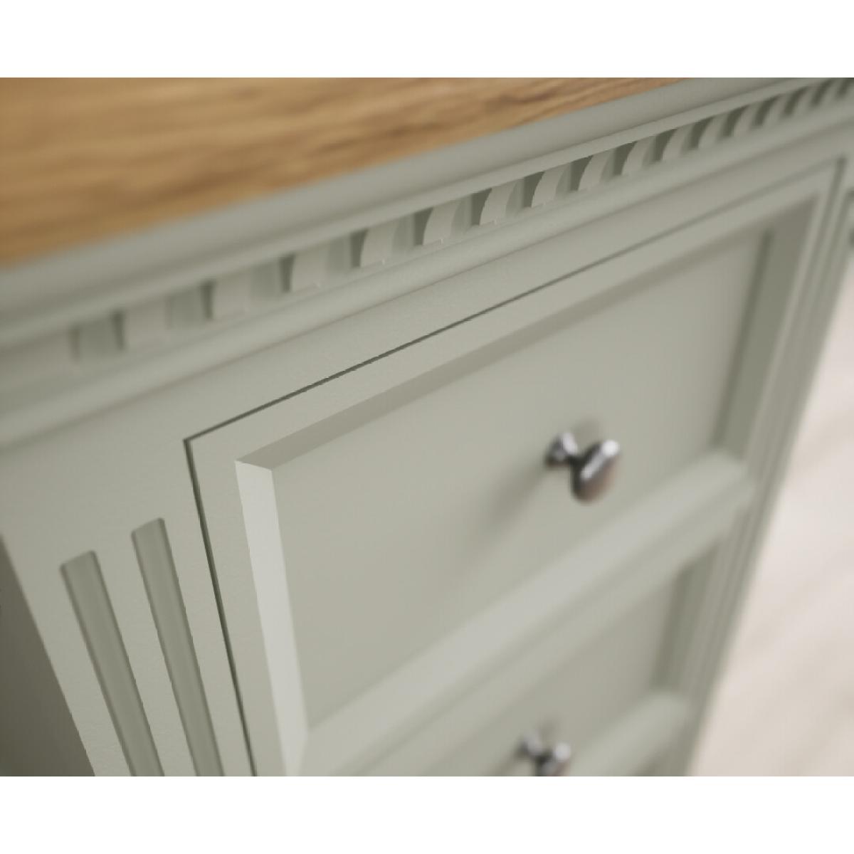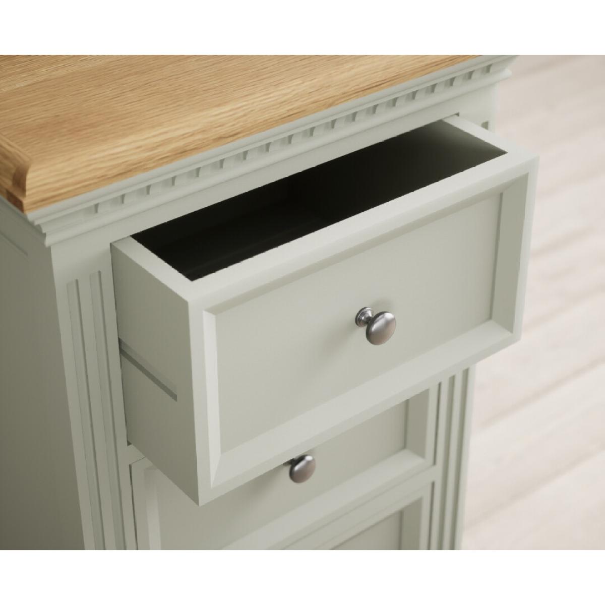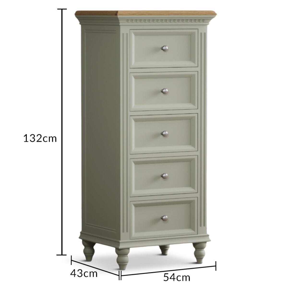 The Francis Oak and Soft Green Painted 5 Drawer Tallboy features a durable soft green painted solid hardwood frame and natural 100% solid oak top.