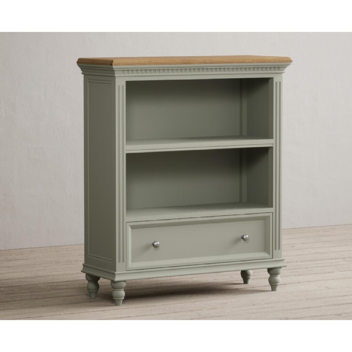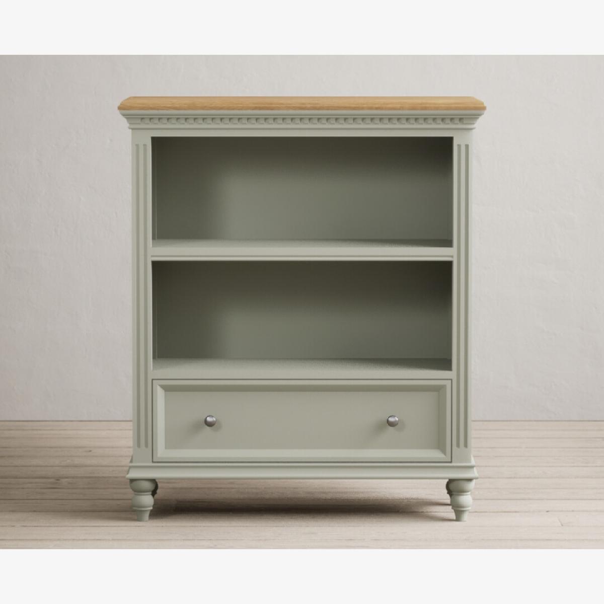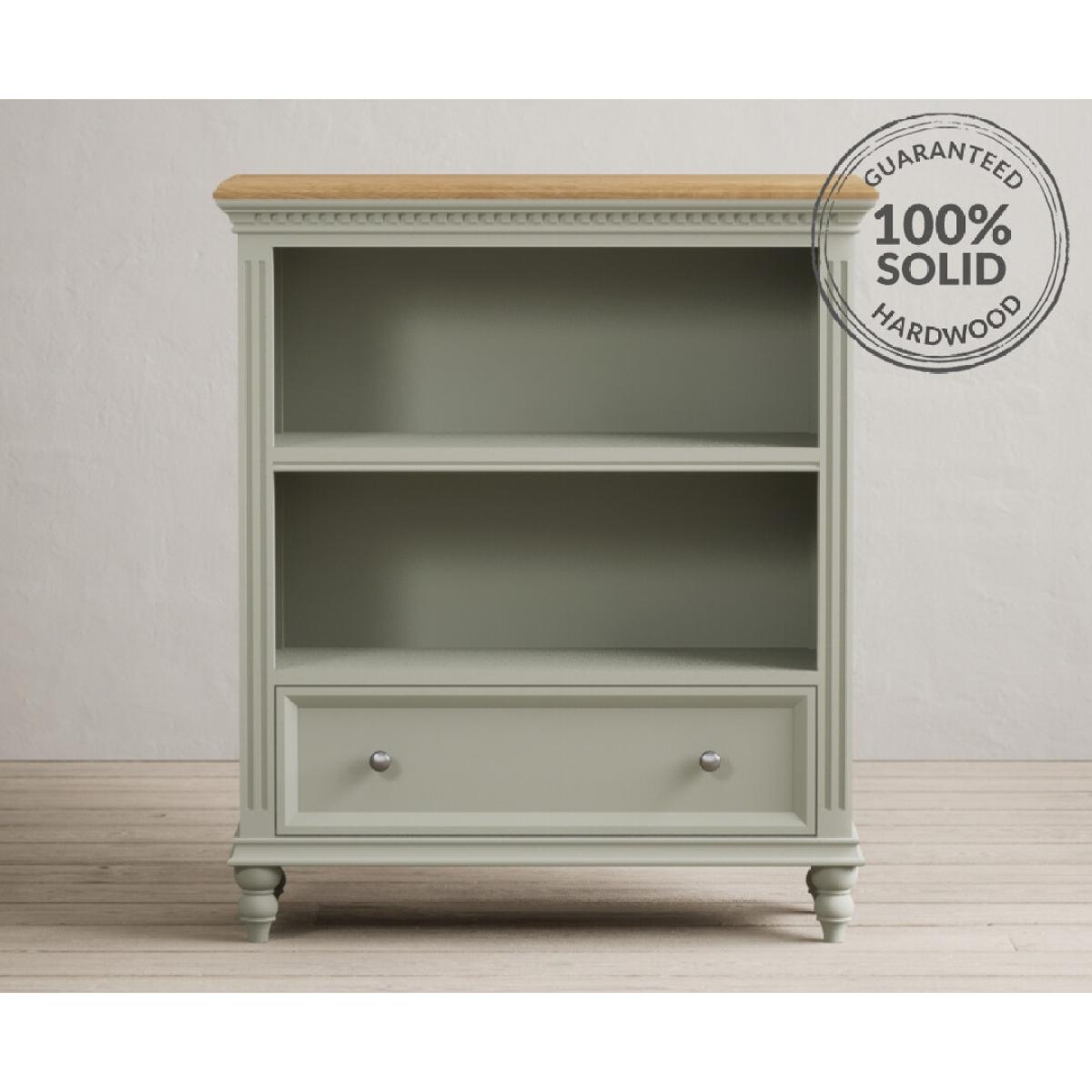 The Francis Oak and Soft Green Painted Low Bookcase features a sturdy soft green painted solid hardwood frame and 100% solid oak top.