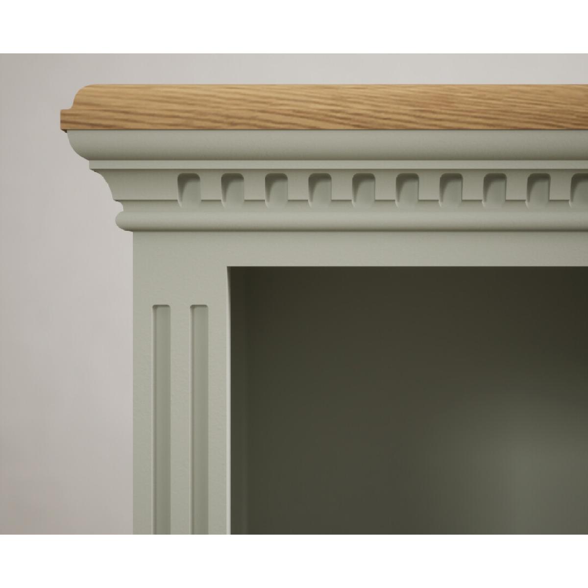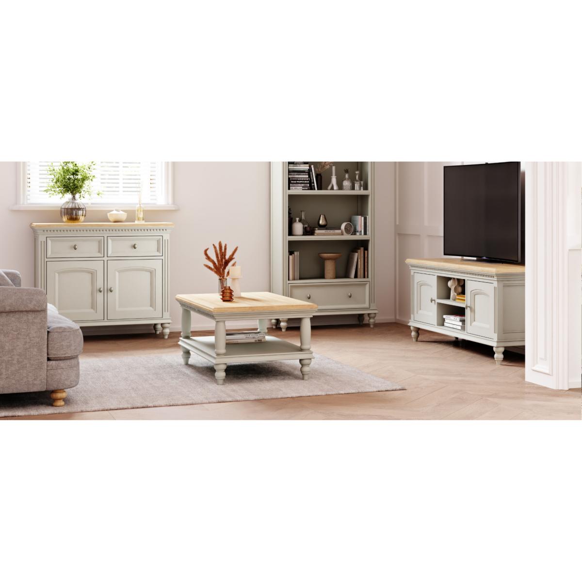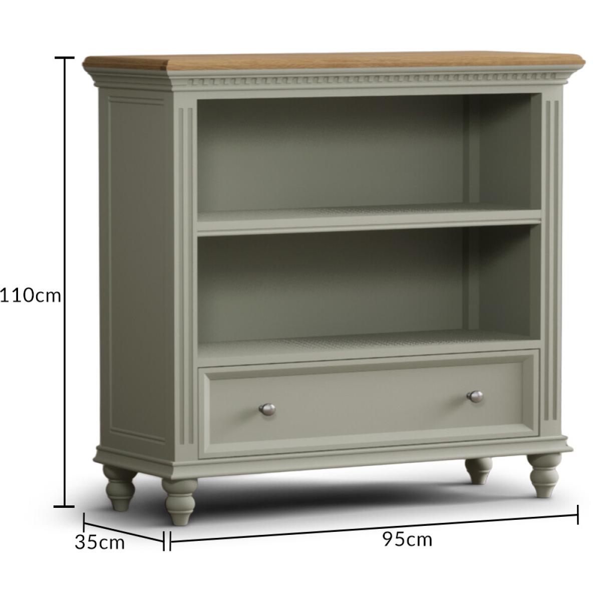 The Francis Oak and Soft Green Painted Low Bookcase features a sturdy soft green painted solid hardwood frame and 100% solid oak top.