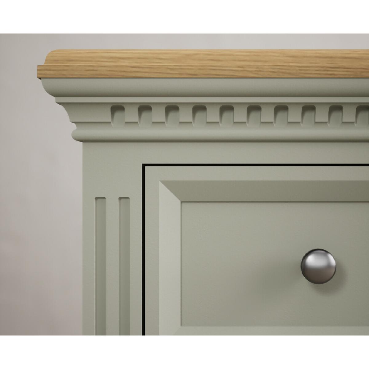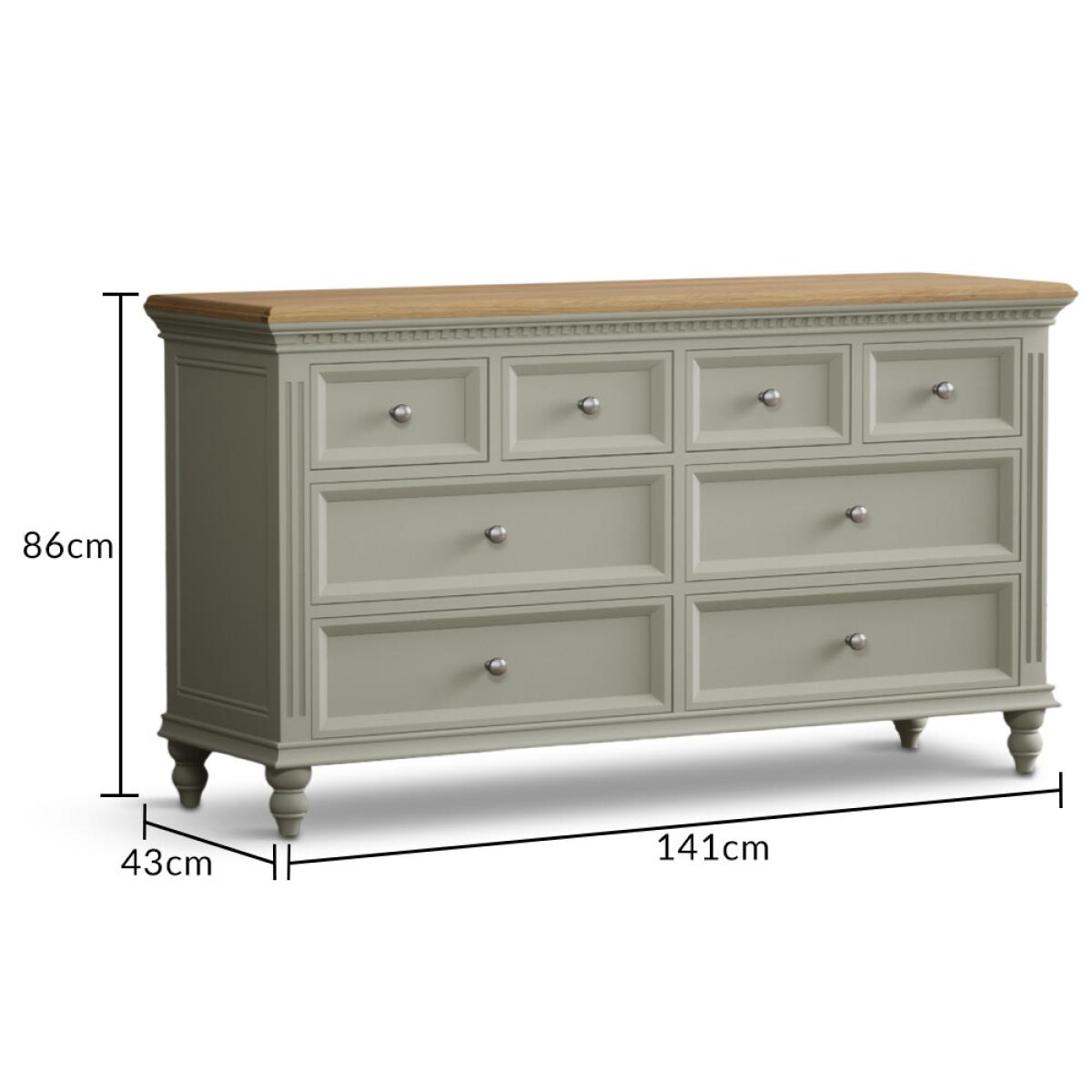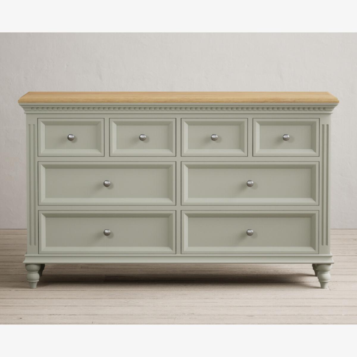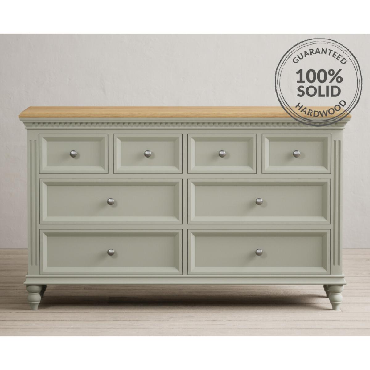 The Francis Oak and Soft Green Painted Wide Chest Of Drawers features a soft green painted solid hardwood frame and 100% solid oak top.