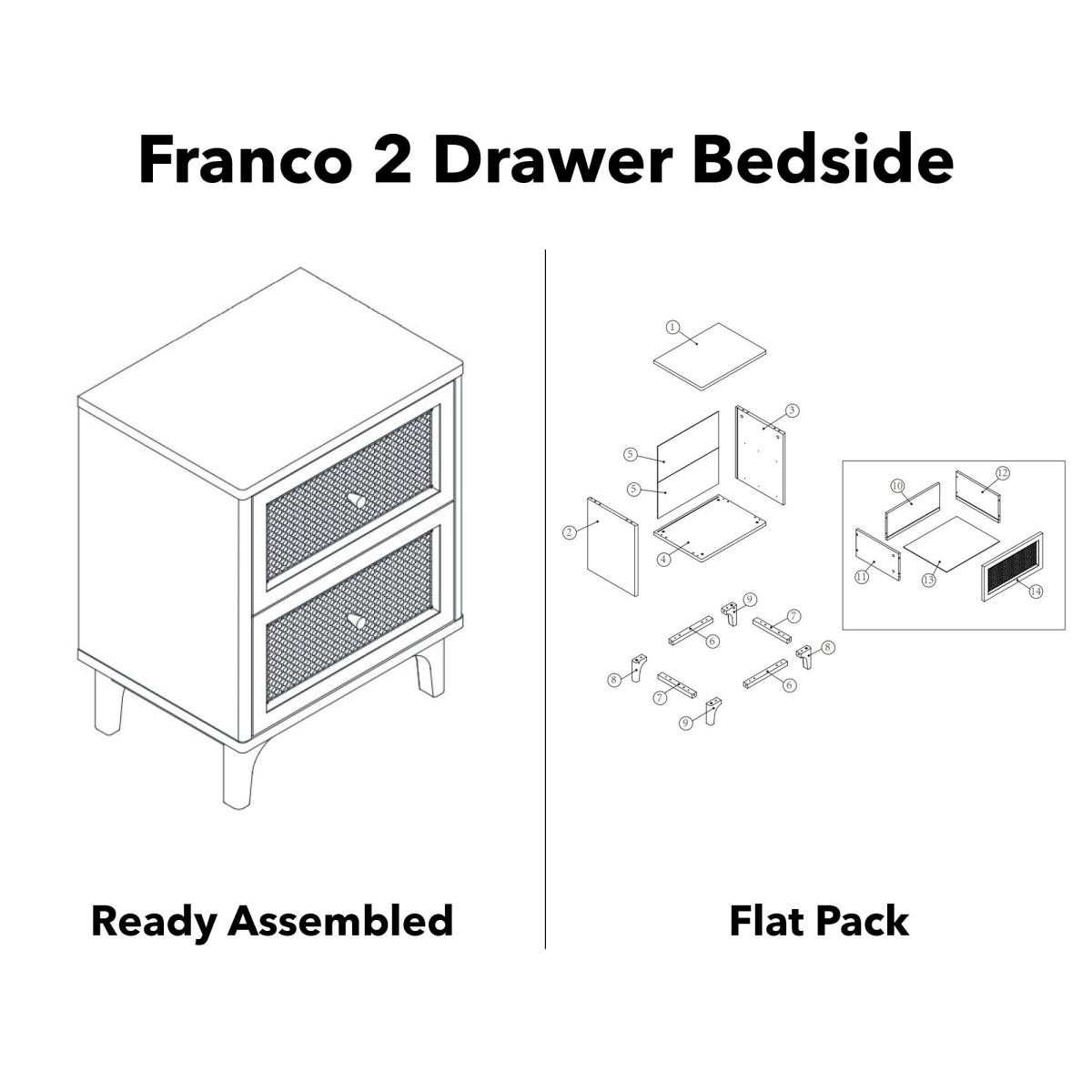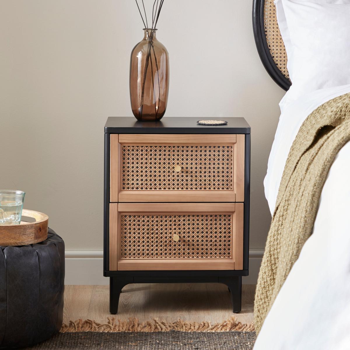 Get rid of monotony and bring in a dose of boho styling to your bedroom with the Franco Bedside table. This stylish yet practical piece of furniture offers an ample amount of storage space with the 2 drawers, decorated with a super on trend rattan cane material. Combined with the contrasting black surround and brushed gold effect handles, this bedside table is to die for and is bound to make a reappearance on your Instagram feed. This piece pairs beautifully with both traditional and contemporary décor, however would look perfect styled with other neutral and natural finish items such as dried flowers and candles.