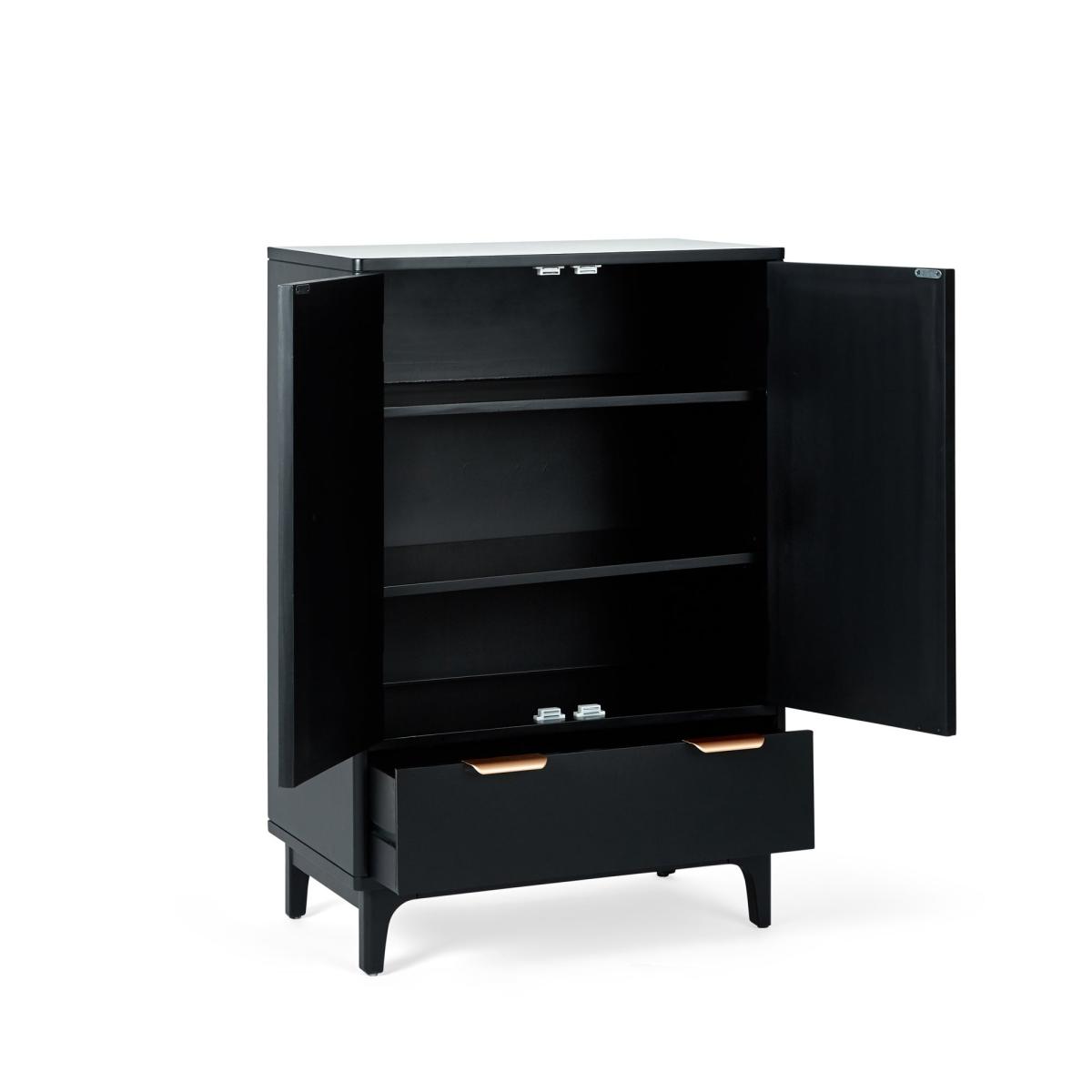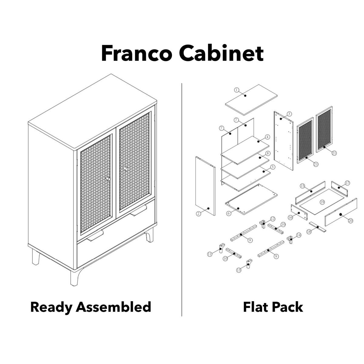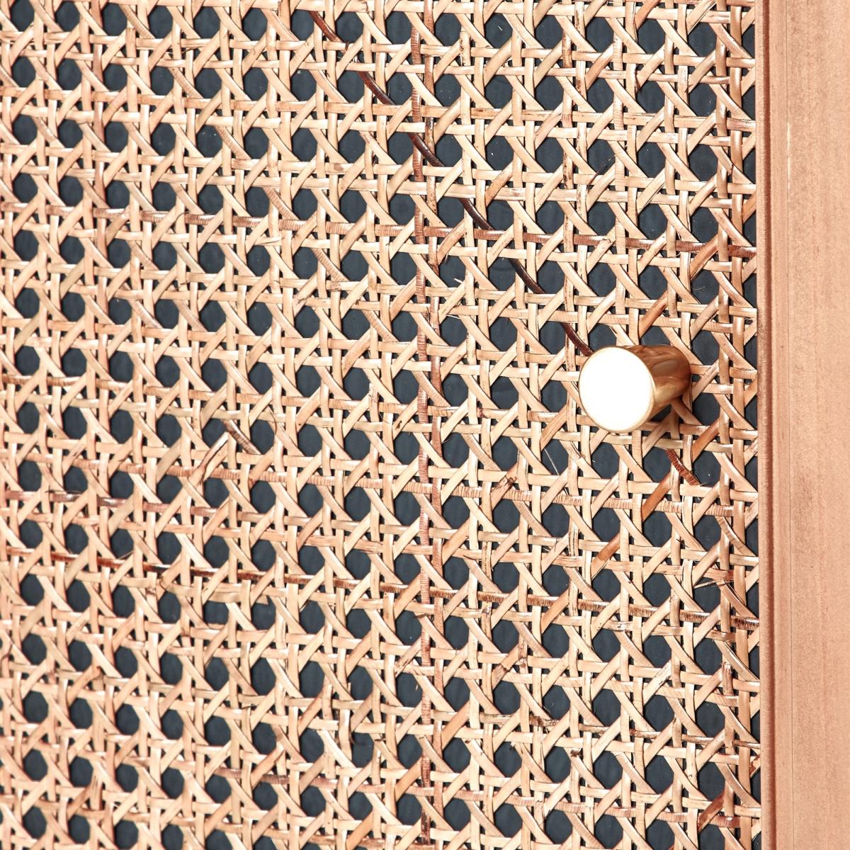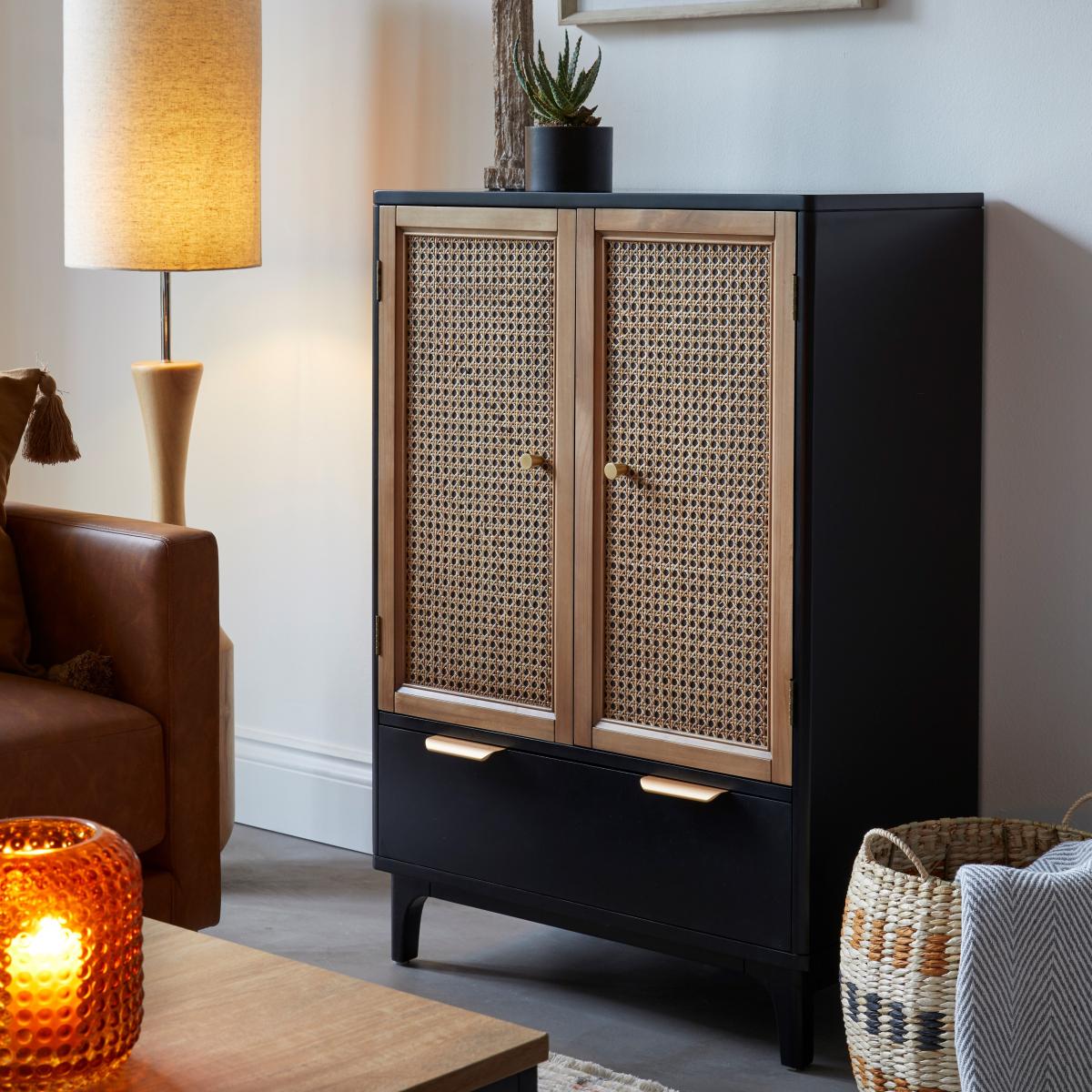 Dunelm Exclusive - Designed and Developed by Dunelm. Characterised by the stunning natural rattan fronts and contrasting black surround, the Franco collection brings a modern take on a retro design. Perfect for any contemporary or global styled home, this furniture range is completed with brushed gold effect handles, adding a touch of luxe styling. Perfect for adding a touch of luxe styling to you’re your living or bedroom space, the Franco cabinet features an ample sized cupboard with one fixed and one adjustable shelf and a large drawer offering plenty of useful storage space. Care Instructions: Avoid prolonged exposure to direct sunlight. Wipe up spills immediately with a damp cloth, avoid common hazards such as harsh solvents or abrasives. Maintain with regular dusting. Clean metal fixtures with mild, soap and water, dry thoroughly. Do not use a gold effect cleaner as this will damage the lacquer.