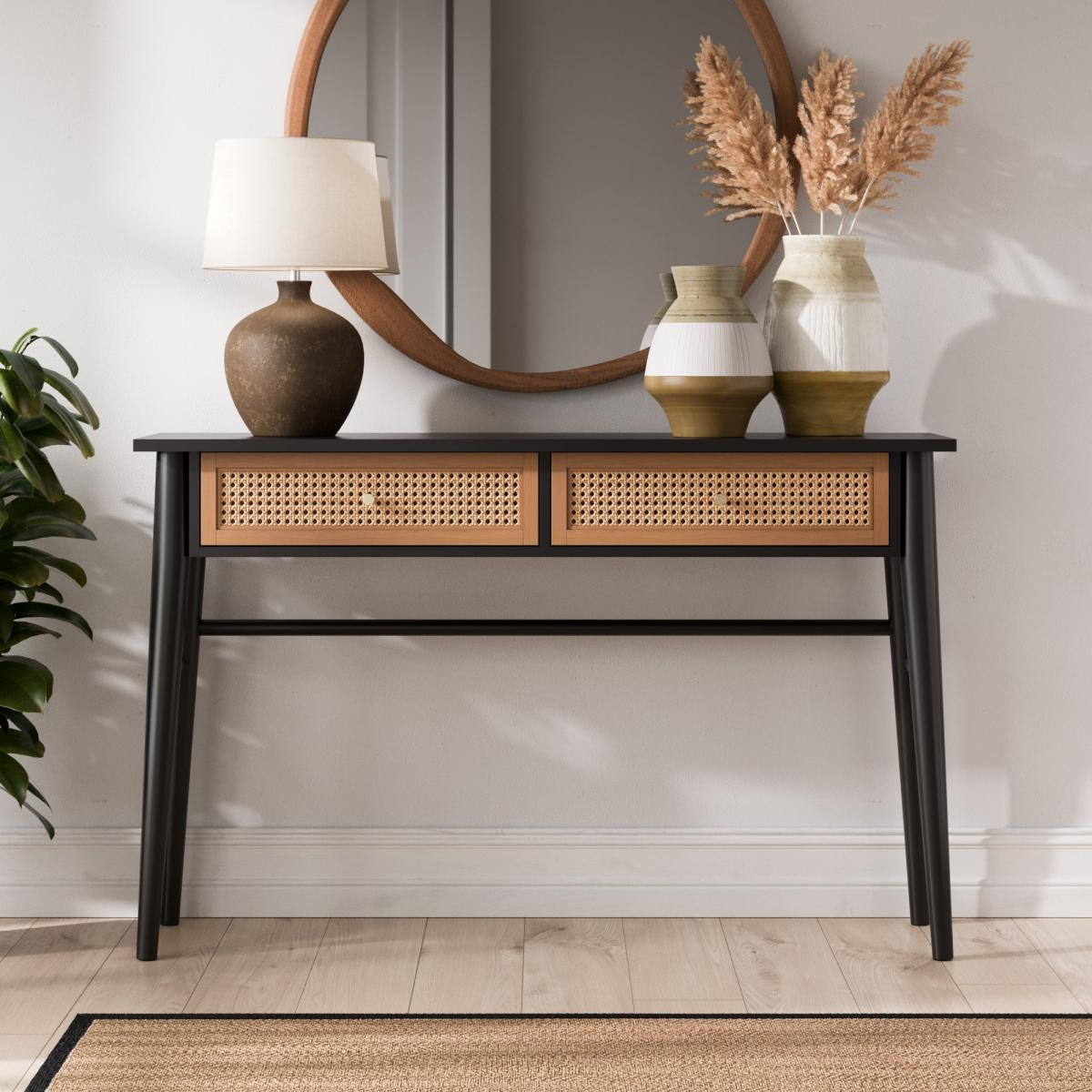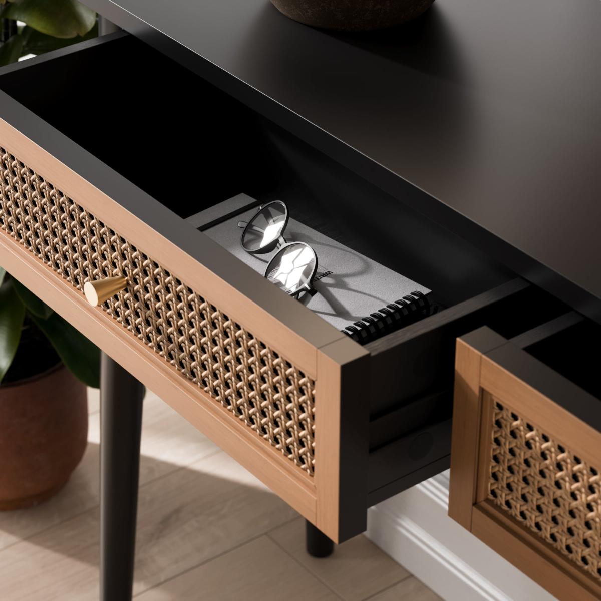 I love the black console table for its sleek, modern vibe and versatile style. It works well in both contemporary and minimalist interiors, offering a chic yet understated piece that can anchor an entrance hall, cosy living corner, or bedroom vignette. Practical styling tips include using it to display decorative items like vases and lamps, while keeping the surface tidy for a clean look. Its dark tone makes it a standout against lighter walls, and the natural woven drawers add texture and warmth, making this a functional addition that doesn’t compromise on style.