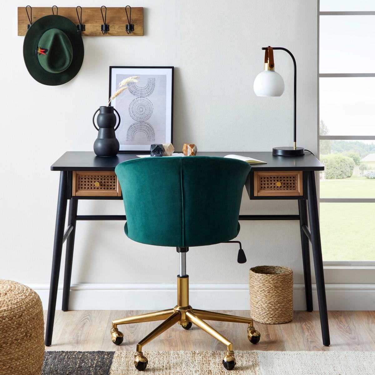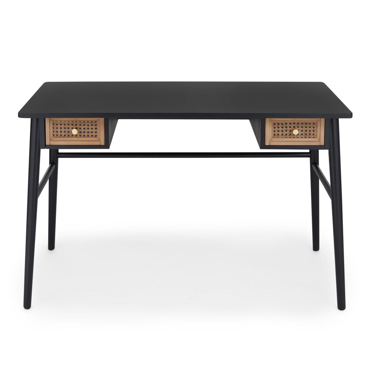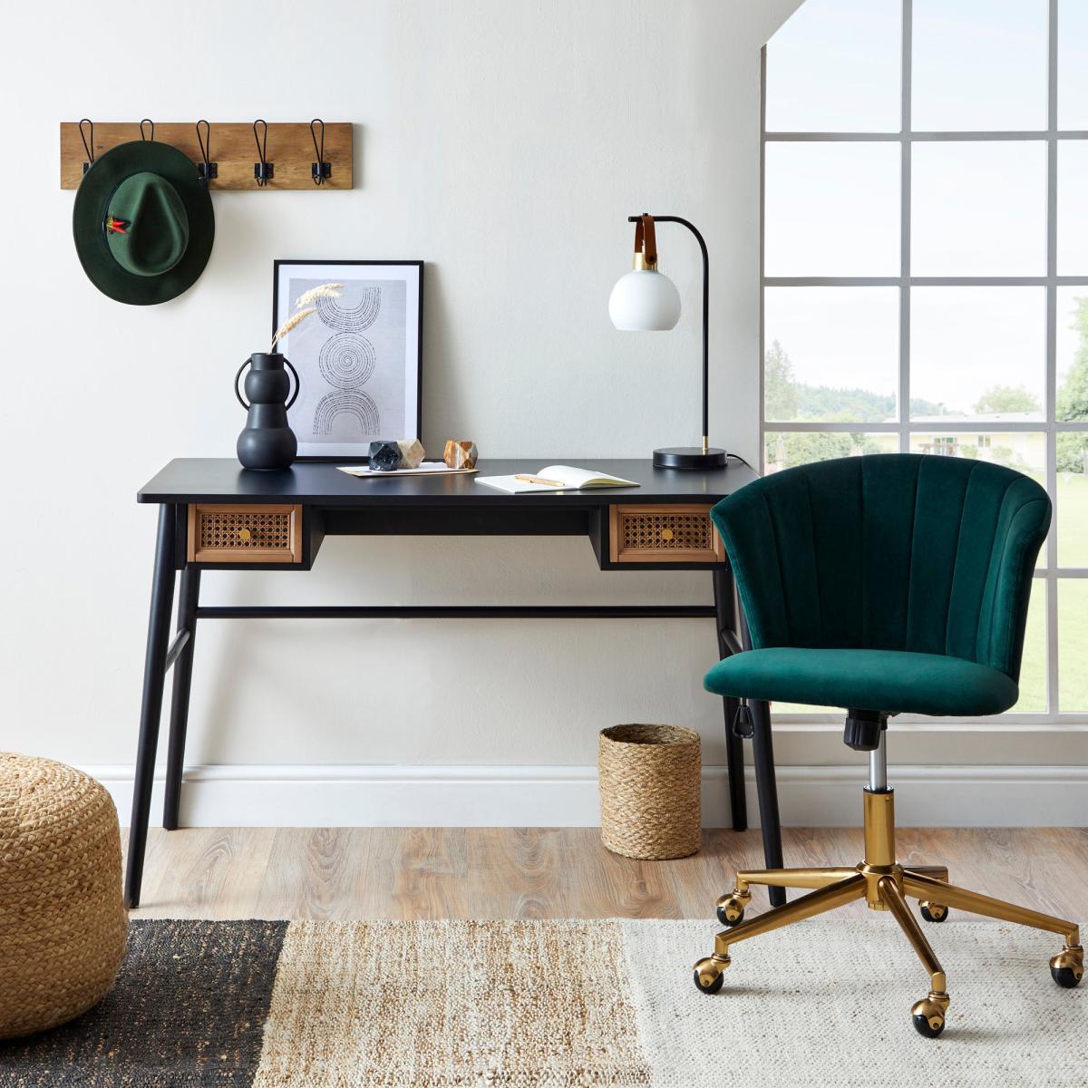Dunelm Exclusive - Designed and Developed by Dunelm. Characterised by the stunning natural rattan fronts and contrasting black surround, the Franco collection brings a modern take on a retro design. Perfect for any contemporary or global styled home, this furniture range is completed with brushed gold effect handles, adding a touch of luxe styling. With minimal assembly required, the Franco desk would make a stylish addition to any home office space. This stunning piece features a large work area as well as two rattan fronted drawers for convenient storage, and styled with slender tapered legs for an elegant finish. Care Instructions: Avoid prolonged exposure to direct sunlight. Wipe up spills immediately with a damp cloth, avoid common hazards such as harsh solvents or abrasives. Maintain with regular dusting. Clean metal fixtures with mild, soap and water, dry thoroughly. Do not use a gold effect cleaner as this will damage the lacquer.