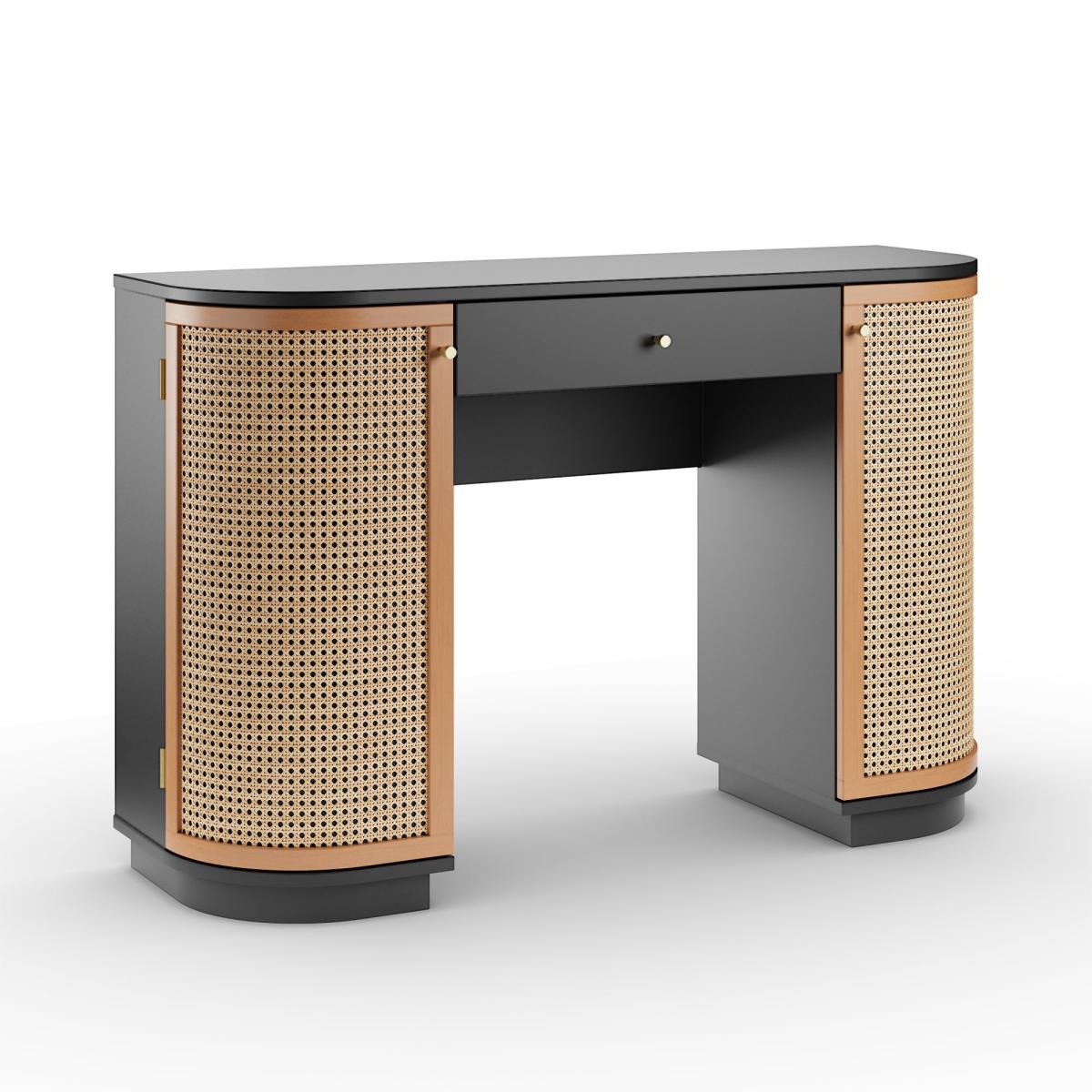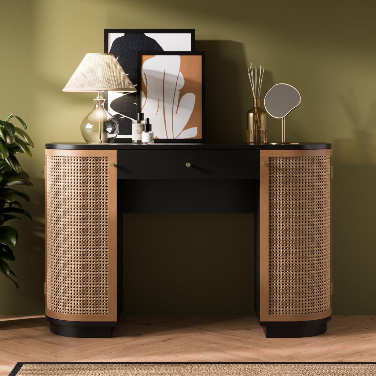You'll be hooked at first sight of this charming dressing table. With its soft curves, natural cane fronts and black-painted surround it's sure to add a retro feel to any space it inhabits. The drawer and 2 cupboards with shelves provide ample space for keeping makeup, haircare, and skincare products close to hand.
