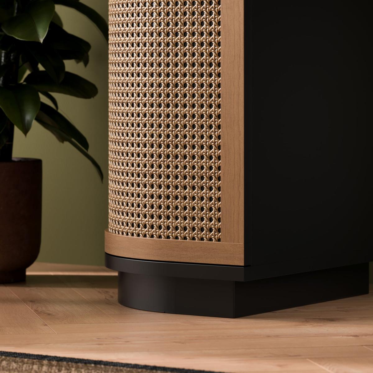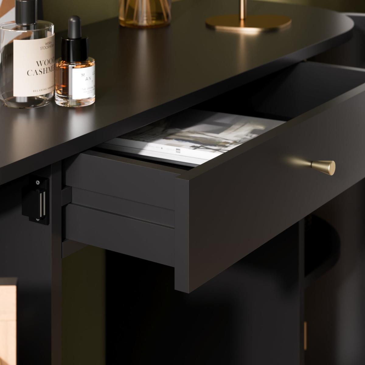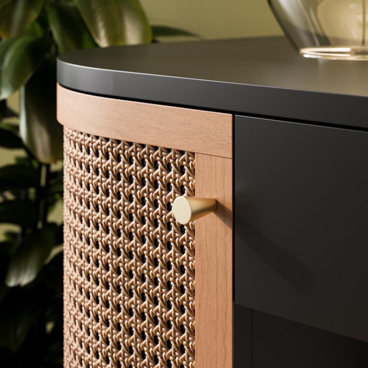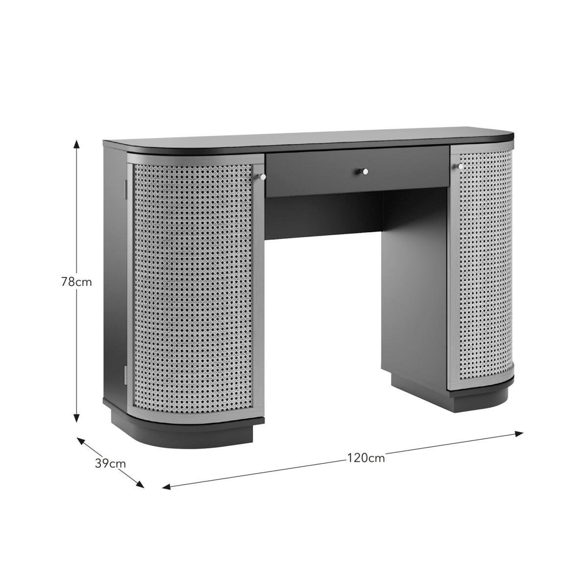 I love this black dressing table for its sleek, modern look that anchors a variety of interior styles, from contemporary to minimalistic. Its bold colour makes it a striking statement piece, especially in monochrome or neutral schemes, but it also works well in more eclectic settings when paired with textured accessories or metallic accents. Practical styling tips include balancing the dark finish with light-reflecting accessories, like the mirrored items shown, and keeping the top clear for everyday use to maintain a clean and functional space. Its curved silhouette and woven doors add a touch of softness and visual interest, making it versatile enough to suit both bedrooms and dressing areas.
