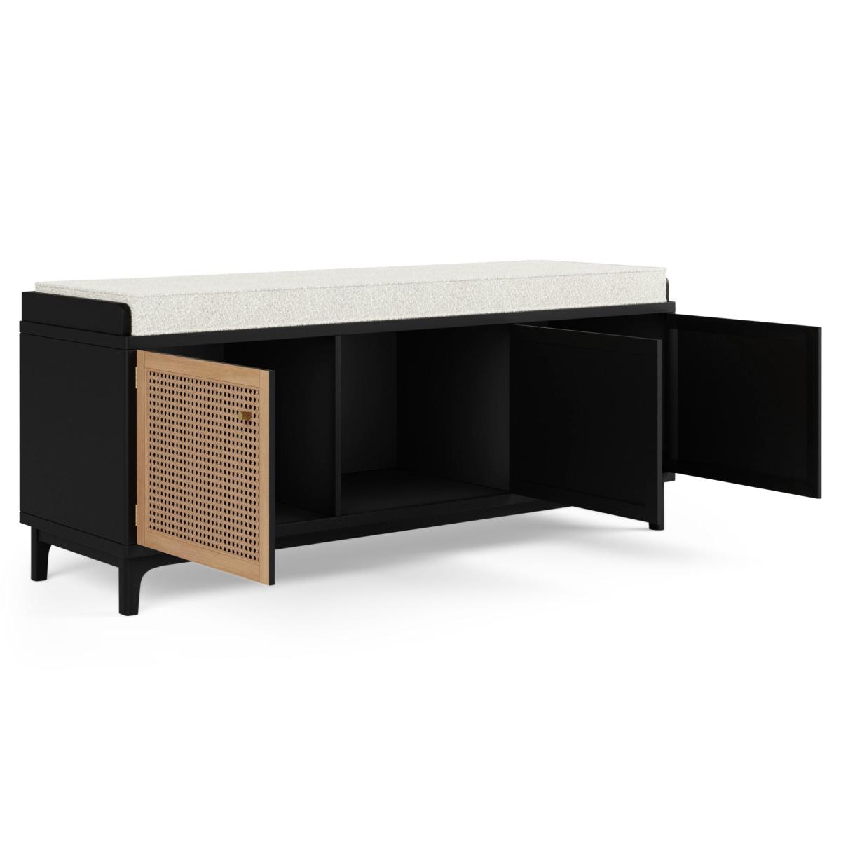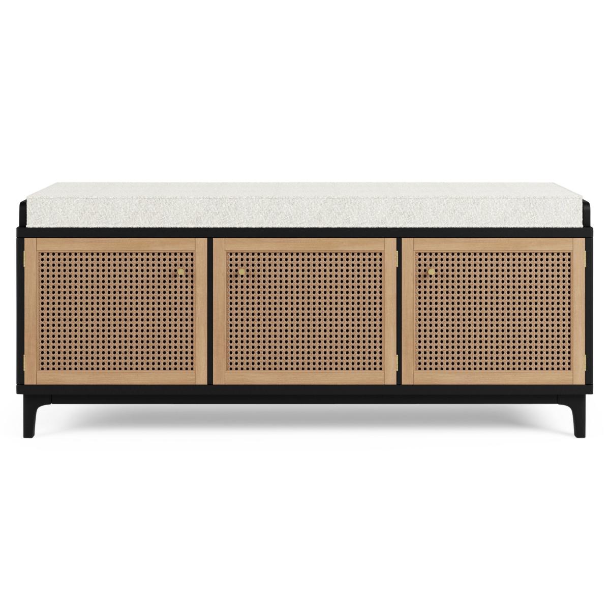 Characterised by the stunning natural rattan fronts and contrasting black surround, the Franco collection brings a modern take on a retro design. Perfect for any contemporary or global styled home, this furniture range is completed with brushed gold effect handles, adding a touch of luxe styling. This Franco storage bench is perfect for hallways, ideal to use as extra storage space for shoes and accessories while providing a convenient seat. Care Instructions: Avoid prolonged exposure to direct sunlight. Wipe up spills immediately with a damp cloth, avoid common hazards such as harsh solvents or abrasives. Maintain with regular dusting. Clean metal fixtures with mild, soap and water, dry thoroughly. Do not use a gold effect cleaner as this will damage the lacquer.