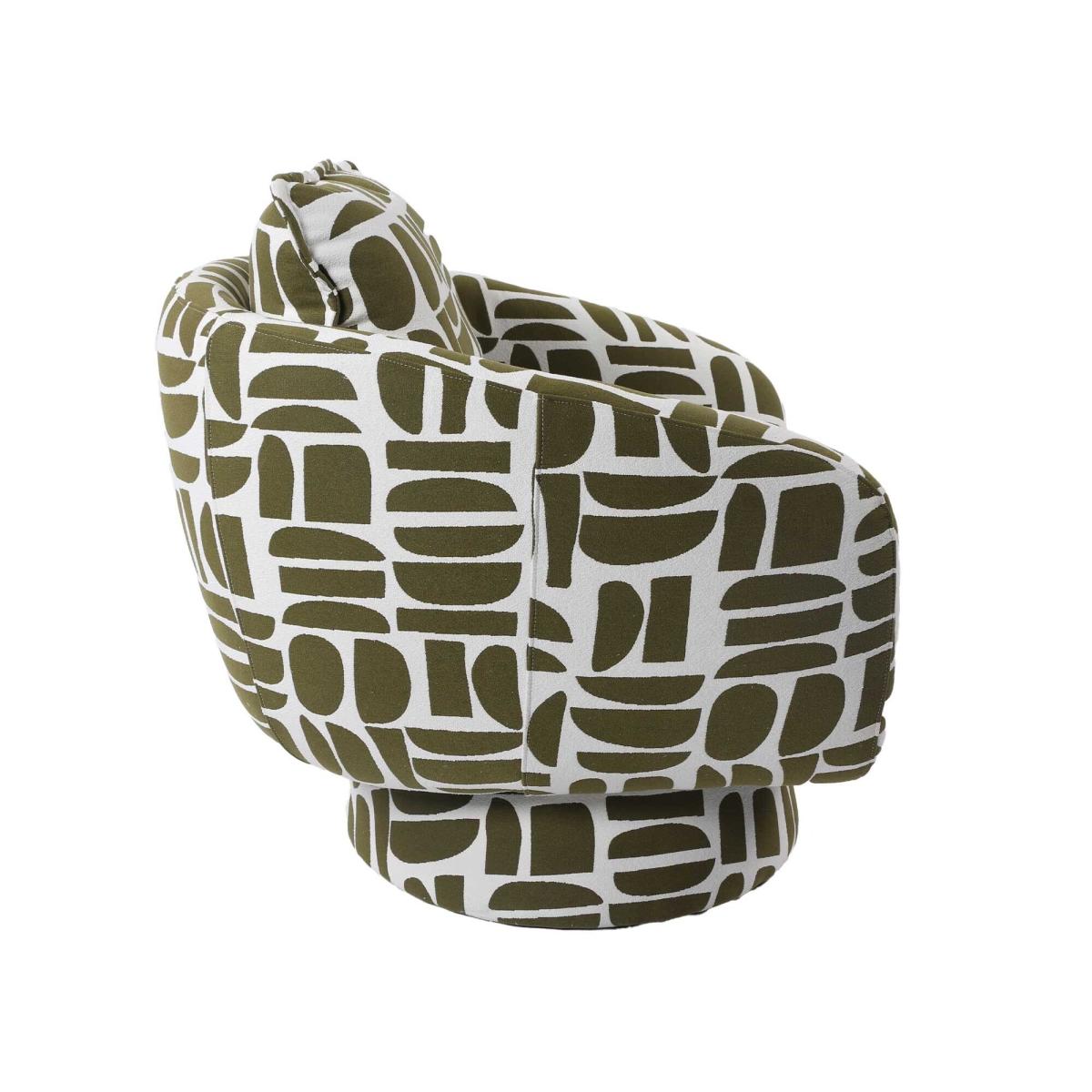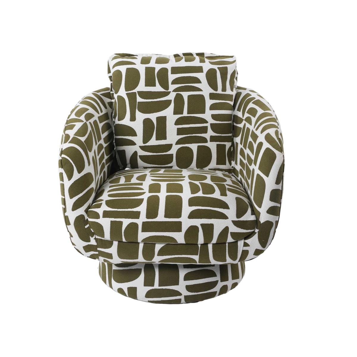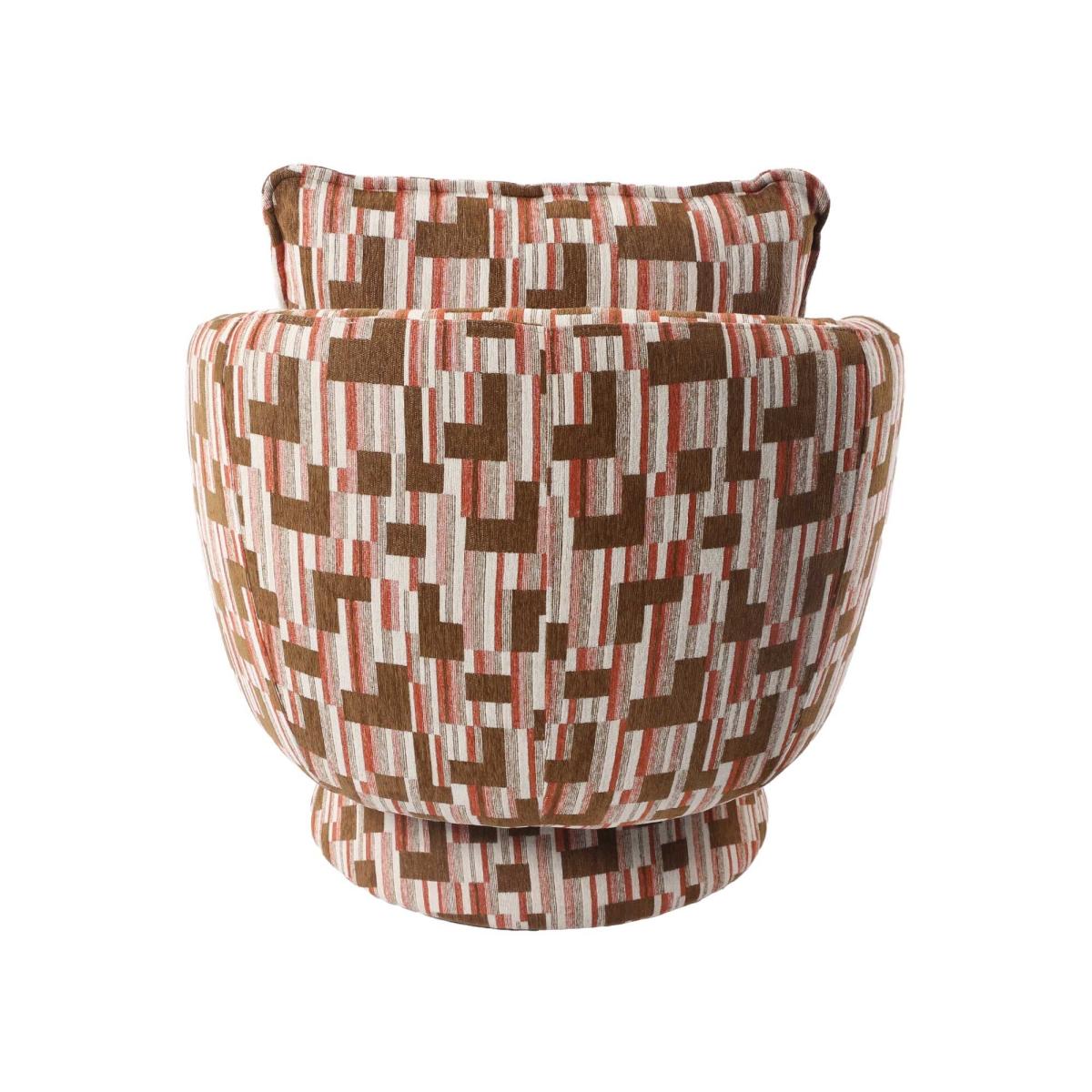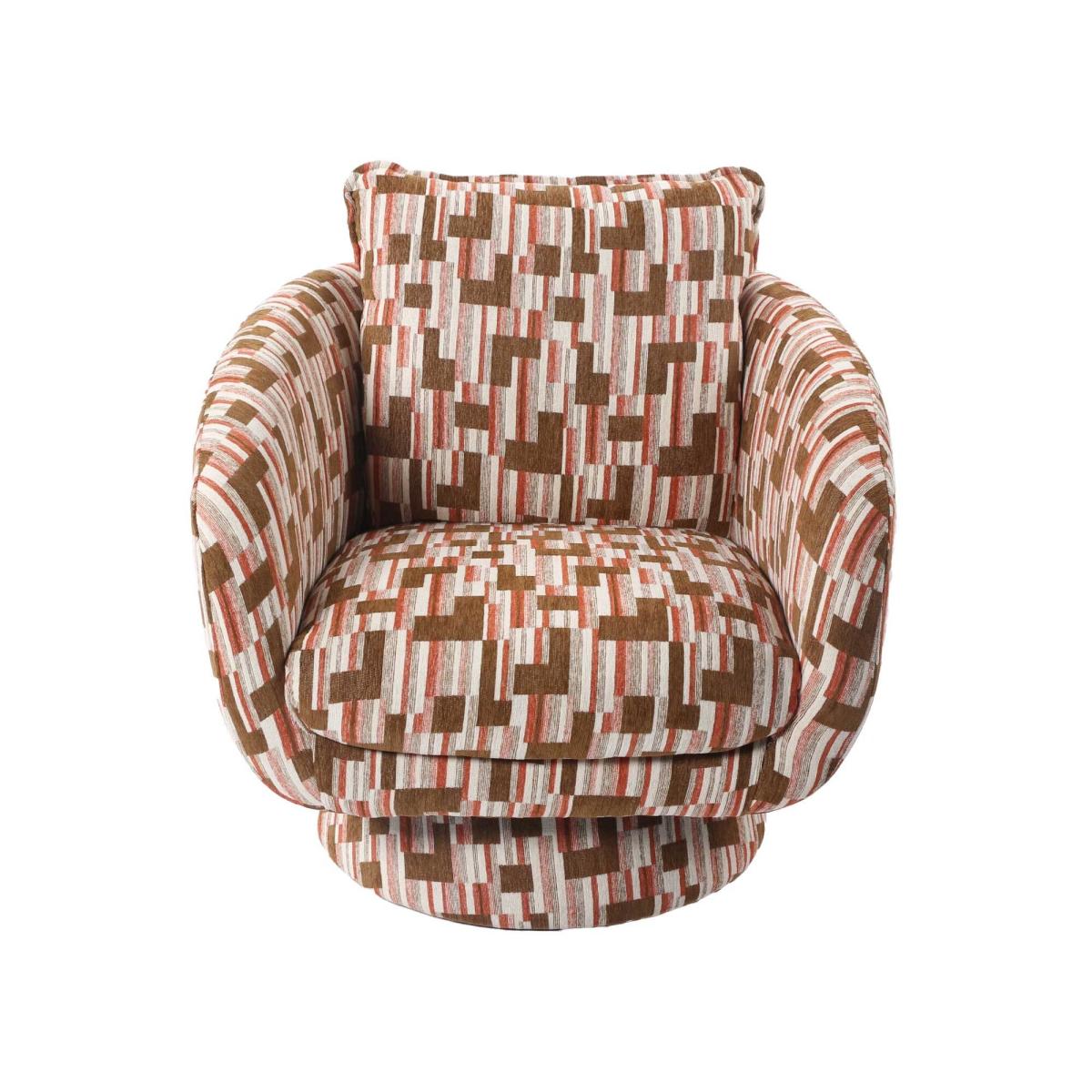Add bold personality and effortless comfort to your space with the Francois Patterned Brown Fabric Curved Swivel Chair. Wrapped in a striking geometric fabric in warm brown, rust, and cream tones, it brings mid-century flair with a modern twist. The curved back and plush cushioning offer cosy support, while the smooth swivel base adds versatility and function. Ideal for a reading nook, lounge corner, or statement seating, this chair blends comfort, style, and movement in one eye-catching piece. A perfect choice for those who love standout design with everyday usability