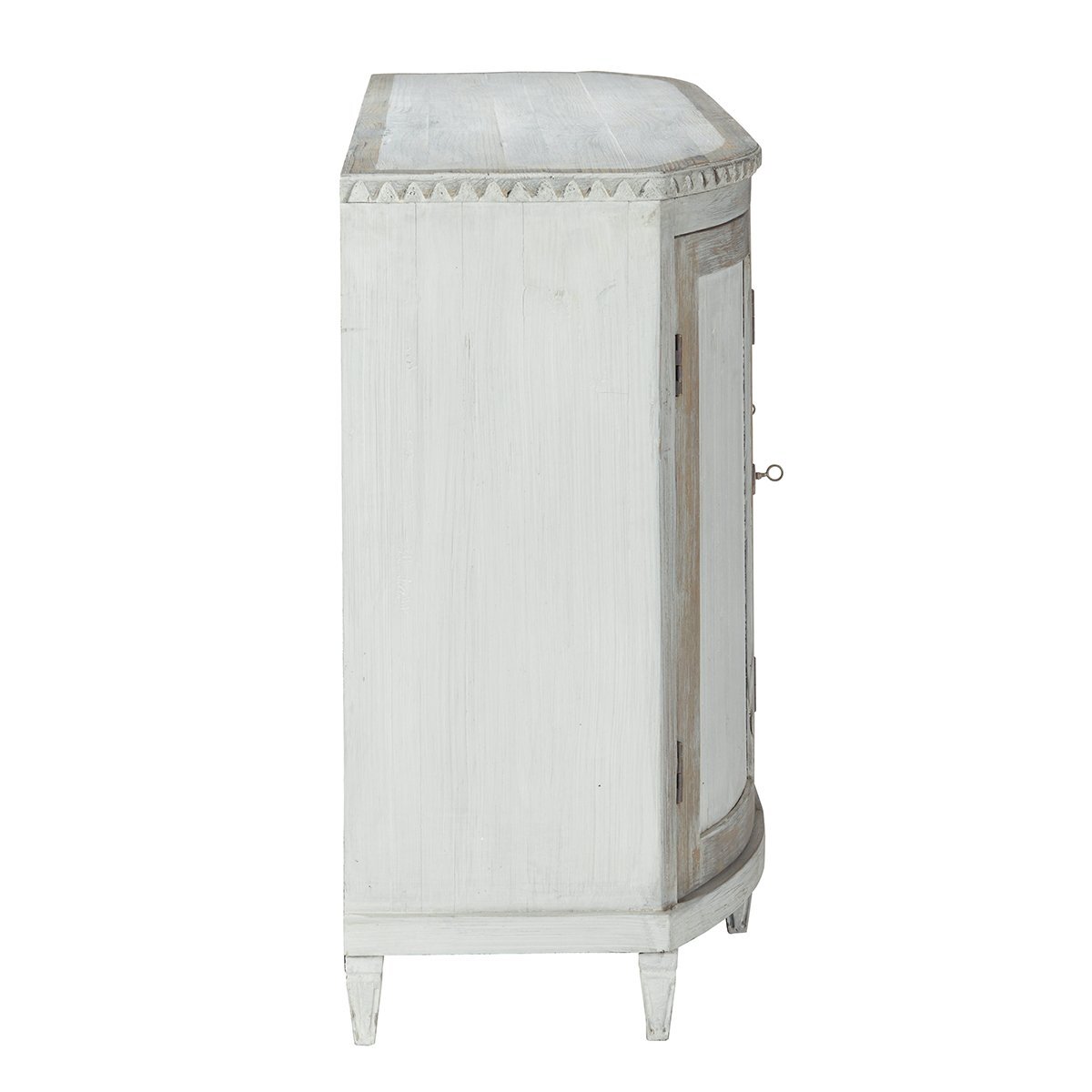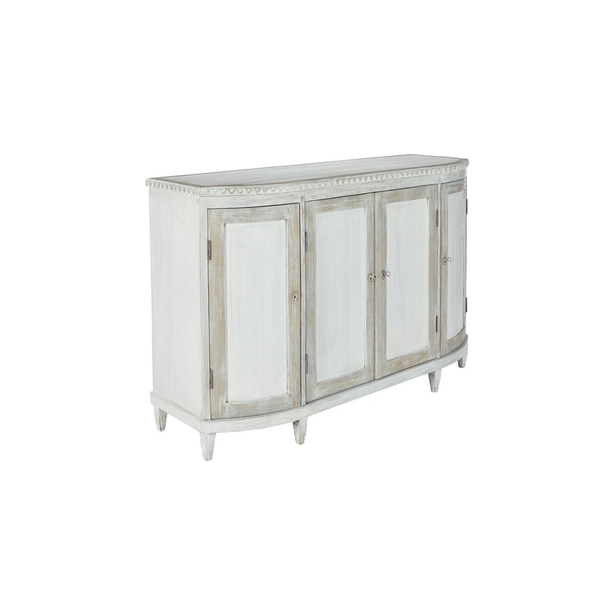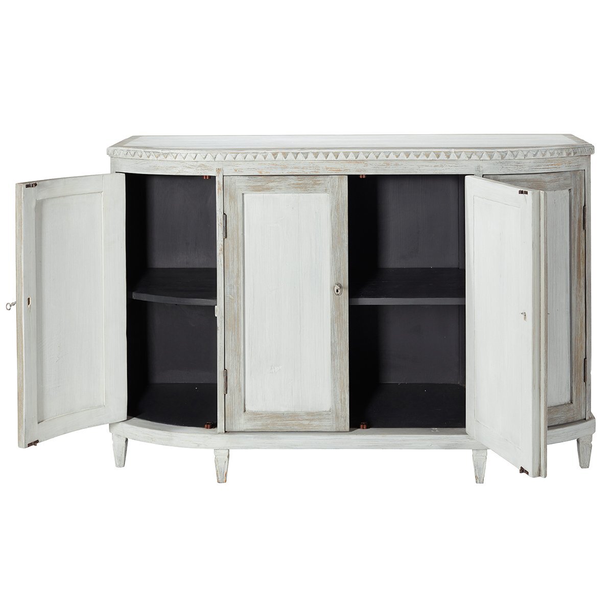 Handmade from recycled pine, this curved sideboard makes a feature of bunting-inspired detailing along its top edge. Hand-painted in a cloud wash with a rustic finish, it boasts a central double cupboard sandwiched between two single cupboards, offering plenty of storage for tableware in a dining room or board games and toys in a hallway or living room.