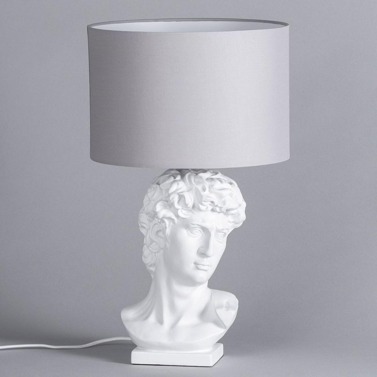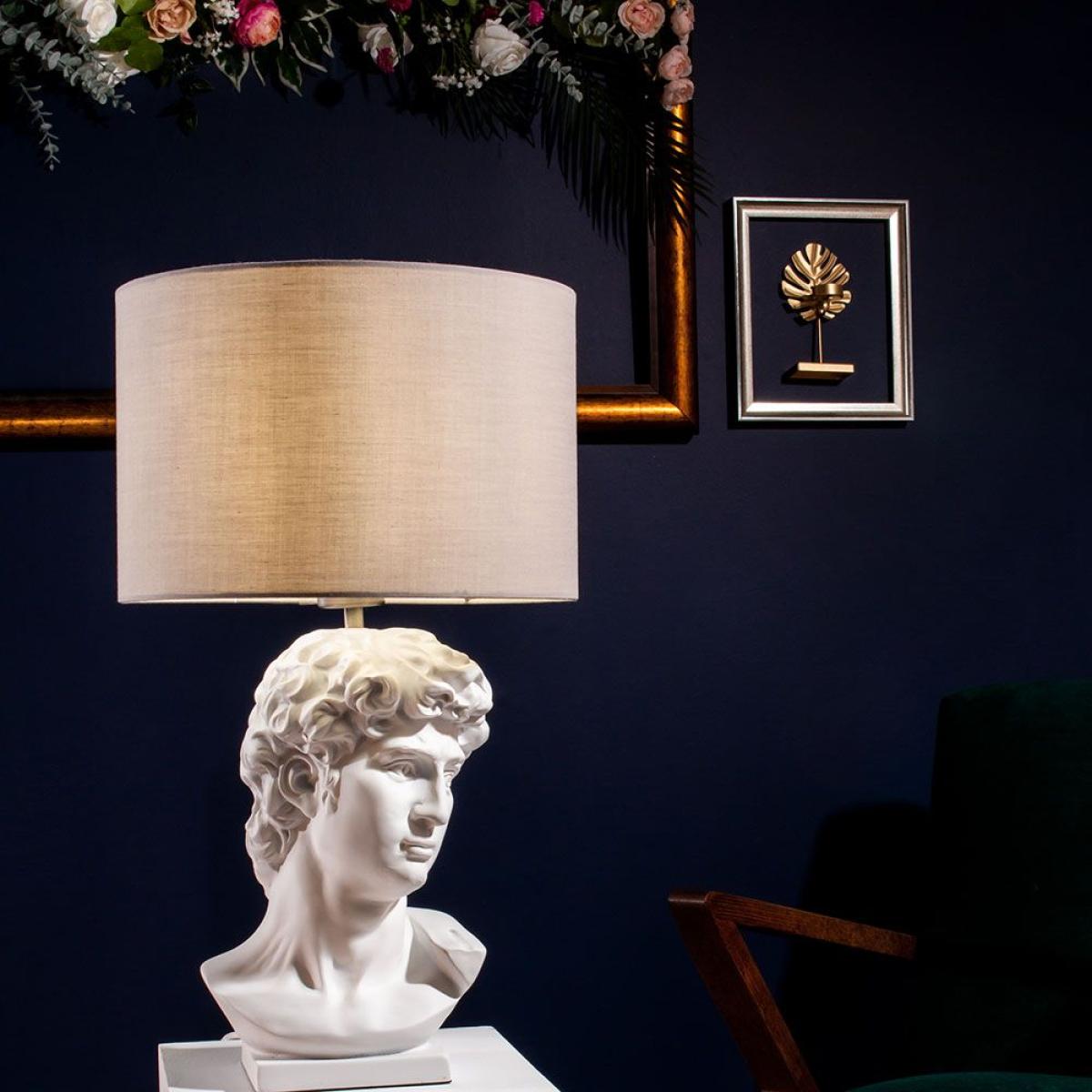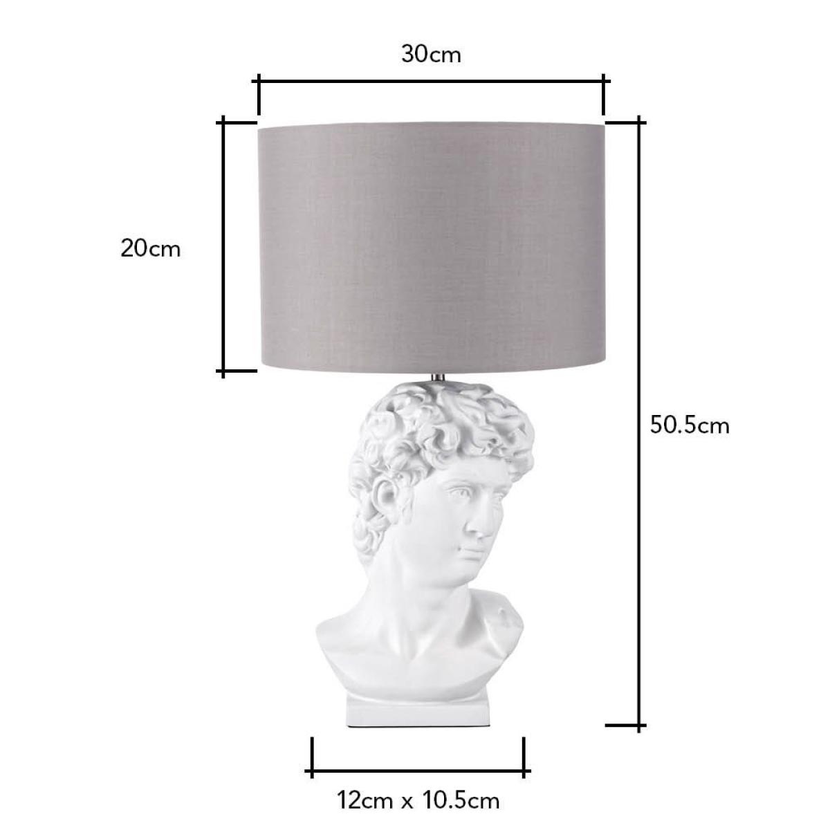 Welcome Frank Bust into your home; the traditional table lamp that will bring a hint of culture and style to your décor. This table lamp has a matte chalk white finish, creating a traditional, artistic aesthetic. The sculptured lamp base is made up of a detailed head that supports a stunning grey lamp shade which is the perfect choice for accentuating a simple grey colour scheme. This lamp would perfectly complement a home office or console table, where it would help invoke a light and relaxing environment.