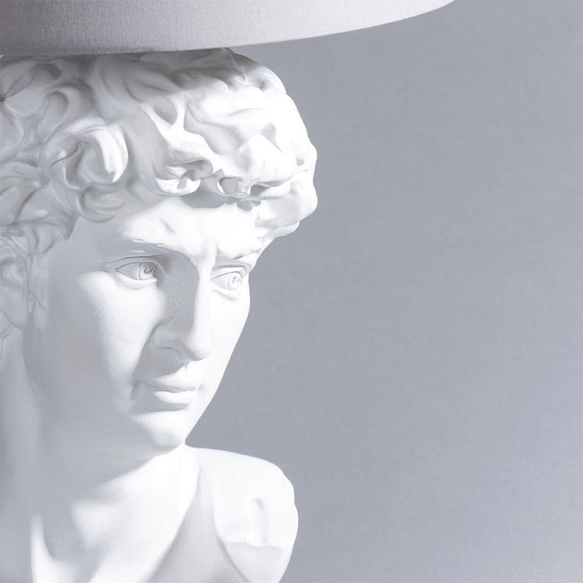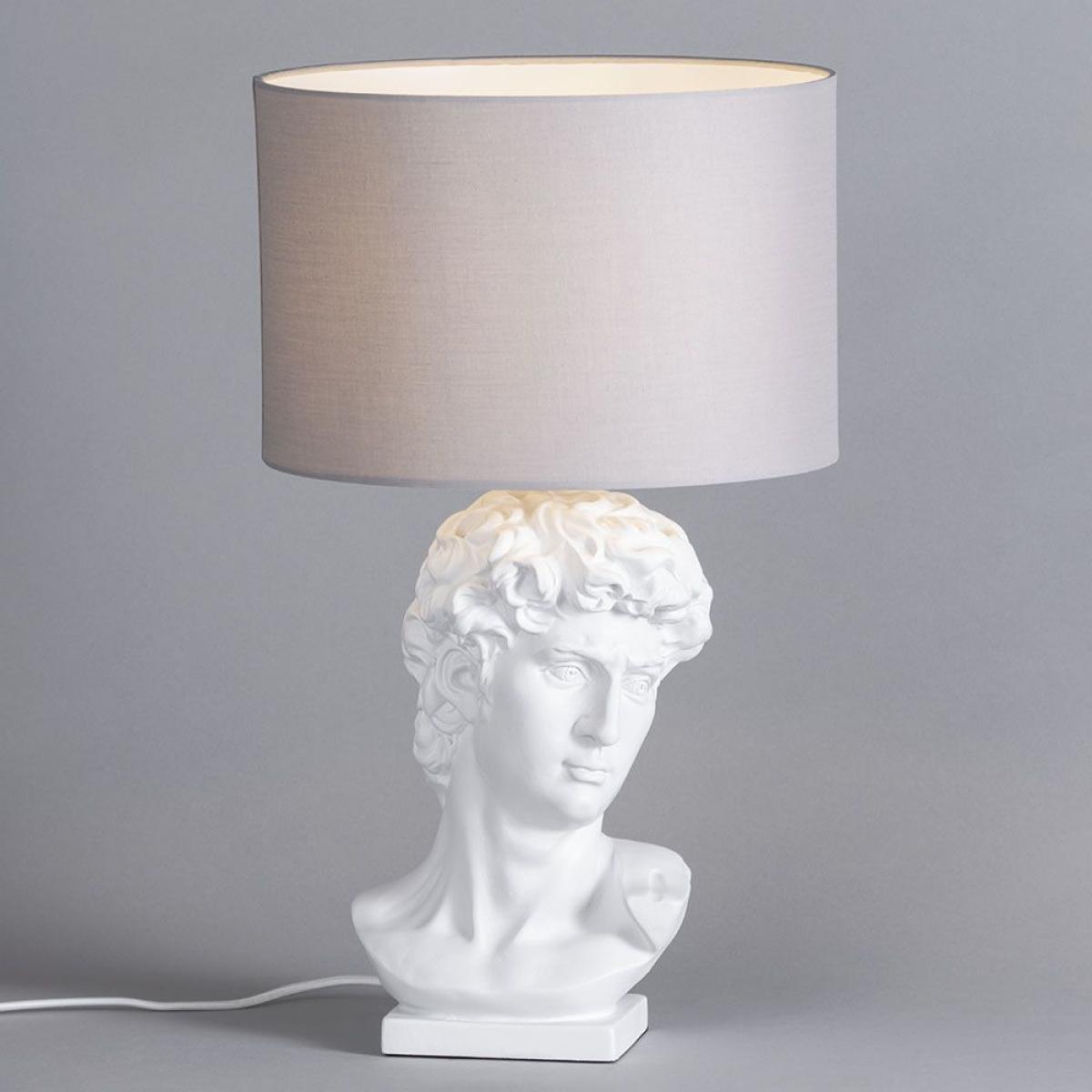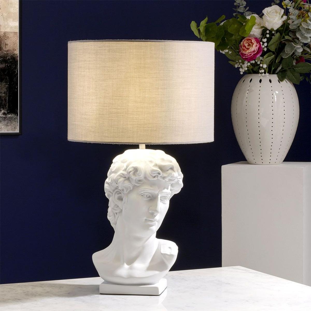 Welcome Frank Bust into your home; the traditional table lamp that will bring a hint of culture and style to your décor. This table lamp has a matte chalk white finish, creating a traditional, artistic aesthetic. The sculptured lamp base is made up of a detailed head that supports a stunning grey lamp shade which is the perfect choice for accentuating a simple grey colour scheme. This lamp would perfectly complement a home office or console table, where it would help invoke a light and relaxing environment.