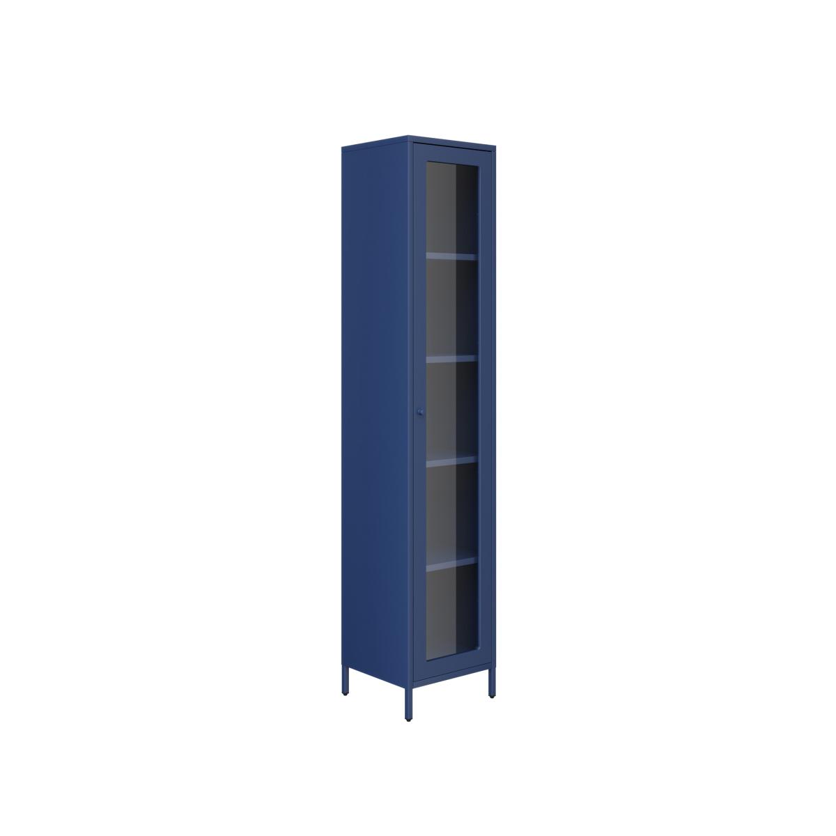 Add a pop of colour to your decor with the Frank Display Cabinet. Featuring a classic blue finish with steel construction, this display cabinet adds an industrial touch to your furnishings. The clear glass panels allow you to showcase your prized possessions in the living room or store fragile and pretty utensils in the kitchen. This display cabinet features a slim profile, making it suitable for compact spaces, while its versatile design complements most decors. The chic and fancy design adds to its charm, making it the conversation starter at gatherings and dinners.