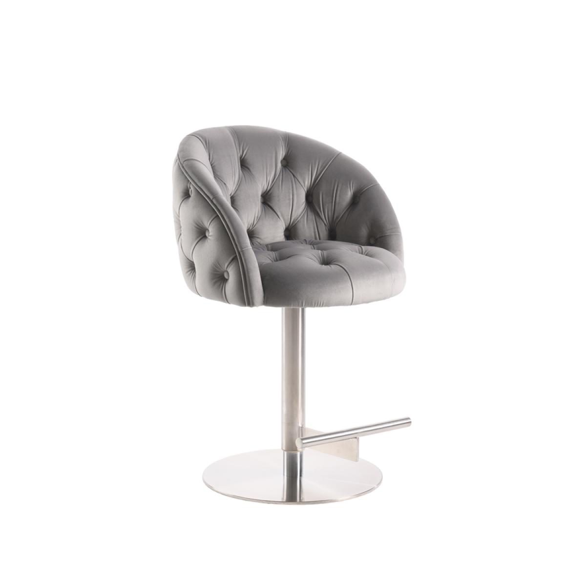 A skilfully handcrafted, deep buttoned stool with elegant curvaceous lines. Comfortable foam and fibre seat with sprung base. Brushed stainless steel base. Height adjust and swivel functions. Suitable for use as a bar or counter stool. Velvet upholstery fabric.