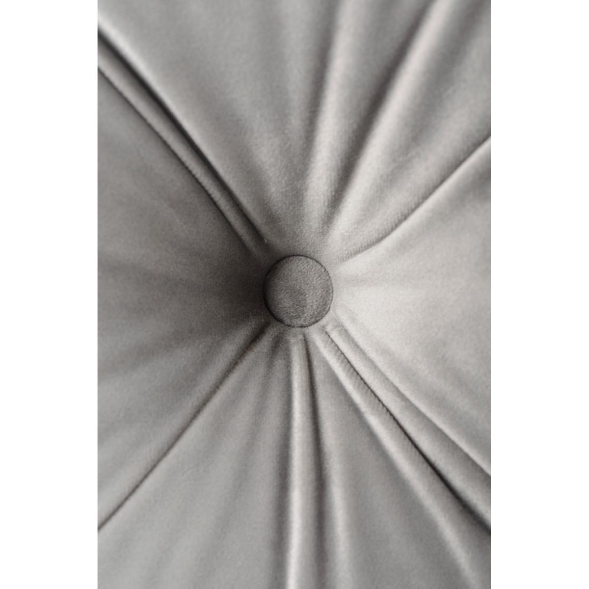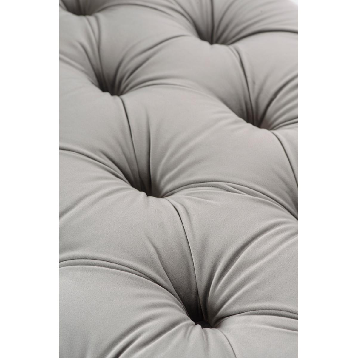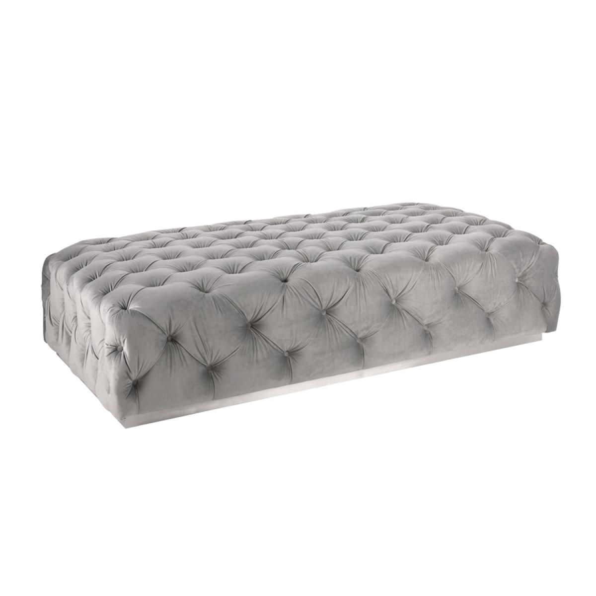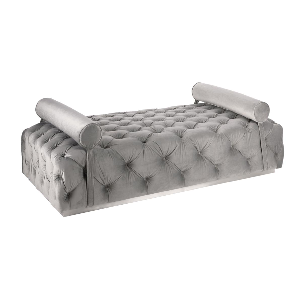 A skilfully handcrafted deep buttoned day bed. Two removable bolster cushions. Comfortable foam and fibre seat with sprung base. Brushed stainless steel base. Velvet upholstery fabric.