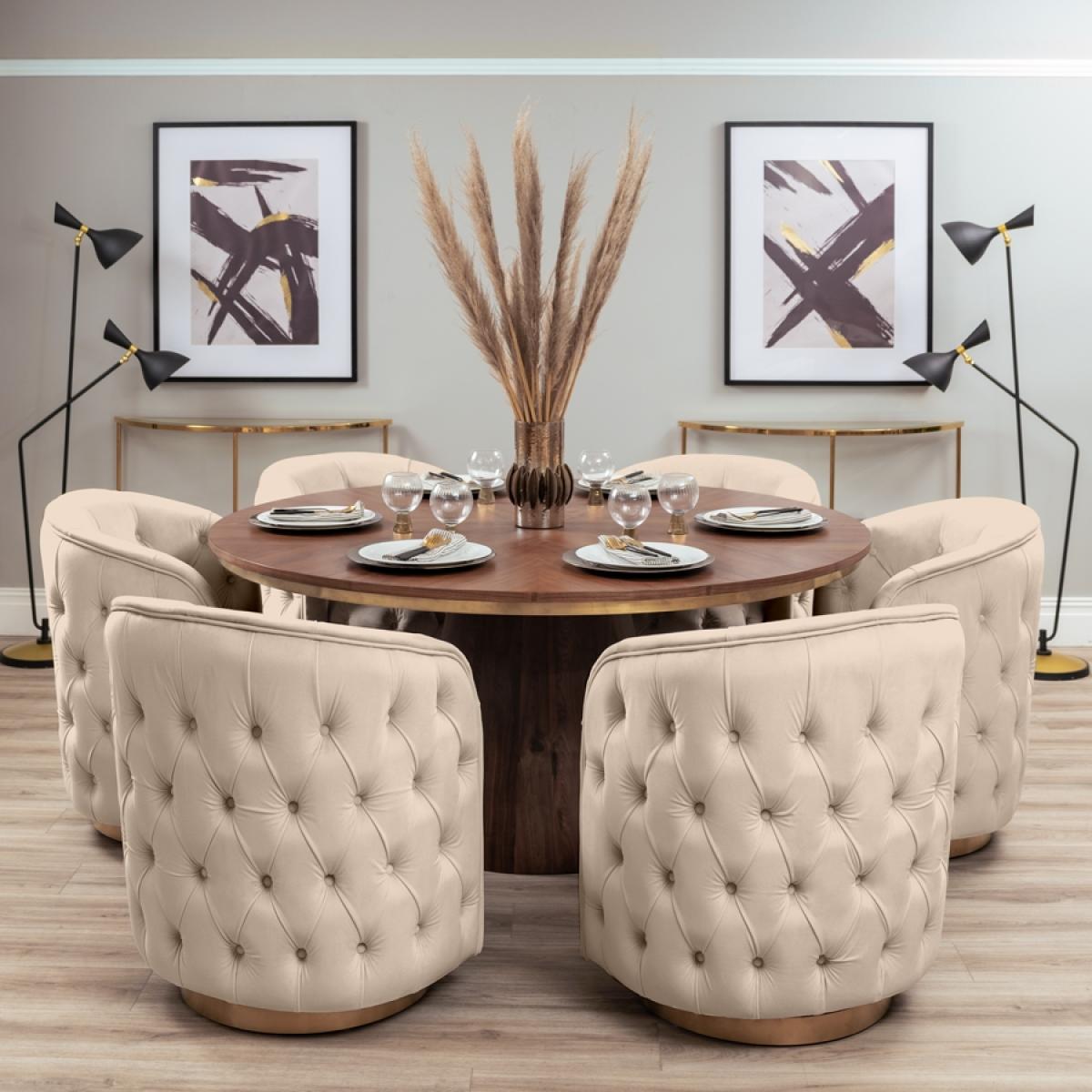 I’m a fan of the chalk-velvet chair with its low-slung profile and brass plinth - it brings a soft, tactile contrast to harder surfaces. Its neutral tone and smooth curves suit contemporary classic, art-deco or Scandi-inspired dining rooms. For styling, tuck it under a dark timber or marble table to let the brass pop, and add a slim brass or matte-black side lamp nearby. If you want a little extra comfort, drape a fine-knit wool throw over the back or swap in a patterned scatter cushion in muted tones.