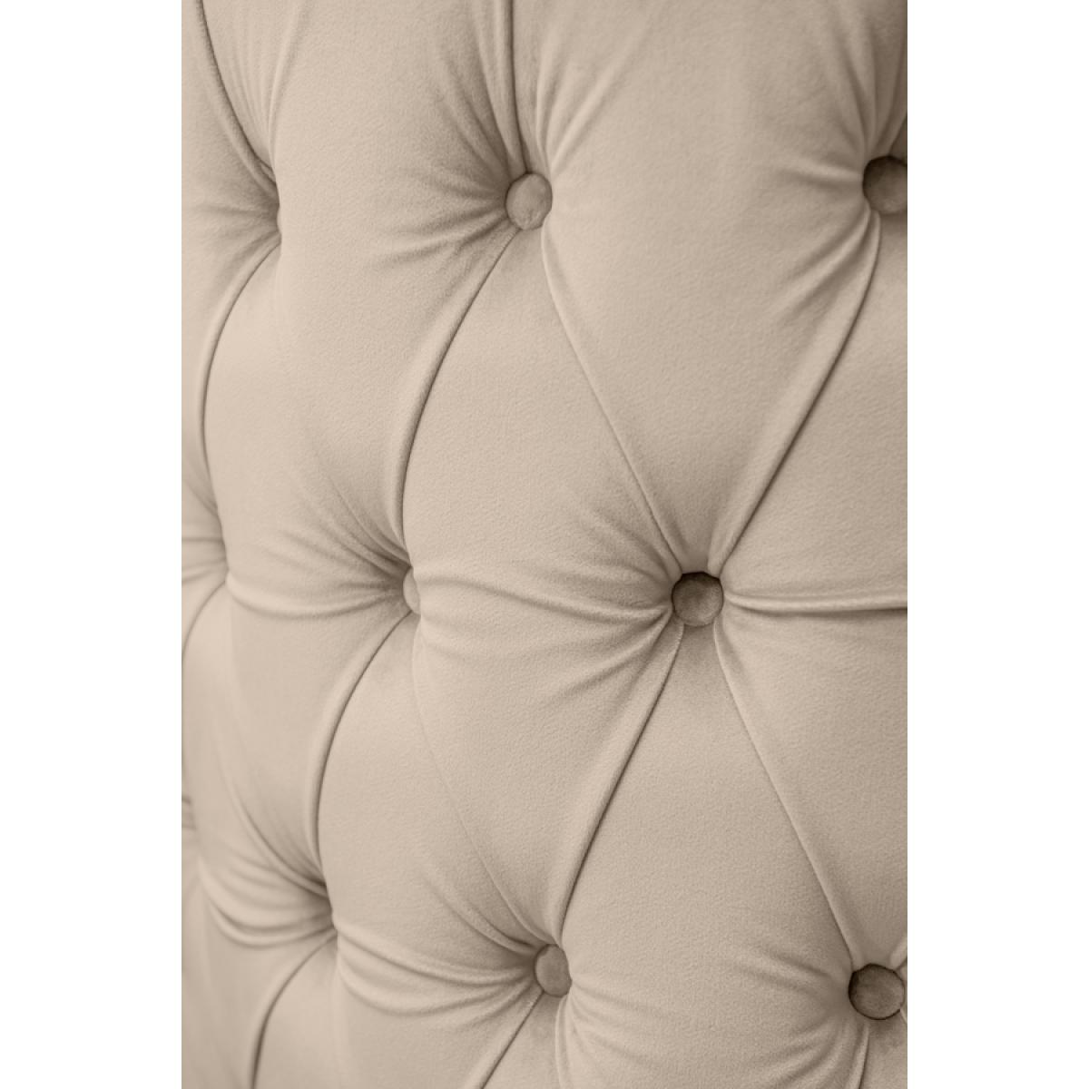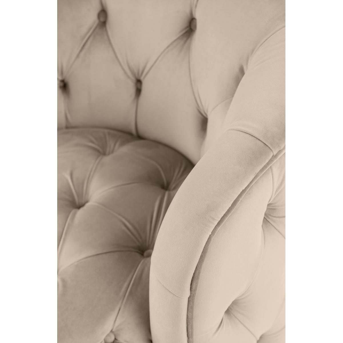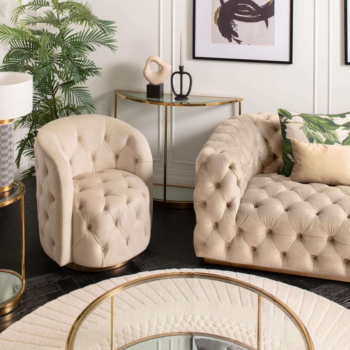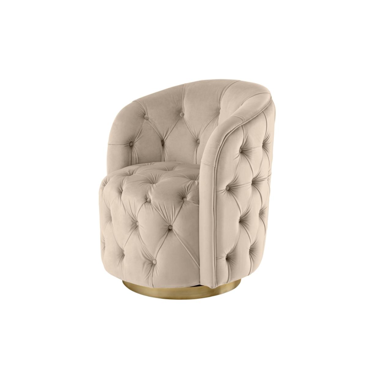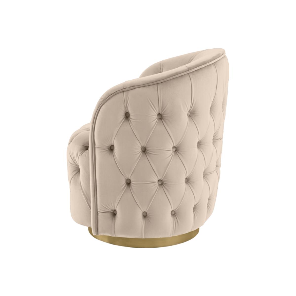 A skilfully handcrafted deep buttoned chair with elegant curvaceous lines. Generous proportion, also suitable for use as a compact armchair. Sprung base with comfortable deep foam and fibre filling. Brushed brass base with 360° swivel function. Velvet upholstery fabric.