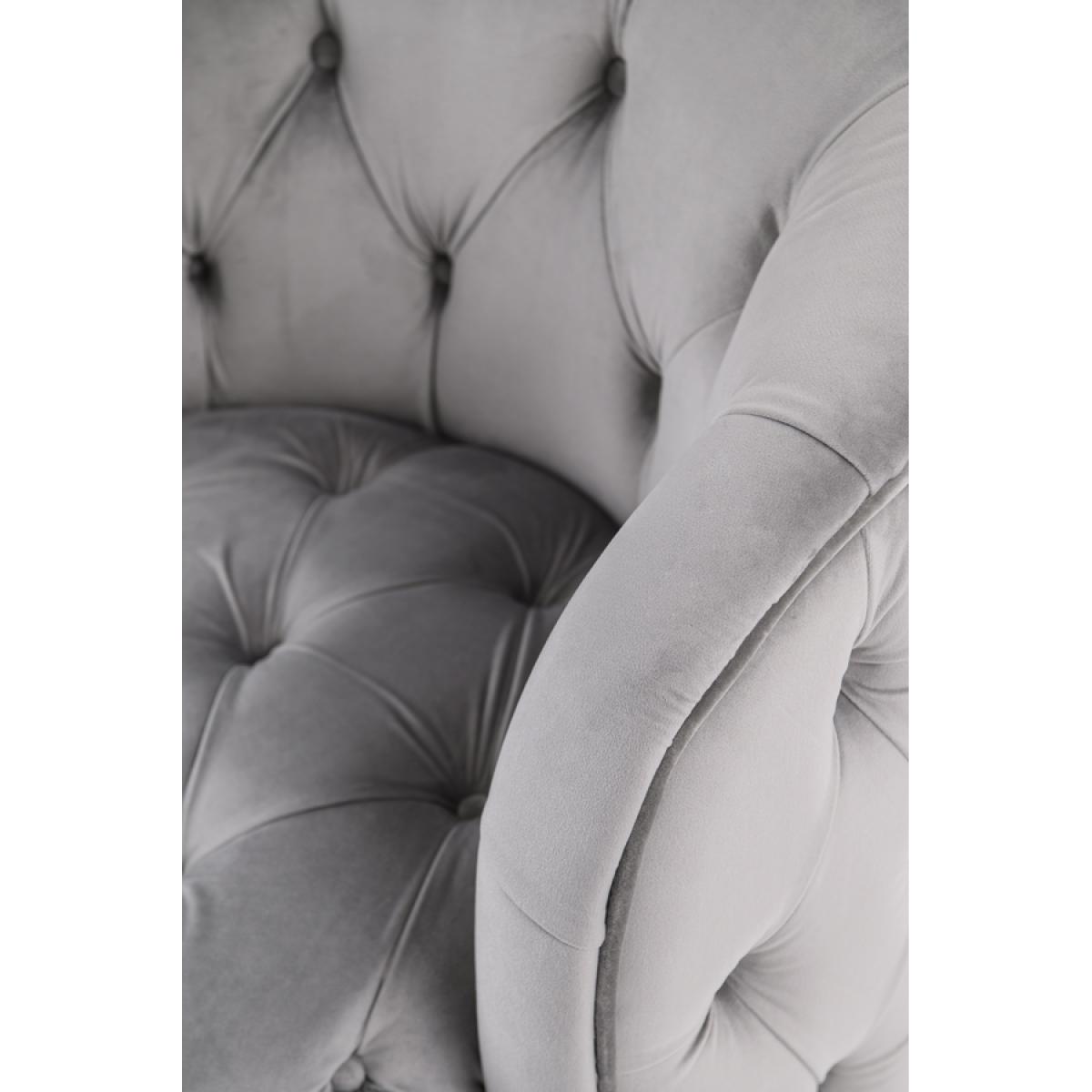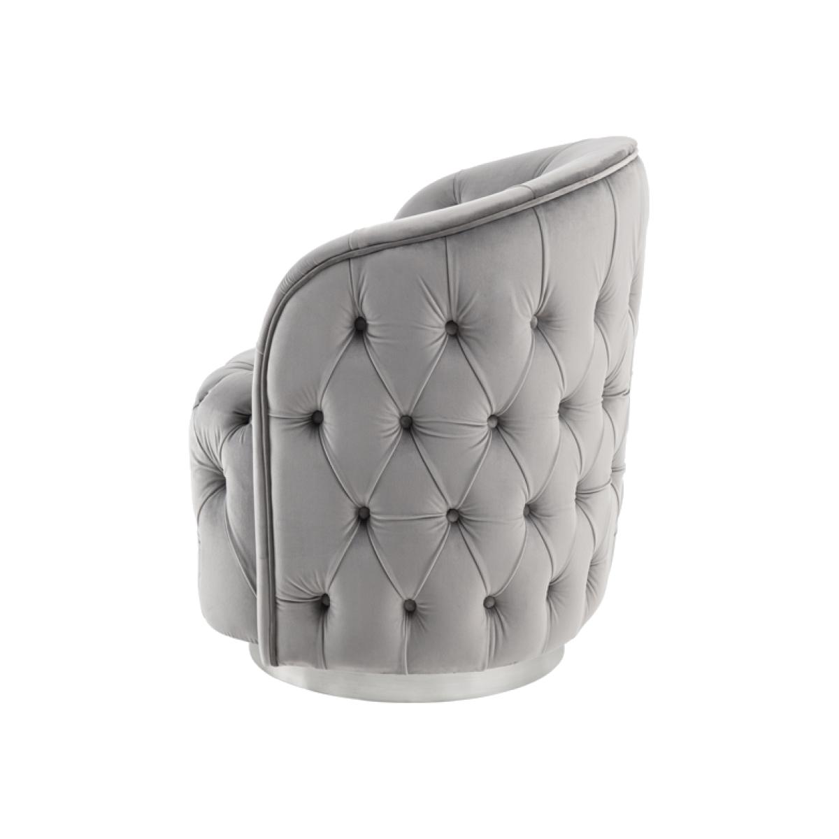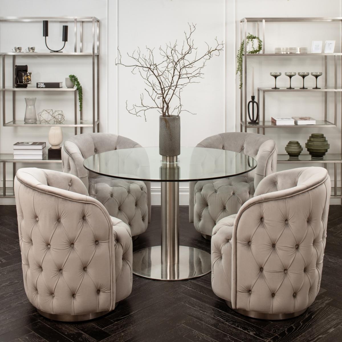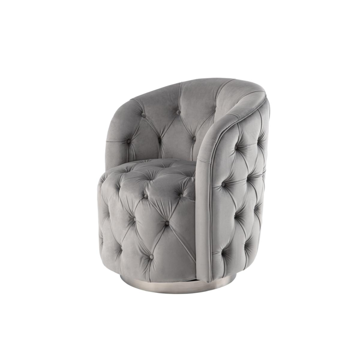 A skilfully handcrafted deep buttoned chair with elegant curvaceous lines. Generous proportion, also suitable for use as a compact armchair. Sprung base with comfortable deep foam and fibre filling. Brushed stainless steel base with 360° swivel function. Velvet upholstery fabric.