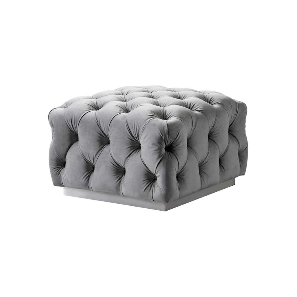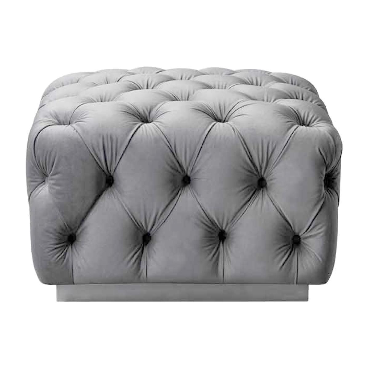 Designed to be used alone or as an extension to the Frankfurt sofa (effectively transforming it into a corner sofa). Skilfully handcrafted with traditional deep buttoning. Sprung base with comfortable foam and fibre top. Brushed stainless steel base. Velvet upholstery fabric.