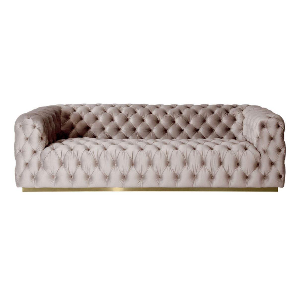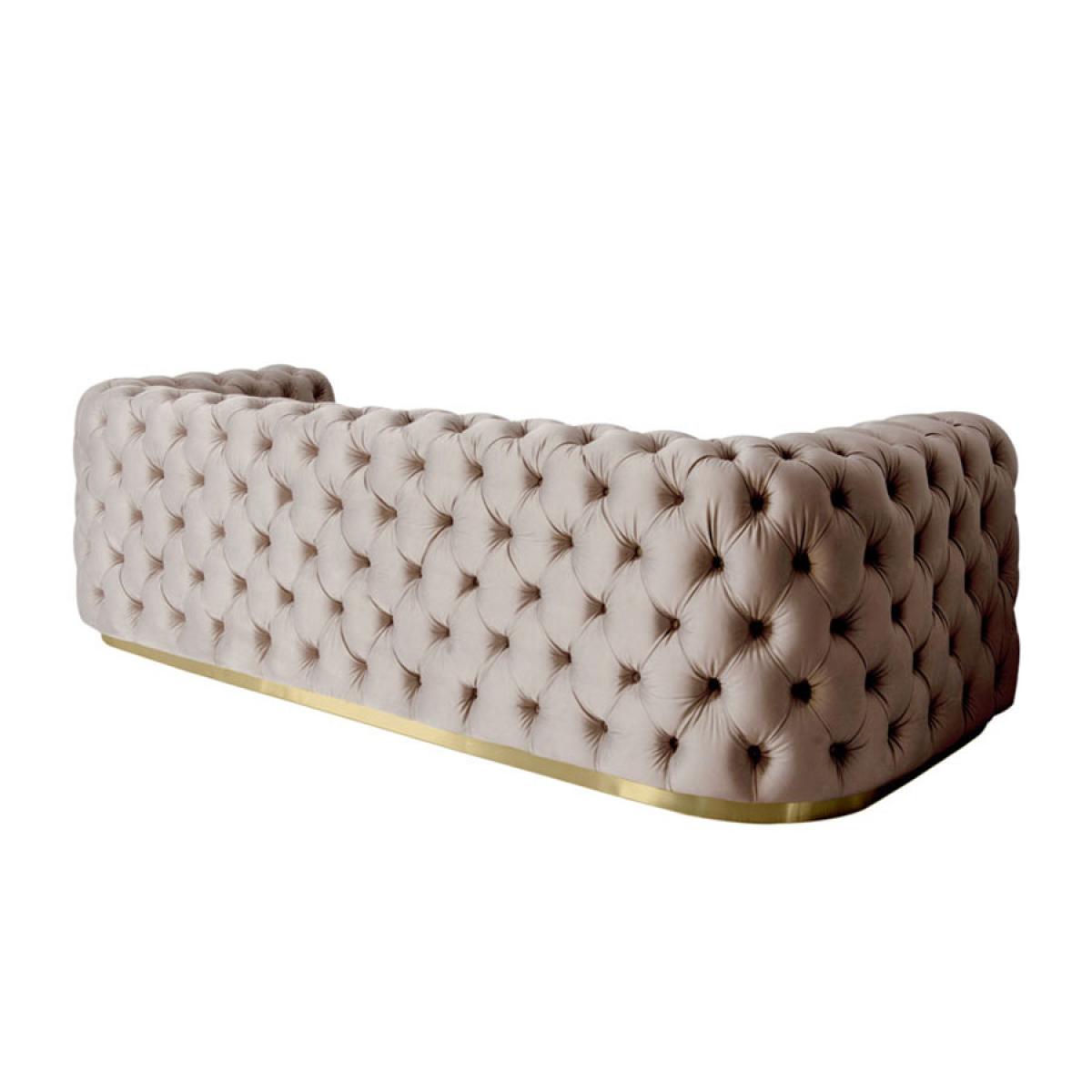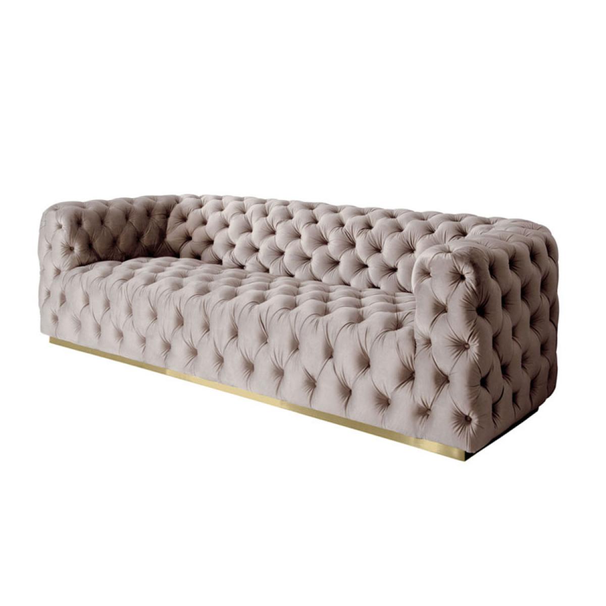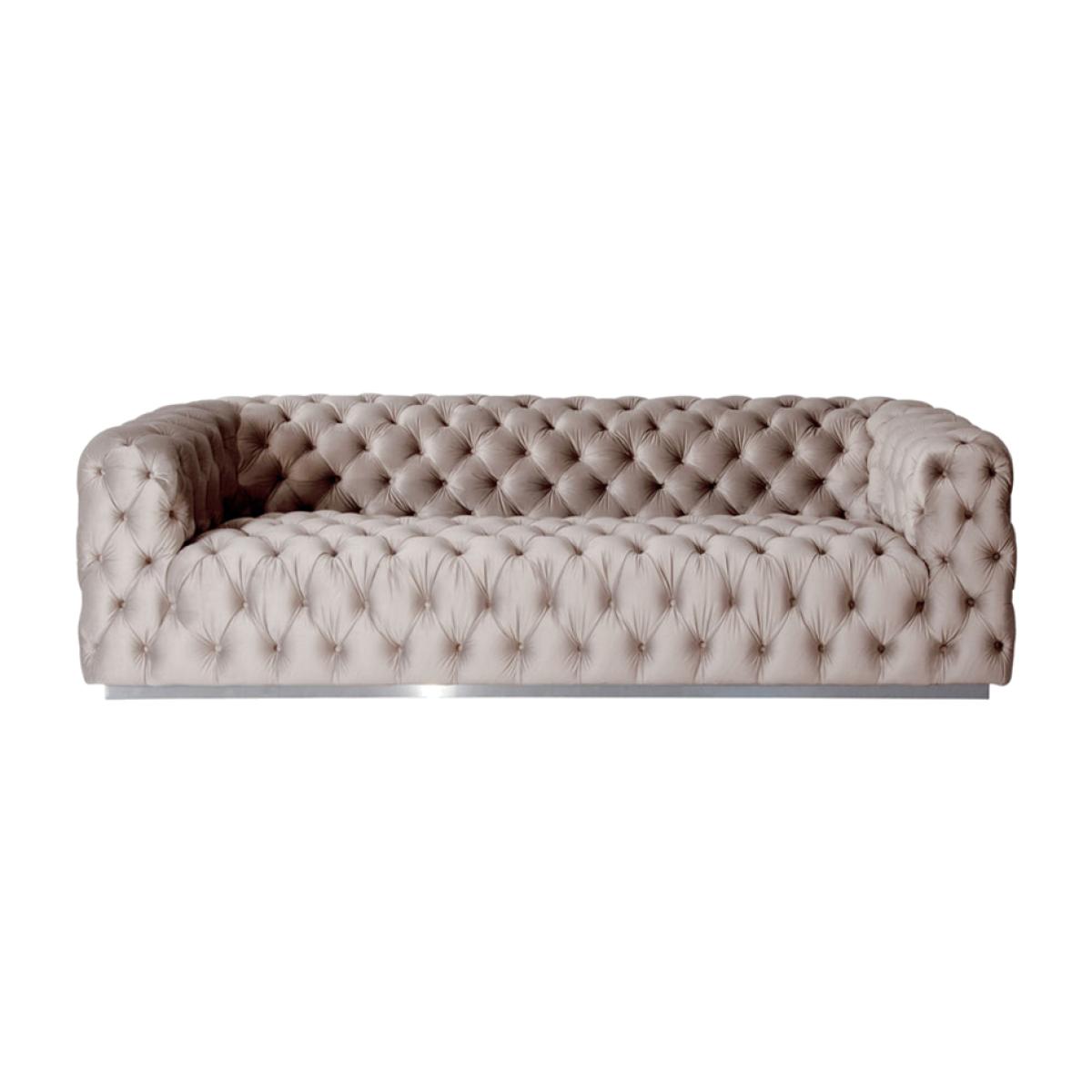 Available with silver or gold finish base. Please contact us after purchasing to clarify which base you prefer, quoting your order number. Should we not hear from you the silver base will be dispatched as default. Email: customerservice@my-furniture. Comcustomerservice@my-furniture. Com. A skilfully handcrafted, deep buttoned sofa with elegant curvaceous lines. Comfortable foam and fibre seat with sprung base. Brushed stainless steel base. Velvet upholstery fabric. Delivered assembled. Please note, due to the generous size of this sofa we advise that you check your doorway dimensions prior to purchasing to ensure a smooth installation.