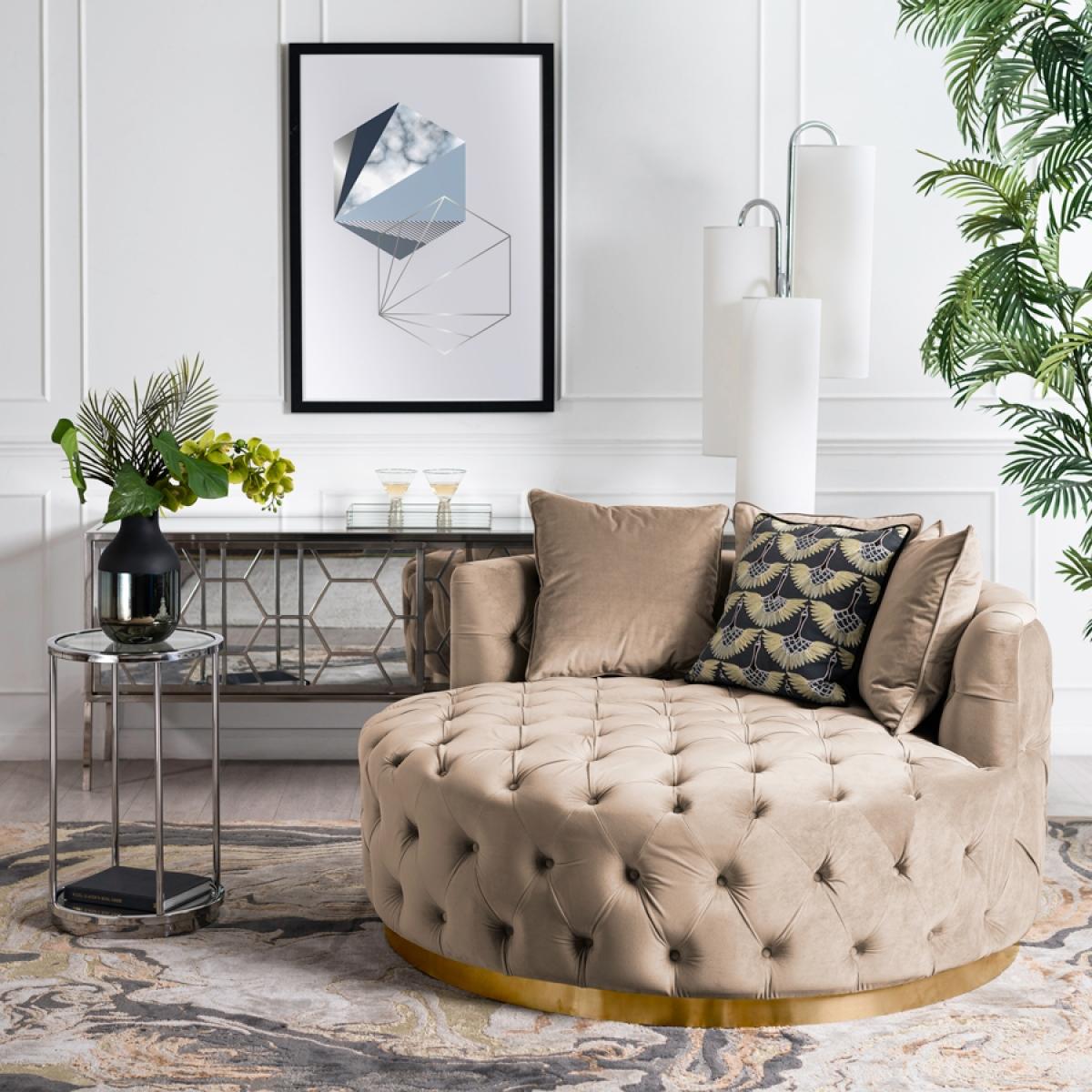A skilfully handcrafted, deep buttoned loveseat. This large scale loveseat will comfortably fit two adults with their legs stretched out – perfect for snuggling up on to watch movies and box sets. Comfortable foam and fibre seat with sprung base. Brushed stainless steel base with brass finish. Velvet upholstery fabric. Supplied fully assembled.