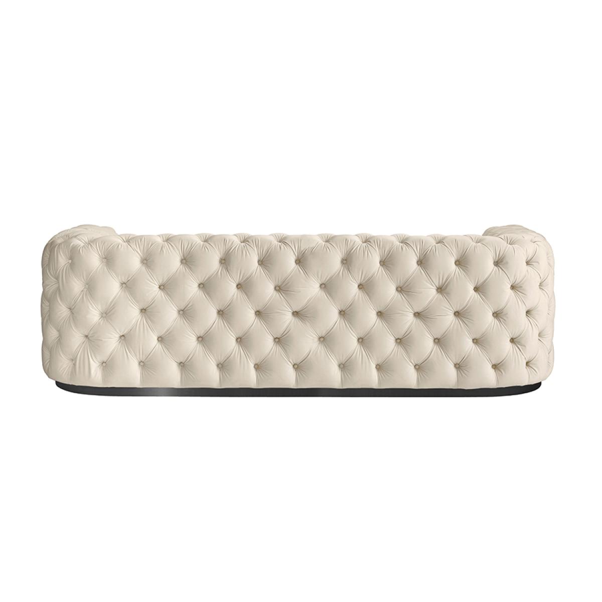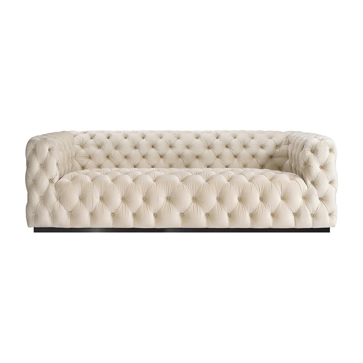 A skilfully handcrafted, deep buttoned sofa with elegant curvaceous lines. Comfortable foam and fibre seat with sprung base. Matt black steel base. Velvet upholstery fabric. Delivered assembled. Please note, due to the generous size of this of this sofa we advise that you check your doorway dimensions prior to purchasing to ensure a smooth installation. Free returns on sofas if you change your mind within 7 days. Simply notify us, put the sofa back in the box, and we will collect it and send you a full refund. (This offer excludes Scottish Highlands and islands & any Ireland addresses).