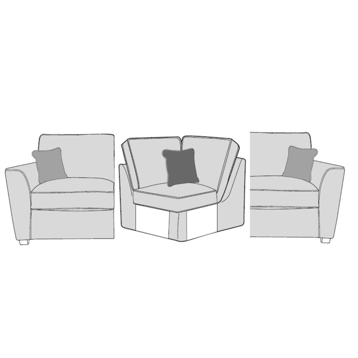 Buoyant Franklin is a contemporary designed suite with luxury firmer feel 'Foamflex' seat interiors, the range has a large choice of pieces including sofas & sofa corner groups available with sofa bed options. Extension units are available for all the sofa corner groups. This sofa includes a 1 seater left hand unit (L1), 1 corner unit (CO) and 1 right hand facing unit (R1) Scatter cushions available in Accent Fabrics Standard Back Also available as a Pillow back. Corner Sofa Dimensions: Height: 97cm Width: 194cm Depth: 194cm Please note, image are for illustration purposes only, for detailed information on components please see the Cover Guide image.  All screens vary in colour reproduction and whilst every effort has been made to display the colour as accurately as possible it is for guidance only.
