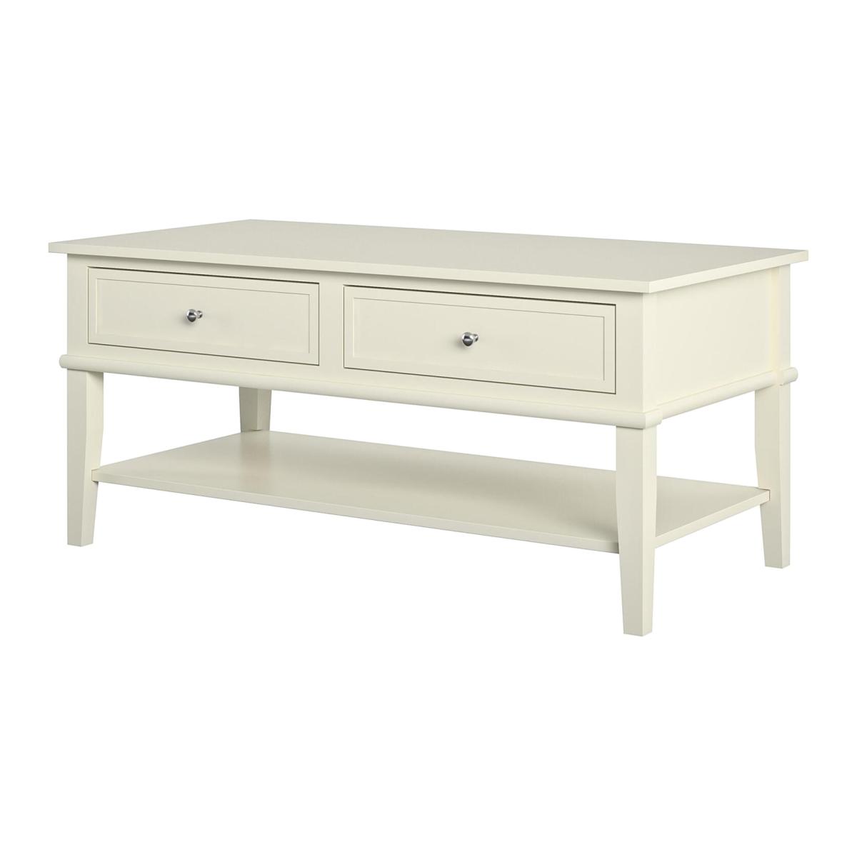 Keep your entertainment essentials nearby on the Franklin Coffee Table. Made of painted MDF and solid wood legs, the black can easily be added to your existing decor. The decorative moulding and tapered legs give this Table an elegant look for an instant upgrade for your living space. The spacious tabletop offers plenty of room for your remotes, decorations, and tablets. The open lower shelf is perfect for books and magazines or extra blankets. The Table features 2 drawers to store away small items and electronics to keep your tabletop clutter-free. Finish your living room with the entire Franklin collection and make your house a home, each sold separately.