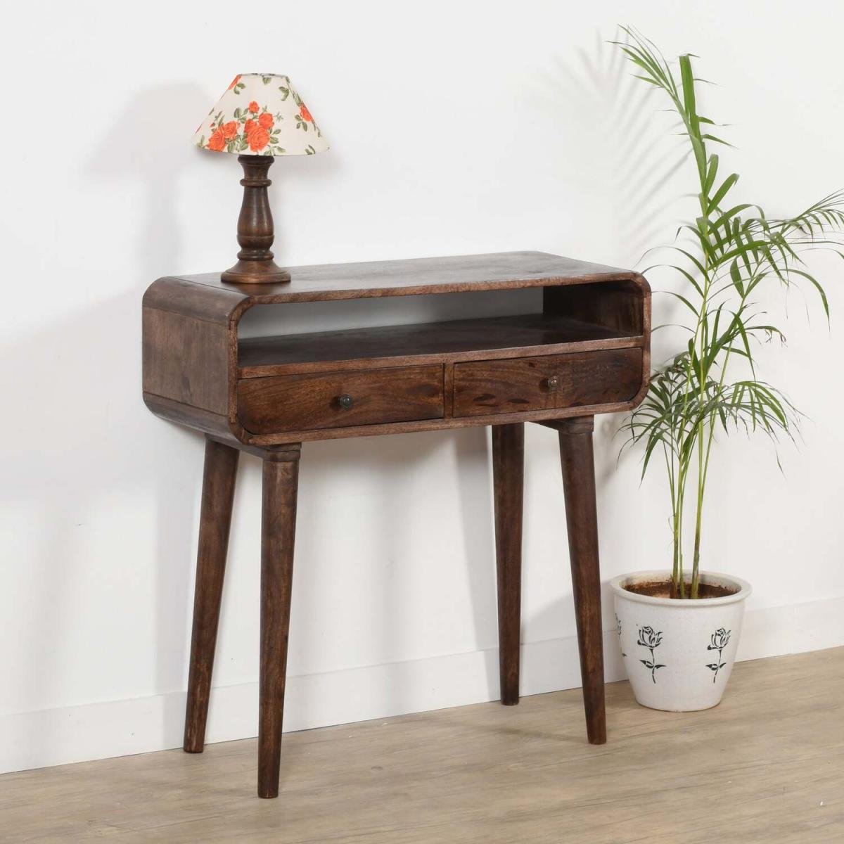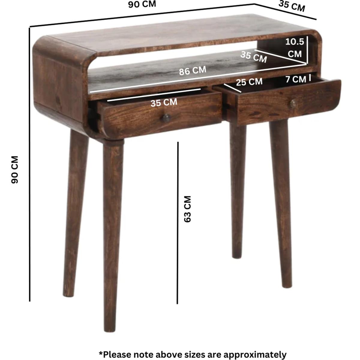 Introducing the Handmade Franklin Dark Mango Wood Console Table with 2 Drawers, a beautifully crafted piece of furniture that offers both style and practicality. Made from high-quality mango wood, this console table is built to last and is sure to become a treasured part of your home decor. Measuring 90x35x90 CM (LxDx. H), this console table provides ample space for displaying your decorative items or storing your essentials. It comes with limited assembly required, so you can quickly and easily set it up and start using it right away. The console table features a sleek and modern design with a lacquered finish that adds a touch of elegance to any room. It has two spacious drawers that open smoothly and provide easy access to your belongings. The drawers are equipped with sturdy metal handles that complement the overall design of the console table. Whether you're looking for a functional piece of furniture for your hallway, living room, or bedroom, the Handmade Franklin Dark Mango Wood Console Table with 2 Drawers is the perfect choice. Its high-quality materials, unique design, and durable construction ensure that you're getting a piece of furniture that is both beautiful and practical.