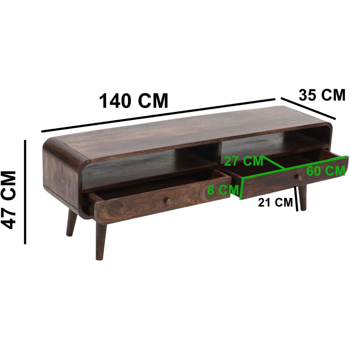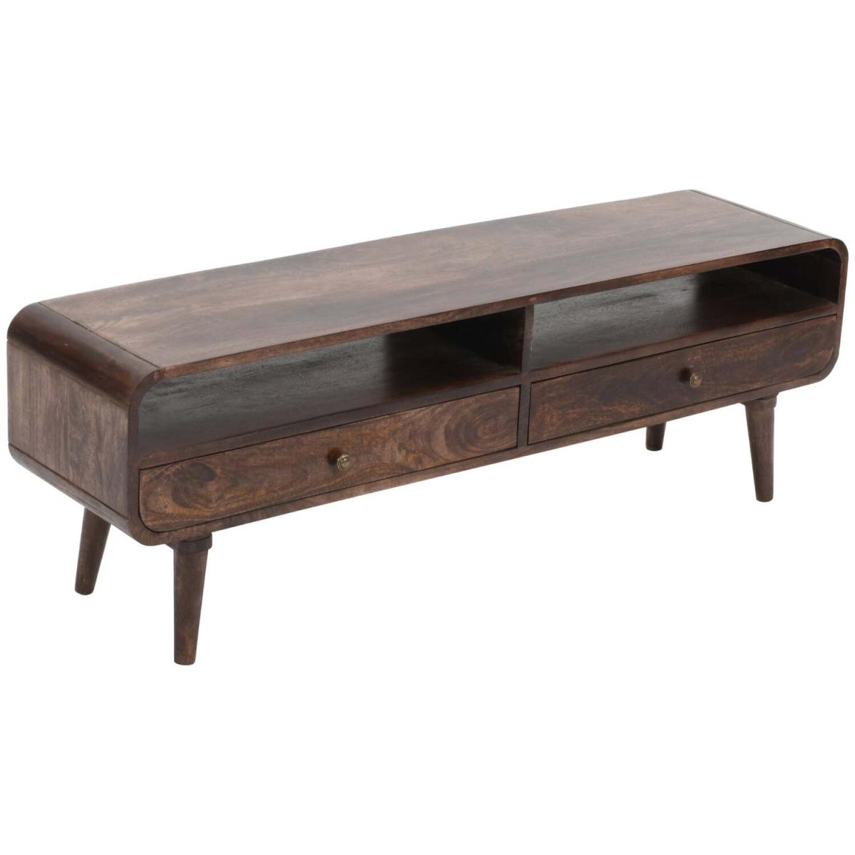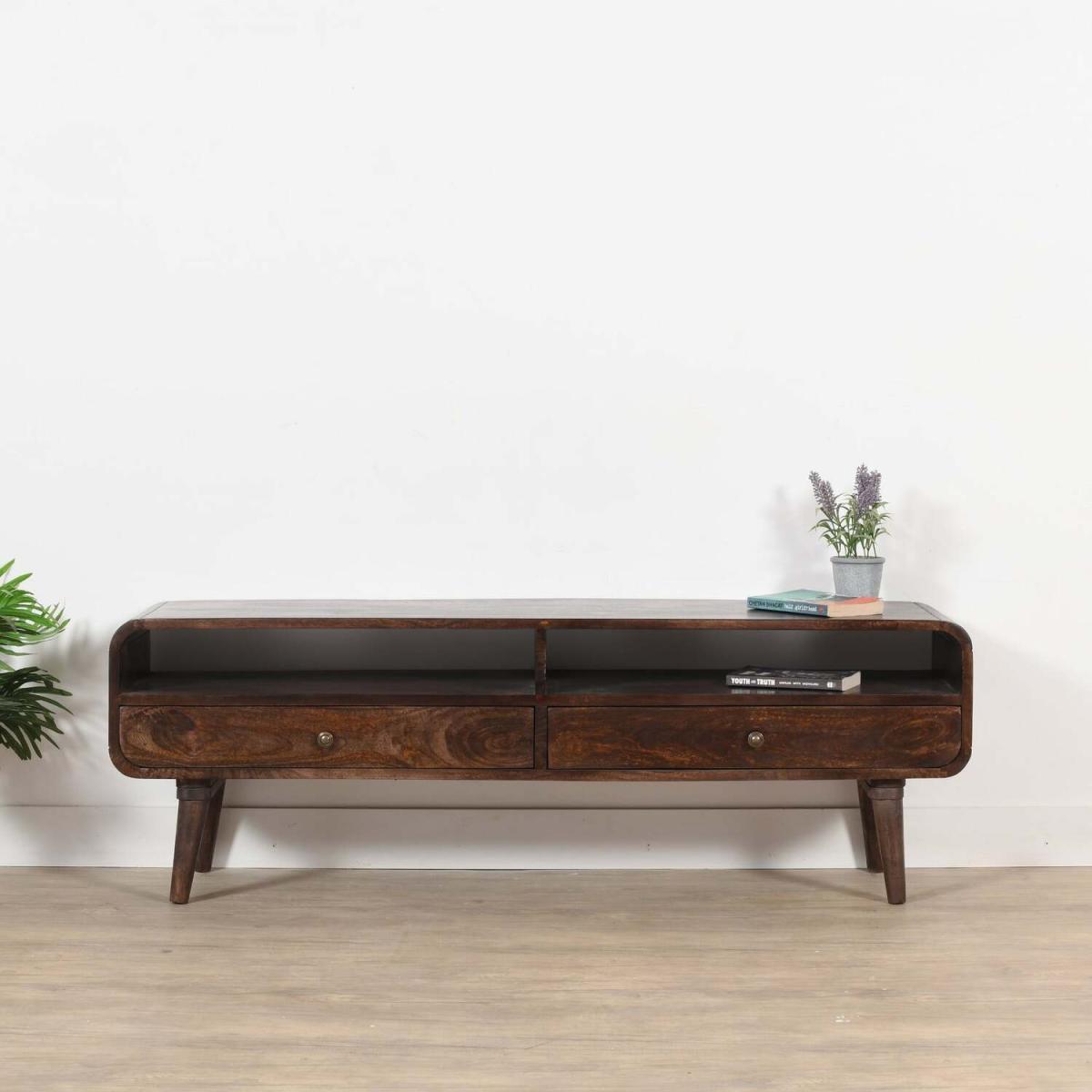 This dark mango TV stand is designed to hold a larger TV and is wider than the alternative smaller version in this range. The style is ageless and will blend in well with any existing decor you may already have. The beautifully crafted rounded edges provide a softer look and feel to this item which also features 2 good sized drawers to store all your remotes, game controllers whilst not in use. The open shelf is ideal for any gaming media equipment you may have. Handmade by skilled craftsmen in India making each piece individual and unique.