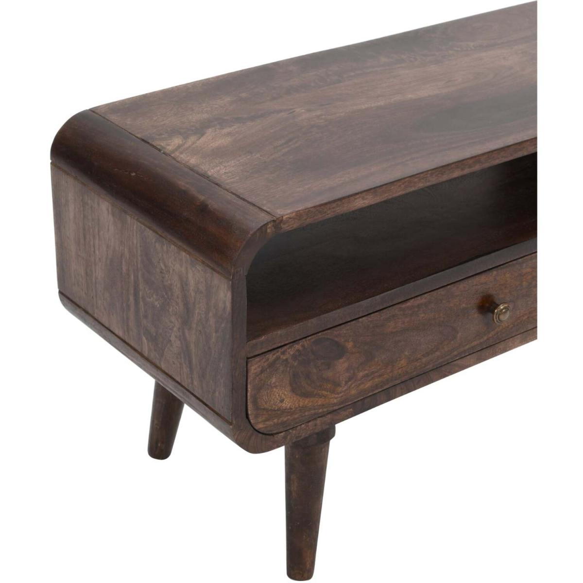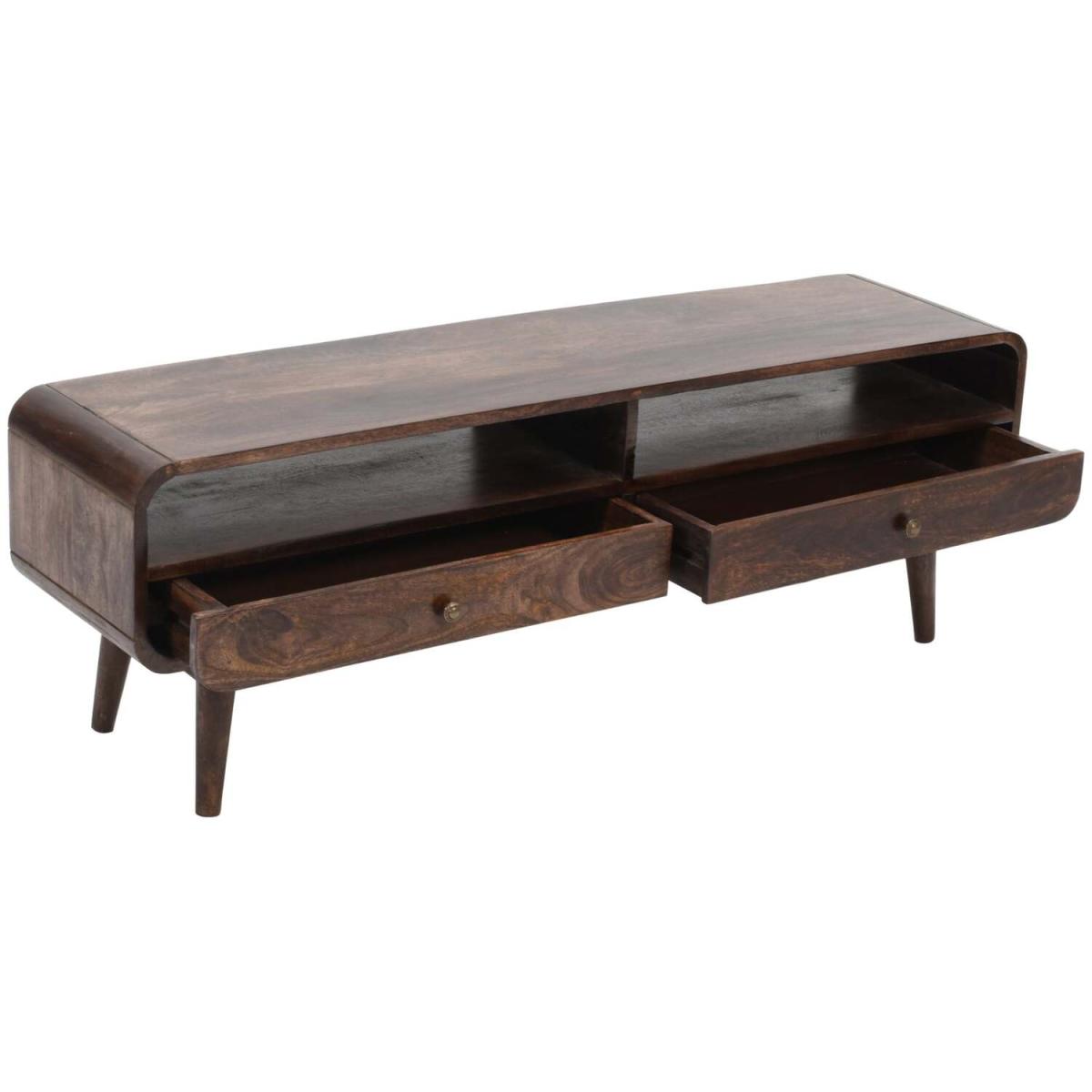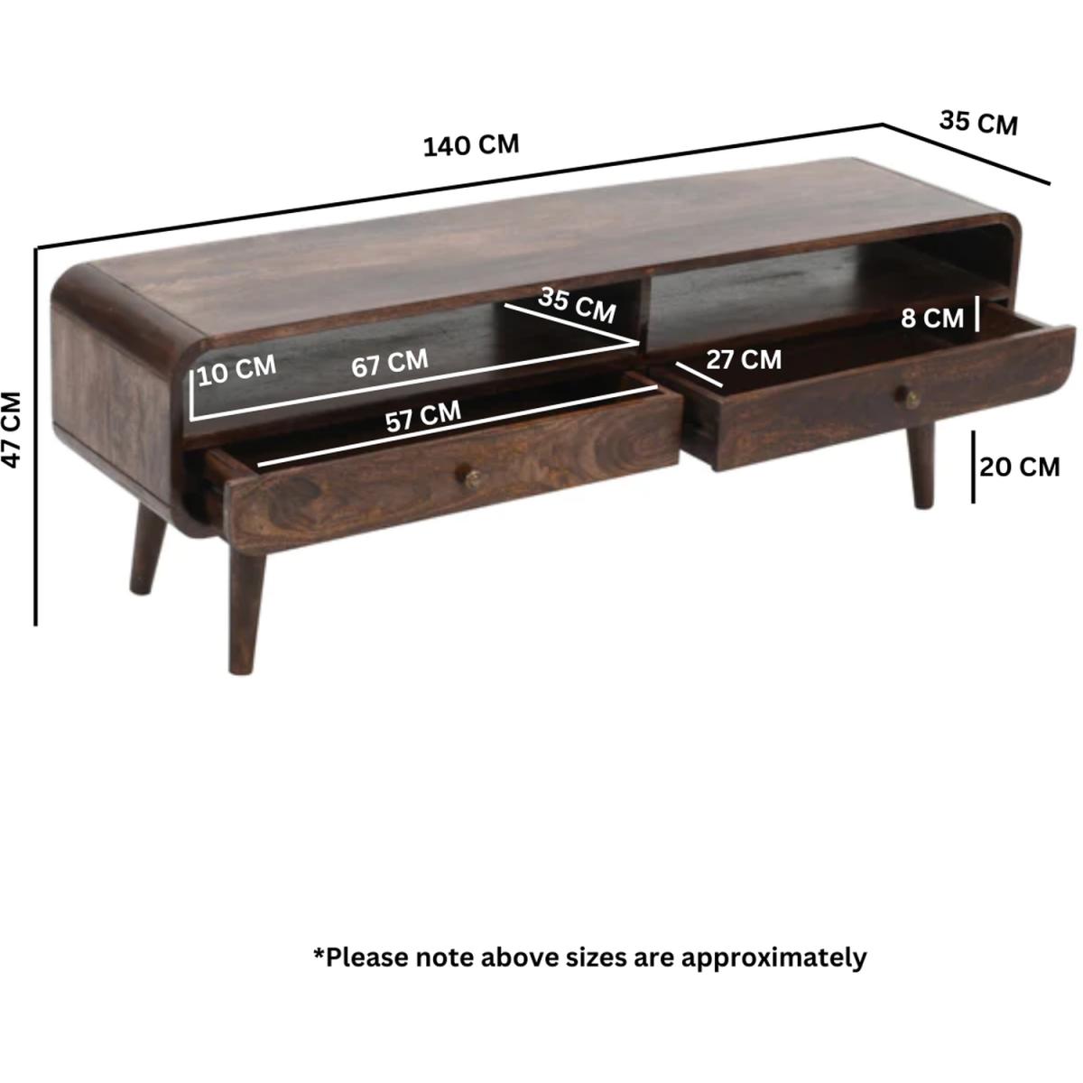 This dark mango TV stand is designed to hold a larger TV and is wider than the alternative smaller version in this range. The style is ageless and will blend in well with any existing decor you may already have. The beautifully crafted rounded edges provide a softer look and feel to this item which also features 2 good sized drawers to store all your remotes, game controllers whilst not in use. The open shelf is ideal for any gaming media equipment you may have. Handmade by skilled craftsmen in India making each piece individual and unique.