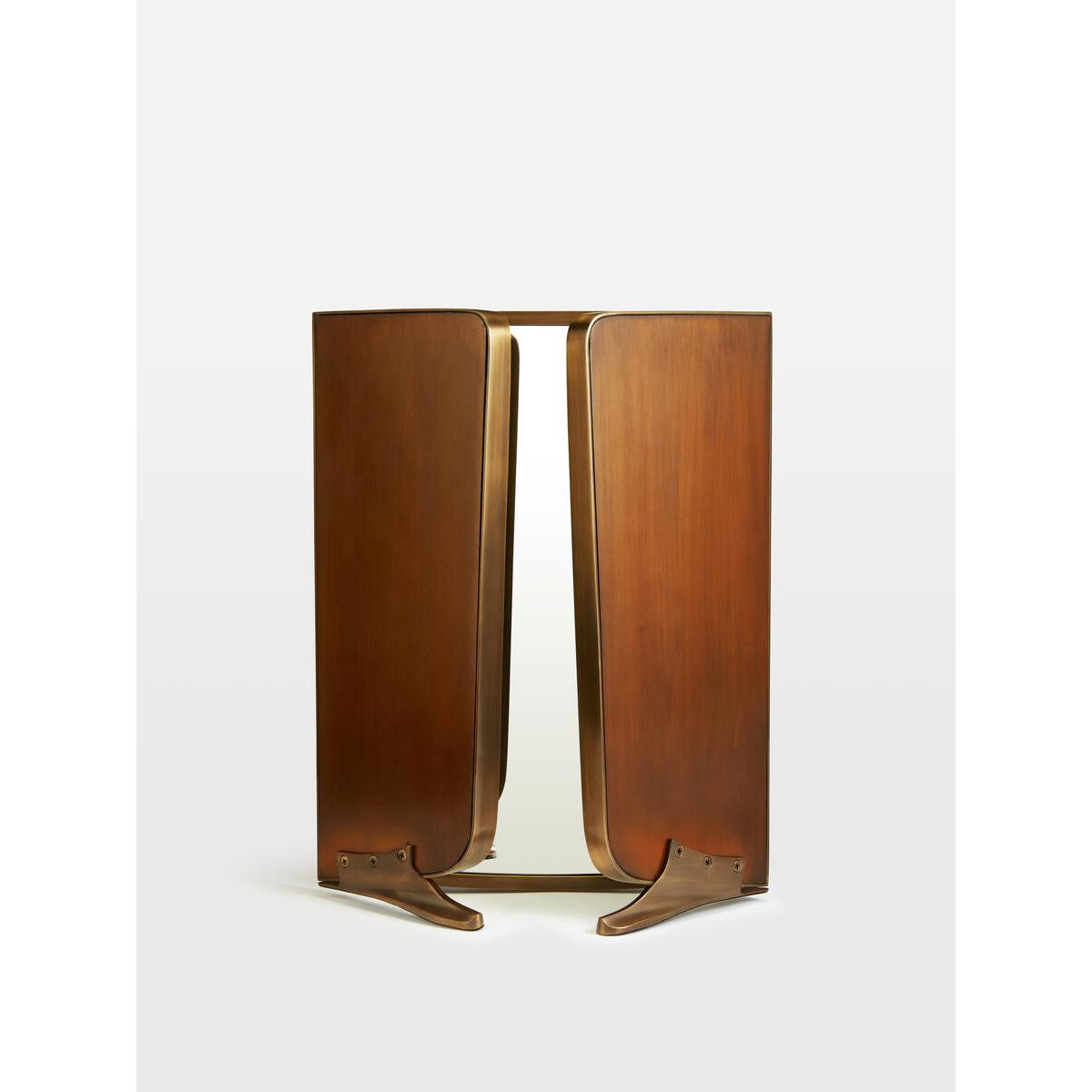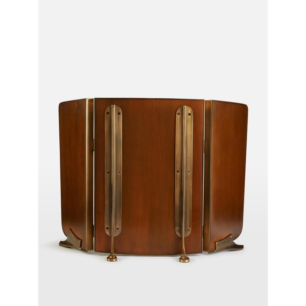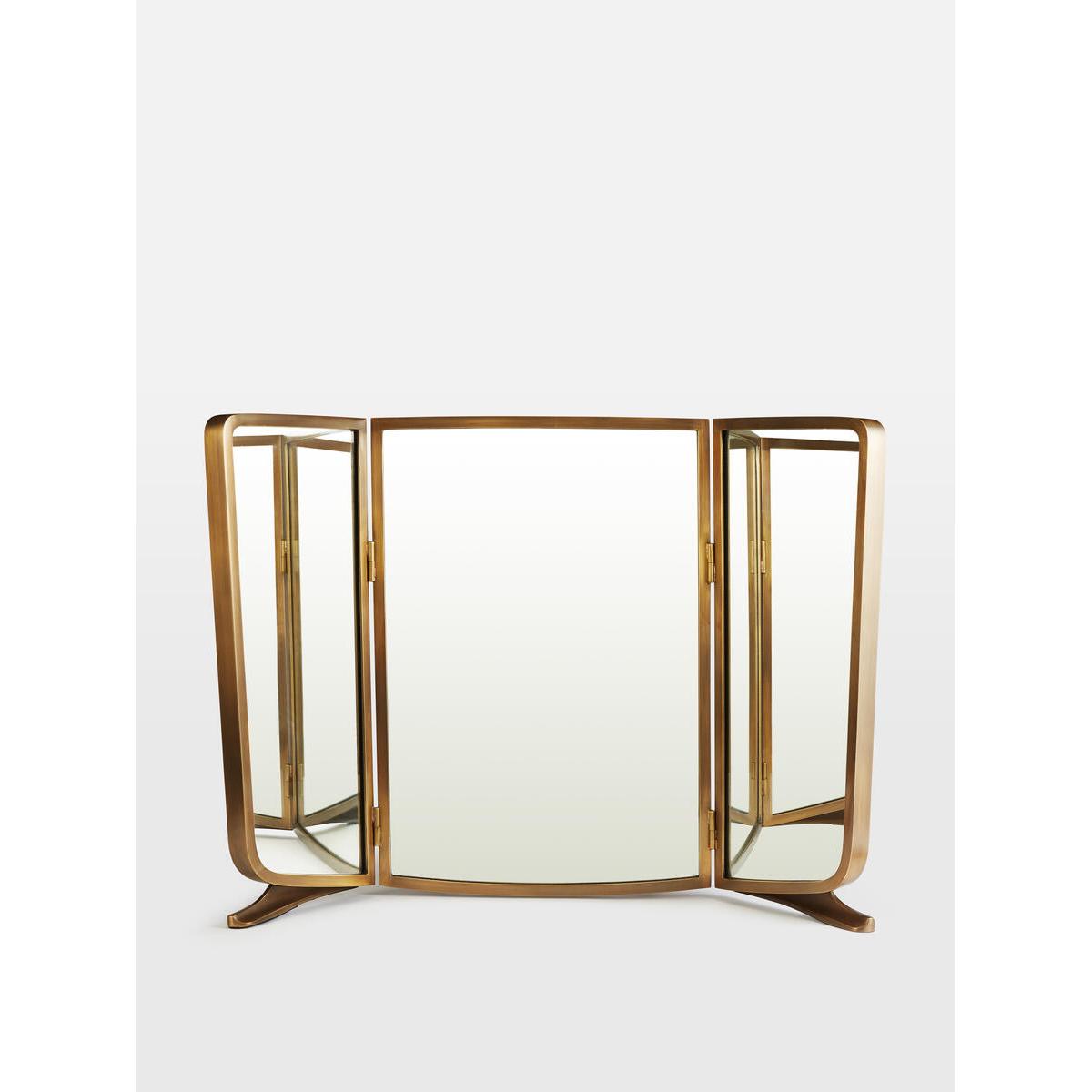 This triptych vanity mirror is constructed from antique brasswith a tapered silhouette that references 1950s styles. Inspired bythe vintage pieces seen at Soho House 76 Dean Street, the mirrorhas two adjustable outer leaves that subtly curve towards thelarger central pane, with brass feet to support. Triptych vanity mirror. Antique brass. Tapered silhouette. 1950s style. Two adjustable outer leaves. Cast brass feet. Inspired by Soho House 76 Dean Street.