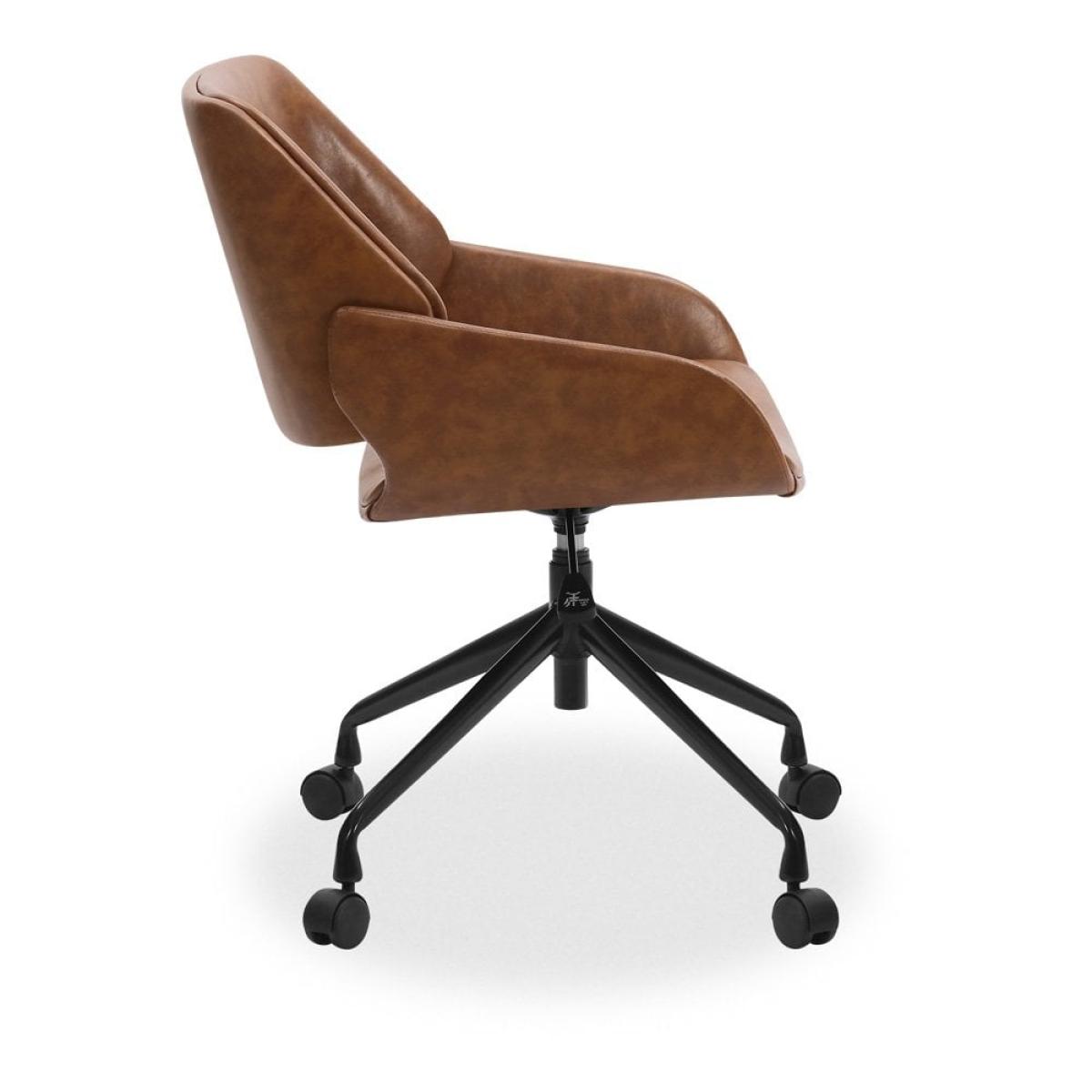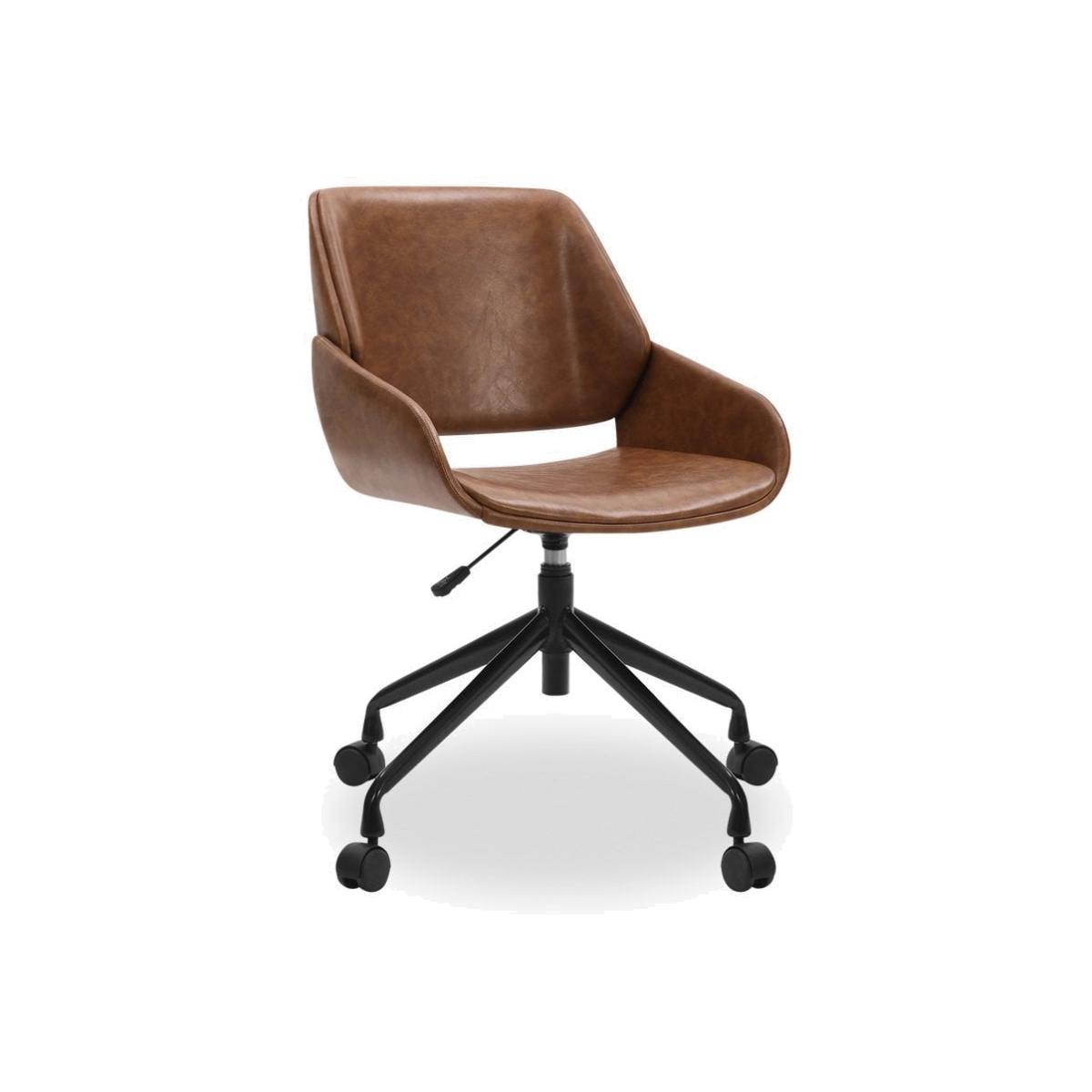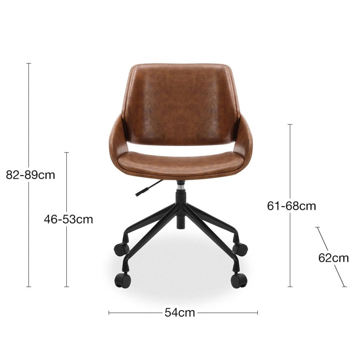 Tan vintage faux leather, height-adjustable and curved armrests, the Franklin is a triple threat when it comes to office chairs. Featuring; a curved backrest, padded seat and a black metal base on wheels - this is a classic style with a soft industrial touch. Working from home has never felt better!