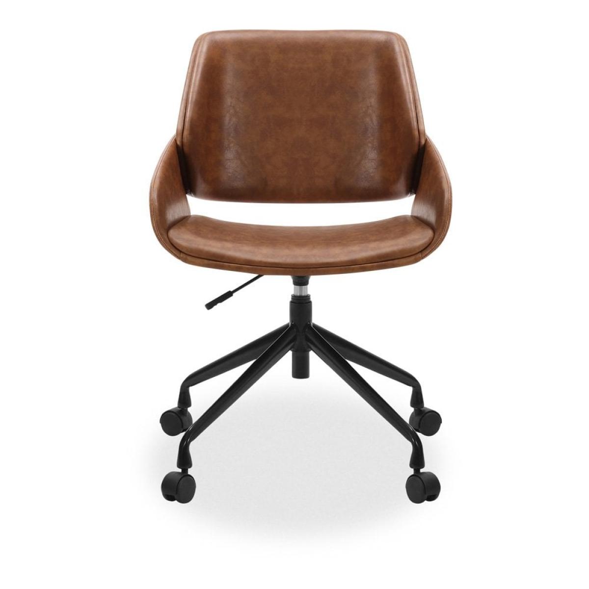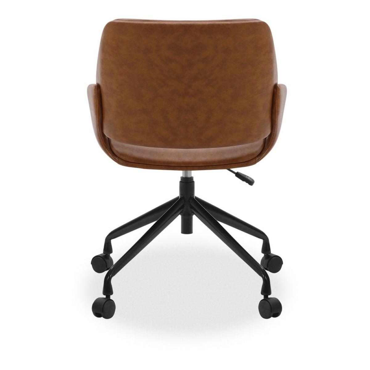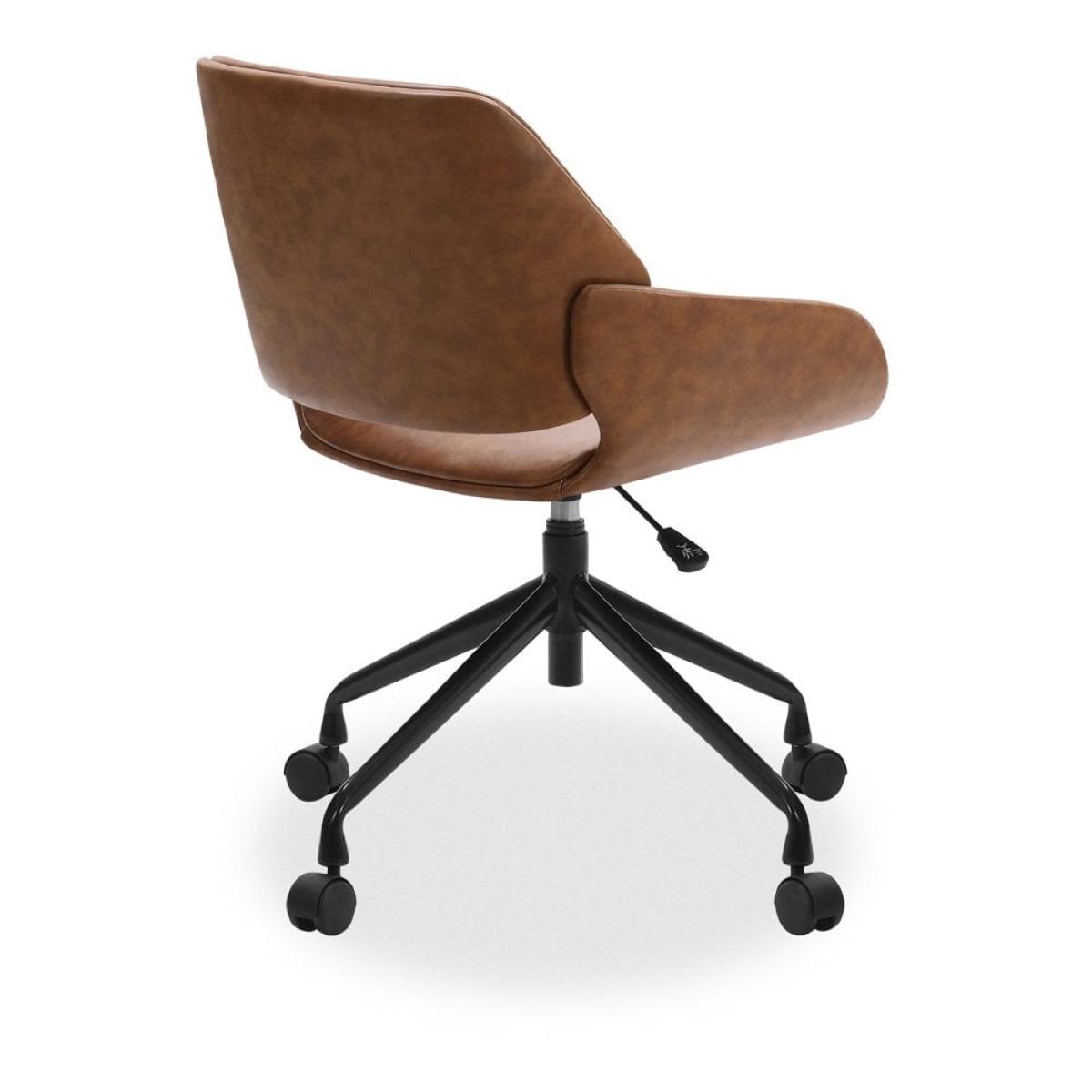 Tan vintage faux leather, height-adjustable and curved armrests, the Franklin is a triple threat when it comes to office chairs. Featuring; a curved backrest, padded seat and a black metal base on wheels - this is a classic style with a soft industrial touch. Working from home has never felt better!