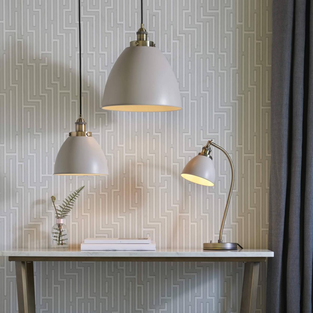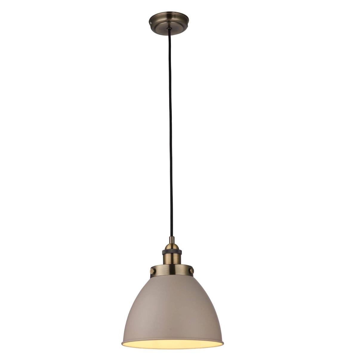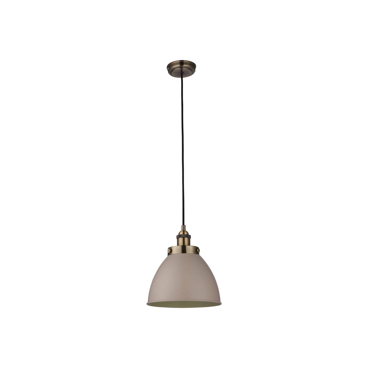 Industrial pendant ceiling light boasting a taupe finish. An elegant addition to your home, this ceiling light is part of the Franklin range from Endon. Dome in shape with a taupe finish, this industrial fitting comes complete with antique brass detailing. The pendant is suspended by a black fabric flex which can be adjusted in height. A beautiful piece sure to look amazing in kitchens, dining rooms and living rooms.