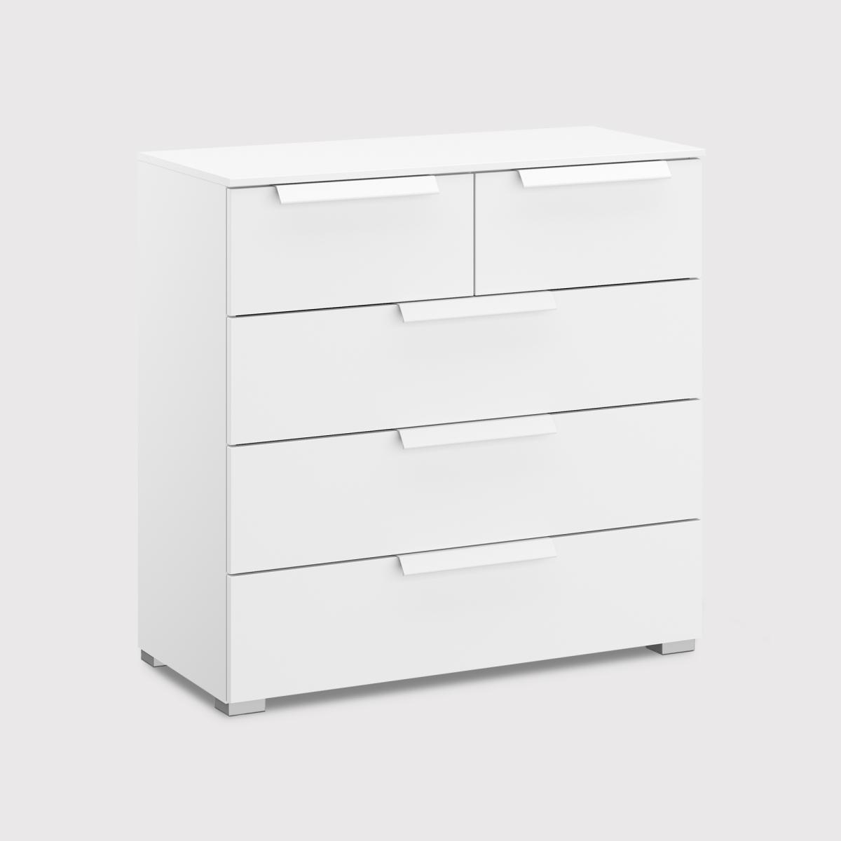 I really like this white five-drawer chest for its clean, modern aesthetic and practicality. It works well in both contemporary and minimalist interiors, offering a fresh and crisp look that can brighten a room. Its sleek design and neutral hue make it versatile enough to pair with various colour schemes and textures. For styling tips, consider using it as a statement piece by layering with some textured accessories on top, like a small decorative tray or a stack of books, while keeping the surface uncluttered. Its ample storage makes it ideal for bedrooms or living spaces where organisation is key, and it can easily blend with wood accents or monochrome palettes to create a cohesive and stylish space.