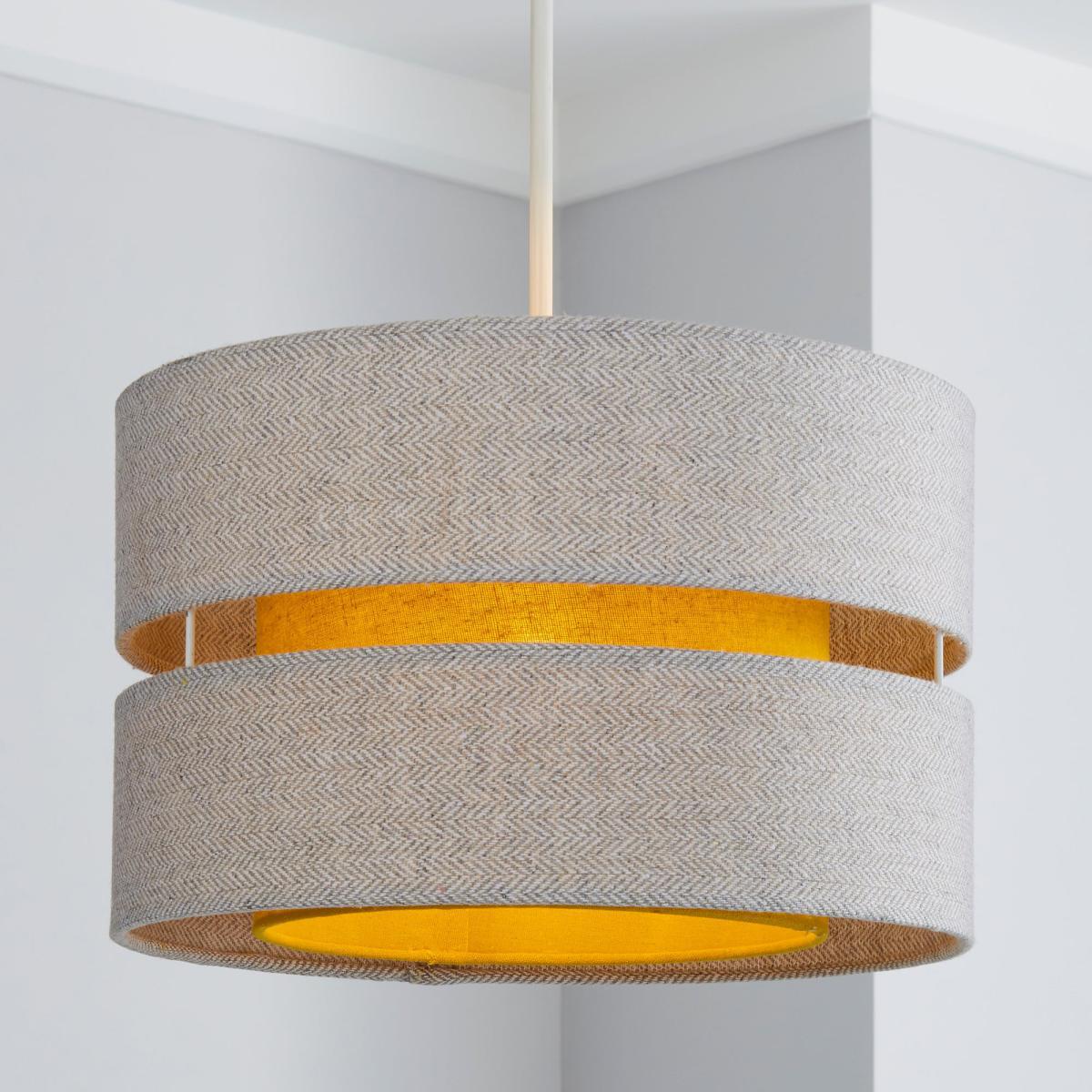 Made with a double tier design, this fabric light shade is crafted from cotton in a bright ochre tone highlighted by a grey tweed texture. This product can be used either as a pendant or as a table lamp shade. Click. Here. To browse our full range of lamp bases to find the perfect match for your lamp shade. Don’t forget your bulb! Click. Here. To view our full range of light bulbs.
