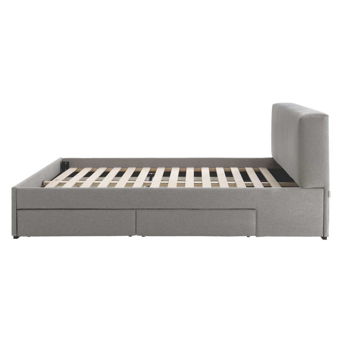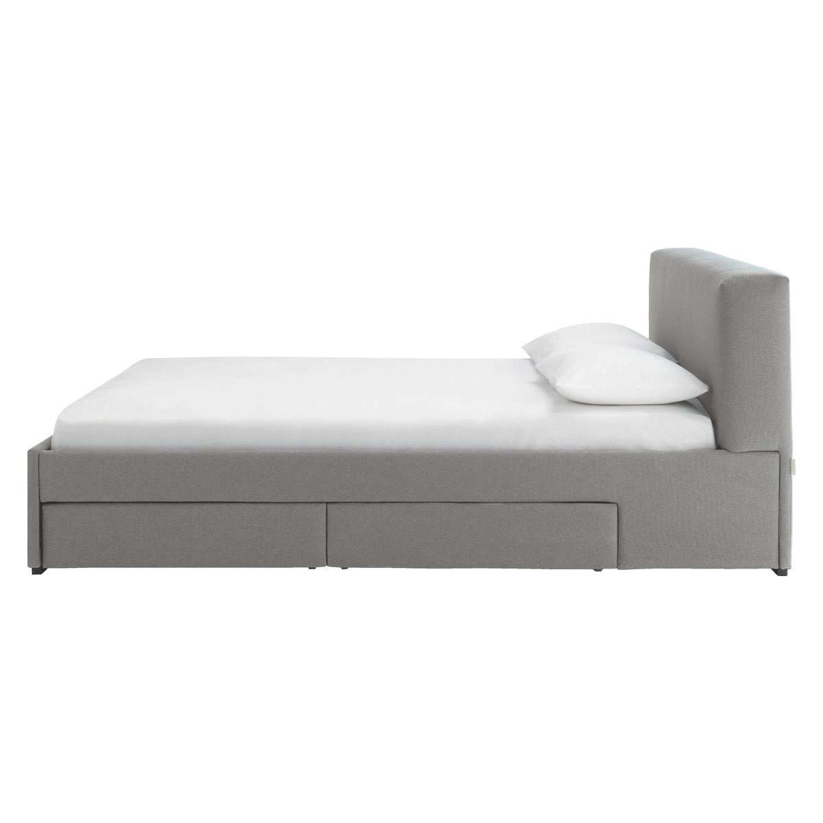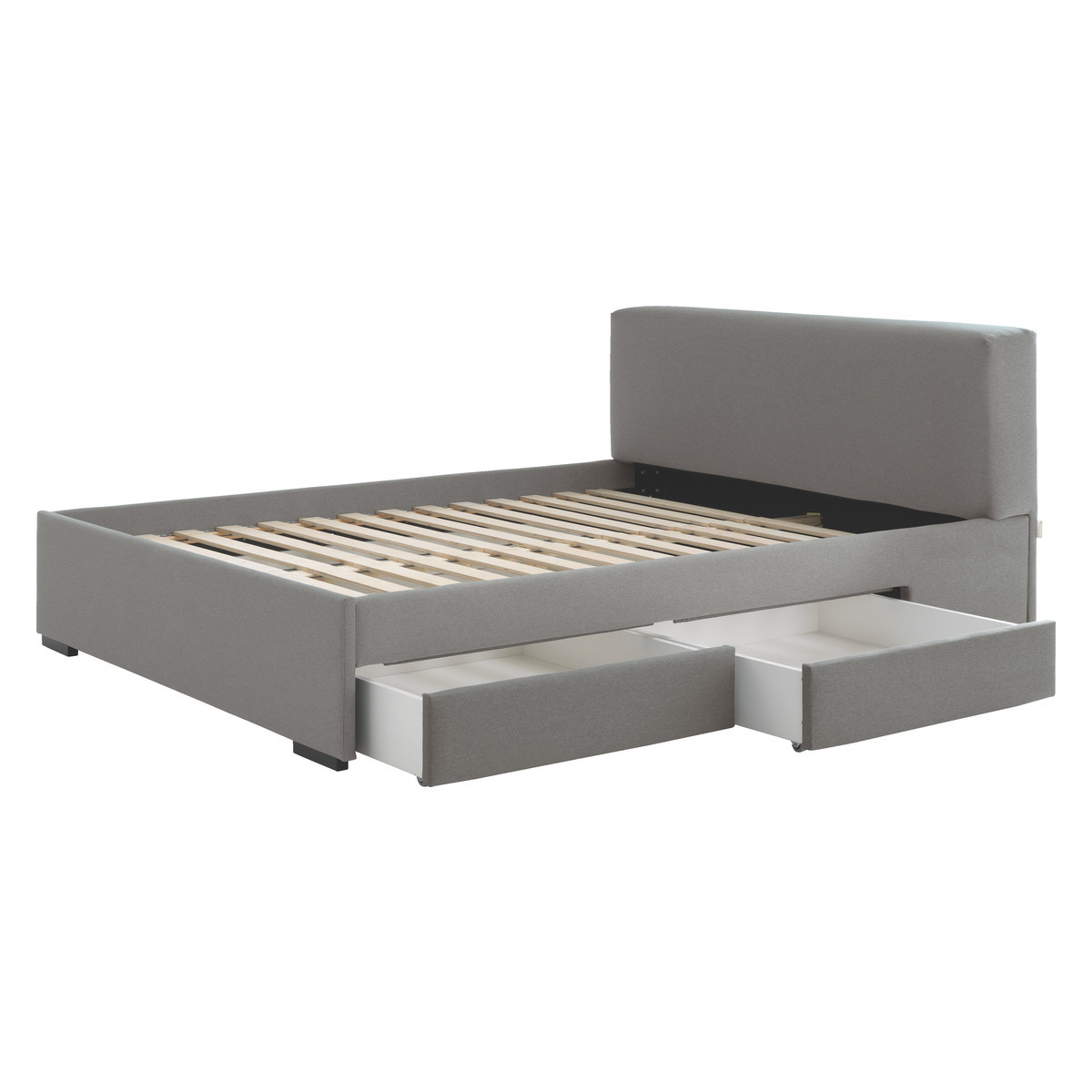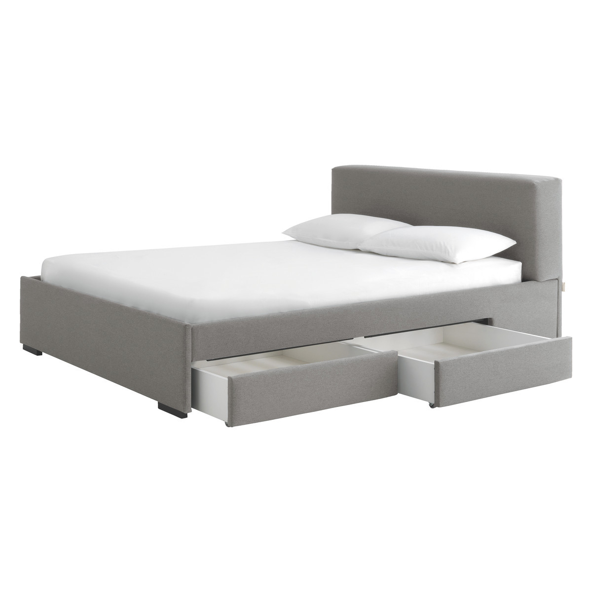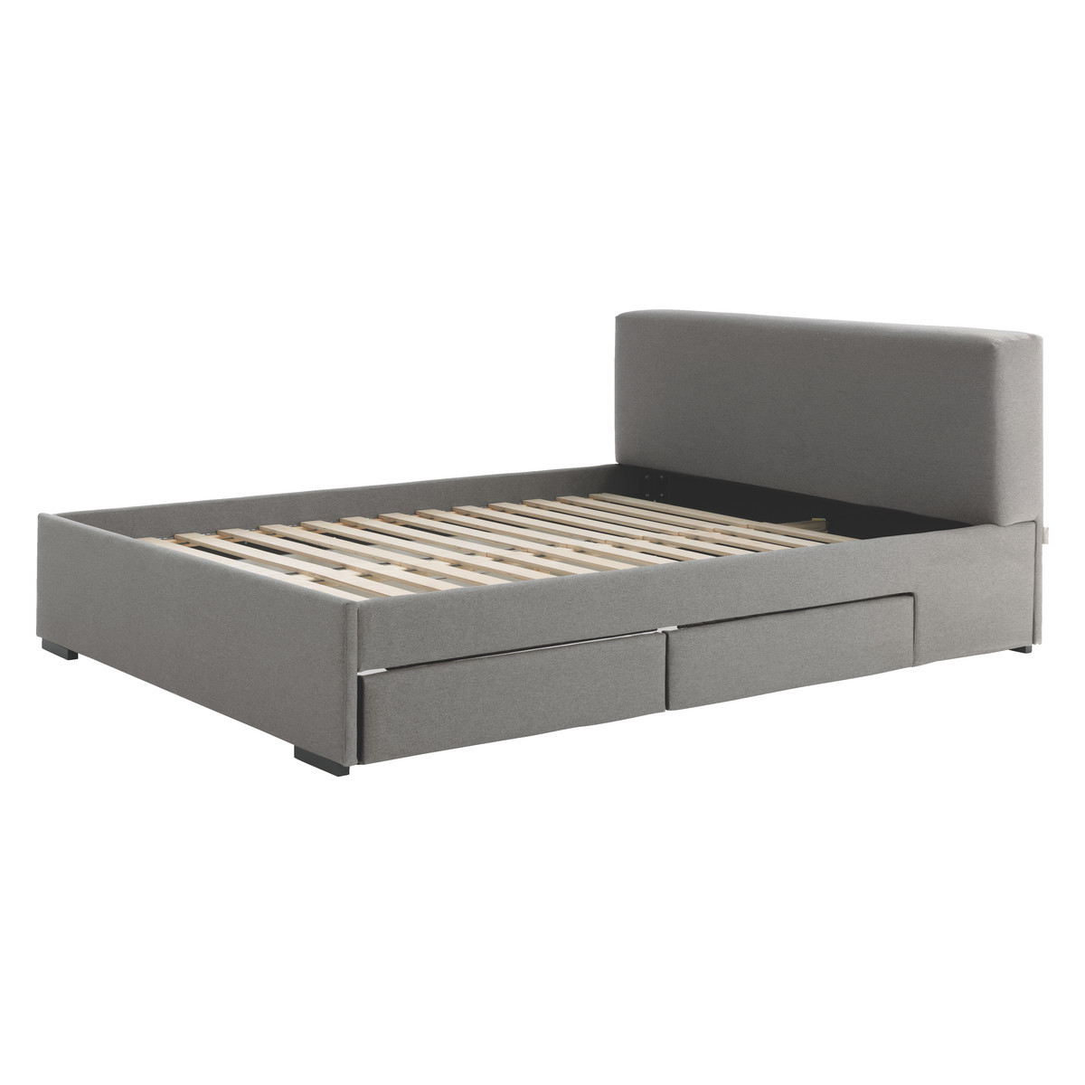 The fabulous Fredd grey upholstered double bed with storage is a minimalist design with a strong shape and a deeply cushioned headboard for added comfort. Designed by and exclusive to Habitat, the Fredd bed has rolled slats and 4 deep drawers. The bed is available in a variety of colours and with and without storage. The Fredd bed will fit a standard UK 135cm double mattress, shop our mattress collection to find a mattress that suits the way you sleep.